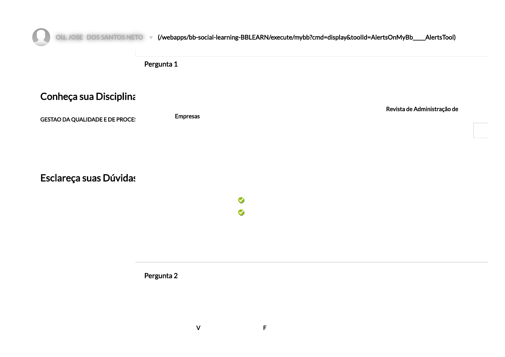 29/09/2020 Blackboard Learn https://fmu.blackboard.com/webapps/late-Course_Landing_Page_Course_100-BBLEARN/Controller 1/4 Minha Área(/) Olá, JOSE DOS SANTOS NETOOlá, JOSE DOS SANTOS NETO (/webapps/bb-social-learning-BBLEARN/execute/mybb?cmd=display&toolId=AlertsOnMyBb_____AlertsTool) Conheça sua Disciplina GESTAO DA QUALIDADE E DE PROCESSOS Esclareça suas Dúvidas > Pergunta 1 Resposta Selecionada: Resposta Correta: Feedback da resposta: Leia excerto a seguir: “O ambiente empresarial, tanto em nível mundial quanto em nacional, tem passado por inúmeras mudanças nos últimos anos, as quais têm sido consideradas diretamente relacionadas com as tecnologias de informação (TI)”. ALBERTIN, A. L. O comércio eletrônico evolui e consolida-se no mercado brasileiro. Revista de Administração de Empresas, v. 40, n. 4, out./dez. 2000, p. 95. Considerando o exposto, avalie as asserções a seguir e a relação proposta entre elas: I. A utilização de sistemas informatizados se tornou essencial no gerenciamento de processos. POIS II. Atualmente, as informações relacionadas aos processos produtivos e de prestação de serviços apresentam grande volume e complexidade. A seguir, assinale a alternativa correta. As asserções I e II são proposições verdadeiras, e a II é uma justi�cativa correta da I. As asserções I e II são proposições verdadeiras, e a II é uma justi�cativa correta da I. Resposta correta. A alternativa está correta, pois as asserções I e II são verdadeiras, e a II é uma justi�cativa adequada da I, visto que o grande volume de informações e o grau de complexidade delas impulsionaram a busca das organizações pela utilização de sistemas informatizados de comunicação e processamento de dados. Pergunta 2 Para que se realize o gerenciamento de processos no século XXI de forma adequada e e�ciente, é necessário que se tenha em mente a necessidade do uso de tecnologias da informação e comunicação (TIC), dada a quantidade de processos e informações existentes no mundo globalizado. Nesse sentido, a respeito do sistema de gerenciamento de processos de negócios (BMPS), avalie as a�rmativas a seguir e assinale V para a(s) verdadeira(s) e F para a(s) falsa(s): 1 em 1 pontos 1 em 1 pontos ATIVIDADE 4 (A4) Voltar à disciplina https://fmu.blackboard.com/ https://fmu.blackboard.com/webapps/login/?action=logout https://fmu.blackboard.com/webapps/bb-social-learning-BBLEARN/execute/mybb?cmd=display&toolId=AlertsOnMyBb_____AlertsTool 29/09/2020 Blackboard Learn https://fmu.blackboard.com/webapps/late-Course_Landing_Page_Course_100-BBLEARN/Controller 2/4 (https://laureatebrasil.blackboard.com/bbcswebdav/institution/laureate/calendario/20202/grad/regular_b1.html) Calendário e Critérios > Avisos + PRAZO FINAL DAS ATIVIDADES AVALIATIVAS (N1) + Material complementar, habilidade da escrita e Normas ABNT + Boas Vindas à nossa disciplina de GESTÃO DA QUALIDADE E DE PROCESSOS + Como o planejamento te conduzirá ao sucesso? + Atente-se para a prorrogação do prazo das atividades avaliativas A1 e A3! Mais antigos... Unidade 1 Conteúdo da unidade > Voltar à disciplina https://laureatebrasil.blackboard.com/bbcswebdav/institution/laureate/calendario/20202/grad/regular_b1.html 29/09/2020 Blackboard Learn https://fmu.blackboard.com/webapps/late-Course_Landing_Page_Course_100-BBLEARN/Controller 3/4 ATIVIDADE 1 (A1) 17/08 - 04/10 Conteúdo da unidade > > ATIVIDADE 2 (A2) 17/08 - 04/10 Unidade 2 Conteúdo da unidade > > ATIVIDADE 3 (A3) 17/08 - 04/10 Unidade 3 Conteúdo da unidade > > Unidade 4 Conteúdo da unidade > Voltar à disciplina 29/09/2020 Blackboard Learn https://fmu.blackboard.com/webapps/late-Course_Landing_Page_Course_100-BBLEARN/Controller 4/4 ATIVIDADE 4 (A4) 17/08 - 04/10 > Bibliotecas Virtuais > Revisão de notas > Minhas Notas > Voltar à disciplina