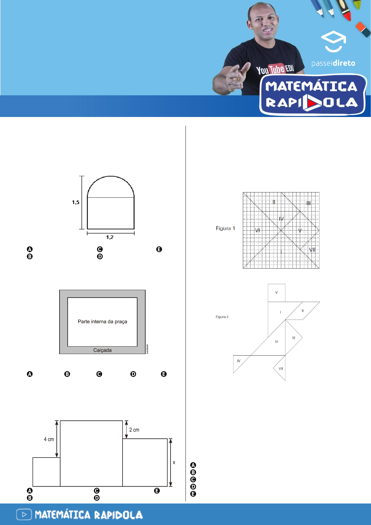 GEOMETRIA 1. Uma janela foi construída com a parte inferior retan- gular e a parte superior no formato de um semicírculo, como mostra a figura a seguir. Se a base da janela mede 1,2 metros e a altura total 1,5 metros, dentre os valores adiante, o que melhor aproxima a área total da janela, em metros quadrados, e: 1,40. 1,85. 2,62. 1,65. 2,21. 2. Uma praça retangular é contornada por uma calçada de 3 m de largura e possui uma parte interna retangular de dimensões 15 m por 12 m, conforme a figura. Nessas condições, a área total da calçada é, em metros quadrados, igual a 108. 128. 156. 165. 198. 3. A soma das áreas de três lotes na forma de quadrados no condomínio Amazon Flora em Benevides perten- cente a região metropolitana de Belém é igual a 56 cm². Qual é a área do quadrado maior? 36 cm2 49 cm2 64 cm2 20 cm2 42 cm2 4. O tangram é um jogo divertido, parecido com um que- bra-cabeças, que envolve polígonos. Ajuda a desenvol- ver a criatividade, pois permite representar uma grande variedade de objetos a partir de poucos polígonos. Não se conhece bem a origem do tangram sabe-se, porém, que é jogado na China há muito tempo. Partindo de um quadrado quadriculado, é possível obter a figura 1 e nela recortar os polígonos de I a VII. Com eles, podem-se compor diversos objetos, como, por exemplo, o “guerreiro” da figura 2: Considere as seguintes proposições sobre o texto: I) O quadrado inicial da figura 1 e o “guerreiro” da figura 2 são equivalentes. II) A área do quadrado inicial da figura 1 é menor que a área do “guerreiro” da figura 2 III) O perímetro do quadrado inicial da figura 1 é menor que o perímetro do “guerreiro” da figura 2. Podemos apontar como correta(s): apenas I. apenas II. apenas I e III. apenas II e III. apenas I e II. 5. A planta de uma residência, apresentada no desenho, a seguir, tem escala 1:120, ou seja, cada medida de 1 cm corresponde a uma medida de 120 cm na dimensão real. Considerando informações e ilustração, acima, só é CORRETO afirmar que a área real da parte ocupada pela cozinha é igual a 65,01 m2. 90,3 m2. 78,56 m2 86,4 m2. 60,0 m2. 6. Uma mesa circular foi empurrada contra a esquina de uma sala retangular de forma que o ponto P da circunfe- rência está a 8 dm de uma parede e a 9 dm da outra, conforme a figura a baixo. Nessa situação, o raio da mesa, em dm, é igual a: 26 29 27 30 28 7. Para determinar a distância de um barco até a praia, um navegante utilizou o seguinte procedimento: a partir de um ponto A, mediu o ângulo visual fazendo mira em um ponto fixo P da praia. Mantendo o barco no mesmo sentido, ele seguiu até um ponto B de modo que fosse possível ver o mesmo ponto P da praia, no entanto sob um ângulo visual 2. A figura ilustra essa situação: Suponha que o navegante tenha medido o ângulo = 30º e, ao chegar ao ponto B, verificou que o barco havia percorrido a distância AB = 2000 m. Com base nesses dados e mantendo a mesma trajetória, a menor distância do barco até o ponto fixo P será: 1000 m 2000 3 m 3 2000 3 m 1000 3 m 2000 m 8. Testes efetuados em um pneu de corrida constata- ram que, a partir de 185.600 voltas, ele passa a se de- teriorar, podendo causar riscos à segurança do piloto. Sabendo que o diâmetro do pneu é de 0,5 m, ele po- derá percorrer, sem riscos para o piloto, aproximada- mente: 93 km. 196 km. 366 km. 592 km. 291 km. 9. Duas hastes retas estão apoiadas em um piso hori- zontal e encostadas uma na outra, com as extremidades se tocando, conforme mostrado na figura abaixo, em que as extremidades das hastes estão indicadas por A, B e C. Considerando que a haste AC mede 1,0 m e faz um ân- gulo de 60º com a horizontal, e que a haste BC mede 1,4 m, qual é a distância entre as extremidades apoiadas no piso, indicadas por A e B, na figura? 1,3m 1,4m 1,5m 1,6m 1,7m 10. Uma área plantada, de forma triangular, contém 3 pontos de abastecimento de água para o processo de irrigação, conforme mostra a figura, cuja escala é de 1:10.000. A distância entre os pontos A e C é, aproxima- damente, igual a Dado: 2 1,41= 0,56 km. 0,78 km. 0,84 km. 0,96 km. 1,84 km. P 9 8 11. Admita que os interiores dos recipientes I e II da figura possuam, respectivamente, as formas de um cilin- dro circular reto e de um cone circular reto, de áreas das bases iguais e alturas iguais. Sabe-se que o recipiente I está com a metade de sua capacidade ocupada por água. Se despejar toda a água do recipiente I no recipiente II, pode-se afirmar que: todo o recipiente II será preenchido e sobrará água correspondente a 1/3 da capacidade do recipiente I. todo o recipiente II será preenchido e sobrará água correspondente a 1/6 da capacidade do recipiente I. faltará água correspondente a 1/6 da capacidade do recipiente I para preencher todo o recipiente II. faltará água correspondente a 1/3 da capacidade do recipiente I para preencher todo o recipiente II. todo o recipiente II será preenchido e não sobrará água no recipiente I. 12. É possível usar água ou comida para atrair as aves e observá-las. Muitas pessoas costumam usar água com açúcar, por exemplo, para atrair beija-flores. Mas é importante saber que, na hora de fazer a mistura, você deve sempre usar uma parte de açúcar para cinco partes de água. Além disso, em dias quentes, precisa trocar a água de duas a três vezes, pois com o calor ela pode fermentar e, se for ingerida pela ave, pode deixá-la do- ente. O excesso de açúcar, ao cristalizar, também pode manter o bico da ave fechado, impedindo-a de se ali- mentar. Isso pode até matá-la. Ciência Hoje das Crianças. FNDE; Instituto Ciência Hoje, Ano 19, n 166, Marc. 1996. Pretende-se encher completamente um copo com a mis- tura para atrair beija-flores. O copo tem o formato cilín- drico, e suas medidas são 10 cm de altura e 4 cm de diâmetro. A quantidade de água que deve ser utilizada na mistura é cerca de (utilize =3) 20 mL. 100 mL. 600 mL. 24