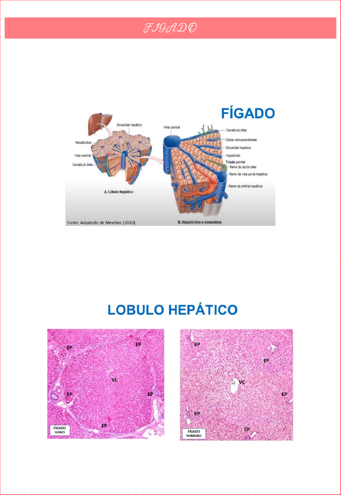 Laura Vieira Gomes de Oliveira – Medicina UNIFG → Histologicamente, o fígado é organizado em vários lóbulos, que lembram hexágonos em que, em cada vértice, ira possui um espaço porta; dessa forma, um lóbulo tem seis espaços portas. → Cada lóbulo é formado por hepatócitos agrupados em forma de placas que são interconectados formando uma massa poligonal de tecidos → Cada placa pode contar em torne de 1 ou mais células de espessura, formando os cordões de células que são circundados pelos sinusoides hepáticos (imagem 2) → o espaço porta (ou tríade portal) é formado o ramo do ducto biliar + um ramo da veia porta hepática + um ramo da artéria hepática; sendo que essas duas ultimas se ramificam em todo o lóbulo, desembocando nos capilares sinusoides, que vão em direção a veia central (ordem de fluxo no fígado) MICROSCOPIA DO LÓBULO HEPÁTICO → em alguns mamíferos não humanos, na microscopia do fígado é possível enxergar as delimitações do lóbulo hepático através da demarcação de tecido conjuntivo (que também passa as ramificações da artéria e da veia da tríade portal); contudo, nos humanos, esse tecido conjuntivo de delimitação é extremamente delicado e incompleto; isso proporciona o contato entre os lóbulos. → o ramo da veia porta tem a parede fina, formado por células endoteliais pavimentosas e ela é bem mais dilatada do que a artéria, contendo uma quantidade considerável de sangue; a artéria hepática é formada por uma camada muscular mais espessa, túnica interna prequeada que não é tão visível; já o ducto biliar é formando por células cuboides com um núcleo bem delimitado e redondo, bastante visível. Laura Vieira Gomes de Oliveira – Medicina UNIFG → na segunda imagem é possível observar os apilares sinusoides emergindo da tríade portal → sinuoides: são capilares dilatados, ramificados e irregulares; além disso (n possível visualizar na imagem), os capilares possuem poros ou fenestras e isso é importante para o metabolismo hepático. Possui células epiteliais descontinuas, possibilitando que o fluxo sanguíneo seja lento. Dessa forma, o sangue e os nutrientes poderão estar em contato com os hepatócitos e realizar sua atividade de maneira bem sucedida. → os sinusoides ainda apresentam as células de Kupffer, que são macrófagos, células nucleadas que participam da nossa resposta imune e encontram-se nos capilares sinusoides – estão em 15% do conteúdo do fígado e são responsáveis por fagocitar corpos estranhos (bactérias e vírus) → Veia central – as células endoteliais são sustentadas por fibras de colágeno que dão resistência a parede da veia; além disso, é possível identificar (seta), os sinusoides desembocando na veia central Laura Vieira Gomes de Oliveira – Medicina UNIFG → hepatócito: são células poliédricas que, uma vez coradas por H&E, possuem um aspecto eosinófilo (pois possui muita quantidade de mitocôndrias e alguns retículos endoplasmáticos lisos que possuem afinidade com esse corante). Possui núcleo bem arredondado e nucléolos. Possui microvilosidades em sua superfície (mas não visíveis). → sua superfície fica em contato com o capilar sinusoide; contudo, esse contato ocorre através de um espaço chamado de “espaço de Disse” em que são encontradas células de Ito, responsáveis por armazenar vitamina A e produção de matriz extracelular, fibra colágeno, reticular (importantes no suporte do fígado) → contato entre dois hepatócitos: formação de um espaço tubular conhecido como canalículo biliar → é no canalículo biliar que a célula vai excretar o conteúdo produzido: a bile → junção de oclusão: interação muito firme entre as membranas, formando a barreira hematobiliar que isola o lumem do canalículo e impedindo que ocorra o escoamento do bile esperando ser drenada para o ducto biliar FLUXO DA BILE → o canalículo biliar, que se encontra na junção de cada hepatócito, vai formando uma rede de ligações que irão formar ductos biliares (ou canais de Hering); esses canais de Hering irão desembocar no ducto biliar, que ira levar a bile para a vesícula biliar Laura Vieira Gomes de Oliveira – Medicina UNIFG → a bile flui progressivamente da região mais próxima da veia central até a periferia do lóbulo; ou seja, todos os hepatócitos vão produzir bile, porém a produção vai iniciar naqueles mais próximos da veia central e, posteriormente, naqueles mais próximos da tríade portal. Além disso, o fluxo segue esse caminho – fluxo centrifugo → esses ductos biliares vão aumentos e se fundindo ate que formem um ducto hepático direito e esquerdo, que coletam a bili de todos os segmentos hepáticos do fígado. Estes dois ductos, então, irão se unir e formar o ducto hepático comum, que se unirá ao ducto cístico e, enfim, a bile vai chegar ao ducto biliar. SUPRIMENTO SANGUÍNEO → ele recebe o sangue de duas fontes diferentes: 75 a 85% do sangue derivam da veia porta, que transporta o sangue pouco oxigenado, rico em nutrientes, provenientes do intestino, do pâncreas e do baço. Enquanto 25 a 20% derivam da artéria hepática que fornece sangue rico em O2. → os vasos da tríade (veia e artéria) se ramificam e circundam todo o lóbulo hepático, se unindo a outros espaços porta. Além disso, essas vênulas e arteríolas desembocam nos capilares sinusoides, que mistura o conteúdo dos dois vasos e leva ate a veia central, passando por todo o lóbulo do fígado → conforme vai recebendo a mistura do sinusoide, a veia central vai aumentando de tamanho e, ao final do lóbulo, ela se funde com a veia sublobular que vão se unindo e formando 2 ou mais veias hepáticas, que desembocam na veia cava inferior → diferente do fluxo da bile, a mistura de sangue tem o fluxo da periferia para o centro do lóbulo (fluxo centrípeto). → através desse fluxo centrípeto, a mistura de sangue contendo nutrientes