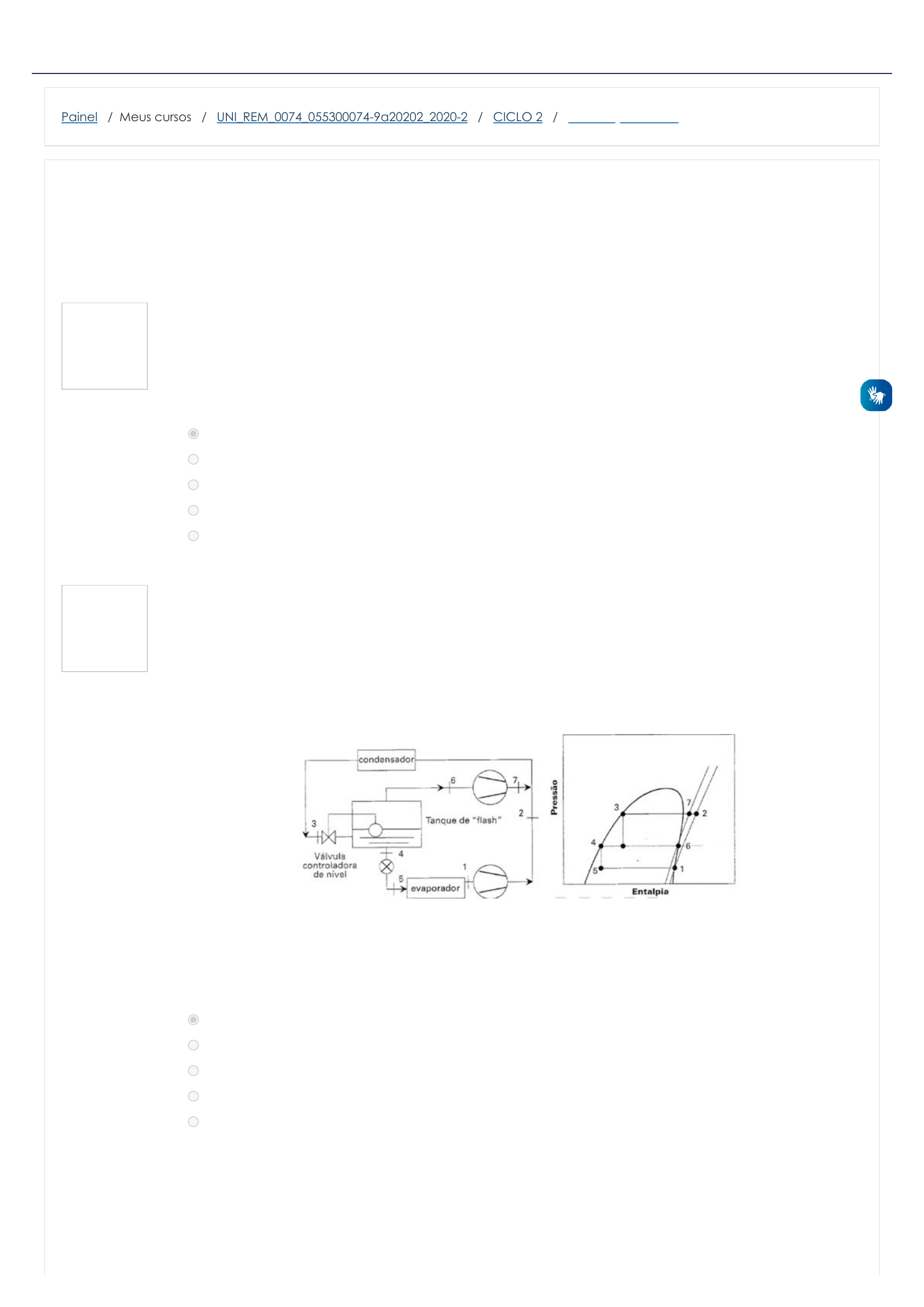 13/11/2020 AVALIAÇÃO 2ª VA: Revisão da tentativa https://avagraduacao.unievangelica.edu.br/disciplinasonline/mod/quiz/review.php?attempt=784270&cmid=139060 1/5 Painel / Meus cursos / UNI_REM_0074_055300074-9a20202_2020-2 / CICLO 2 / AVALIAÇÃO 2ª VA Questão 1 Completo Atingiu 5,00 de 5,00 Questão 2 Completo Atingiu 5,00 de 5,00 Iniciado em sexta, 13 Nov 2020, 20:53 Estado Finalizada Concluída em sexta, 13 Nov 2020, 22:07 Tempo empregado 1 hora 13 minutos Avaliar 50,00 de um máximo de 50,00(100%) Um sistema de 4 dutos de mesmo diâmetro, 2 para insuflar e 2 para captar mecanicamente o ar, será utilizado em um auditório com capacidade de 90 pessoas. Atendendo os limites padrões de ventilação geral, adotou-se 20 m /h como o ar necessário por pessoa. Desprezando-se vazões por fugas e admitindo a velocidade de 20 m/min, cada duto deverá apresentar diâmetro, em m, de aproximadamente, Escolha uma: a. 1,0 b. 7,5 c. 1,4 d. 5,4 e. 0,7 3 Nos processos de compressão do fluido refrigerante, é instalado um dispositivo denominado por “ tanque de remoção do gás de flash”. Em relação às vantagens da utilização deste dispositivo analise abaixo as afirmações: I. Redução da potência de compressão para uma mesma capacidade frigorífica II. Menor capacidade do compressor principal (vazão menor, menos líquido refrigerante) III.Menor perda de carga nos trocadores de calor e nas tubulações. Está correto o que se afirma em: Escolha uma: a. I,II e III b. I , apenas c. I e III, apenas d. II e III, apenas e. I e II, apenas https://avagraduacao.unievangelica.edu.br/disciplinasonline/my/ https://avagraduacao.unievangelica.edu.br/disciplinasonline/course/view.php?id=3092 https://avagraduacao.unievangelica.edu.br/disciplinasonline/course/view.php?id=3092§ion=4 https://avagraduacao.unievangelica.edu.br/disciplinasonline/mod/quiz/view.php?id=139060 13/11/2020 AVALIAÇÃO 2ª VA: Revisão da tentativa https://avagraduacao.unievangelica.edu.br/disciplinasonline/mod/quiz/review.php?attempt=784270&cmid=139060 2/5 Questão 3 Completo Atingiu 5,00 de 5,00 Questão 4 Completo Atingiu 5,00 de 5,00 Um ciclo de refrigeração que opera conforme a figura abaixo possui um coeficiente de desempenho de 2, e o valor de Q é 480 kJ. Qual o valor, em kJ, de Q ? Escolha uma: a. 180 b. 456 c. 248 d. 320 e. 570 sai entra Uma grande parcela de instalações frigoríficas industrias operam com diferenças entre 50 e 80°C entre as temperaturas de evaporação e condensação o que acarreta problemas operacionais com soluções não tão triviais. A relação de compressão a ser vencida pelo compressor atinge valores tais que é aconselhável uso da compressão por estágios. Em relação aos processos de compressão multiestágios, avalie as afirmações as seguir: I. A relação de compressão elevada reduz o rendimento volumétrico do compressor II. Altas taxas de compressão aumentam a temperatura de descarga, corrosão de válvulas, carbonização do óleo e até perigo de explosão III. O processo de compressão realizado em múltiplos estágios reduz a potência consumida e a temperatura de descarga do fluido quando comparada à realizada em estágio único Está correto o que se afirma em: Escolha uma: a. I e III, apenas b. II e III, apenas c. II, apenas d. I, II e III e. I e II, apenas https://avagraduacao.unievangelica.edu.br/disciplinasonline/mod/url/view.php?id=335713 13/11/2020 AVALIAÇÃO 2ª VA: Revisão da tentativa https://avagraduacao.unievangelica.edu.br/disciplinasonline/mod/quiz/review.php?attempt=784270&cmid=139060 3/5 Questão 5 Completo Atingiu 5,00 de 5,00 Questão 6 Completo Atingiu 5,00 de 5,00 Um pesquisador de engenharia afirma ter criado uma unidade de refrigeração, com coeficiente de desempenho de 5,5, capaz de manter um espaço refrigerado a -33 ºC, enquanto o ambiente externo está a 7 ºC. Teoricamente, a invenção deste pesquisador é: Escolha uma: a. possível, uma vez que o coeficiente de desempenho de um refrigerador de Carnot, nas mesmas condições, é dado por 7,0. b. possível, uma vez que o coeficiente de desempenho de um refrigerador de Carnot, nas mesmas condições, é dado por 1,2. c. impossível, uma vez que tal máquina possui desempenho menor do que o desempenho de um refrigerador de Carnot nas mesmas condições d. possível, uma vez que o coeficiente de desempenho de um refrigerador de Carnot, nas mesmas condições, é dado por 6,0. e. impossível, uma vez que tal máquina possui desempenho maior do que o desempenho de um refrigerador de Carnot nas mesmas condições. Na figura abaixo , estão ilustrados o ciclo ideal de refrigeração por compressão de vapor e o ciclo de Carnot.O processo do ciclo ideal de refrigeração por compressão de vapor, em que calor é rejeitado à pressão constante, é o Escolha uma: a. 1'-2' b. 3-4 c. 4-1 d. 1-2 e. 2-3 13/11/2020 AVALIAÇÃO 2ª VA: Revisão da tentativa https://avagraduacao.unievangelica.edu.br/disciplinasonline/mod/quiz/review.php?attempt=784270&cmid=139060 4/5 Questão 7 Completo Atingiu 5,00 de 5,00 Questão 8 Completo Atingiu 5,00 de 5,00 A figura I acima ilustra, esquematicamente, um sistema de condicionamento de ar para a climatização de conforto de um ambiente, com componentes A, B, C e D que processam o ar; a figura II mostra a carta psicrométrica dos processos envolvidos na operação desse sistema. Com base nessas informações, julgue os itens que se seguem: I-O processo 2-3 representa resfriamento e desumidificação do ar que, tipicamente, ocorre durante a troca simultânea de calor e massa em serpentinas de evaporação direta ou indireta com aumento da umidade relativa do ar. II-Na figura I, o componente A está associado à mistura entre as correntes de ar recirculado e de renovação. Esse processo é representado na carta psicrométrica pela linha que une os pontos 1, 2 e 5, sendo o ponto 2 a condição de mistura. III- O duto que conecta o componente C ao ambiente deve ser