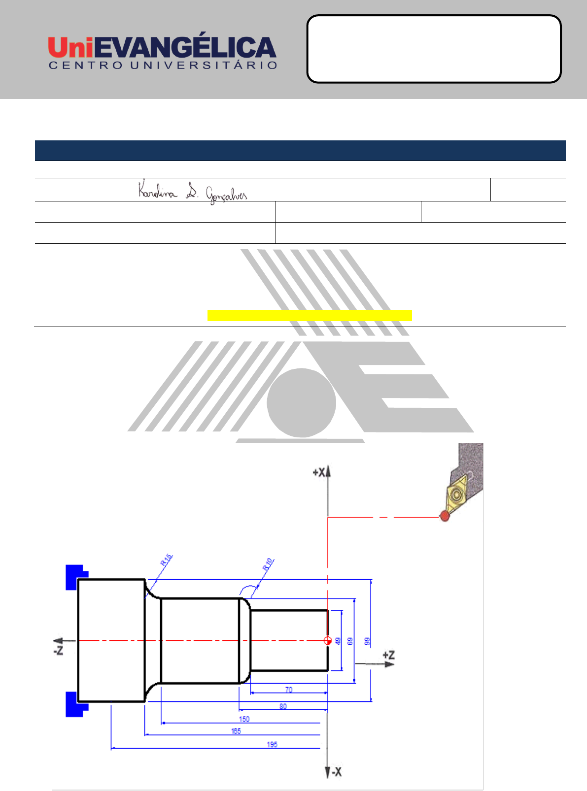 3ª LISTA DE EXERCÍCIOS 1ª VA CURSO DE ENGENHARIA MECÂNICA Disciplina: FABRICAÇÃO ASSISTIDA POR COMPUTADOR Professor(a): Me. Márcio José Dias Nome do(a) Acadêmico(a): Data: 1ª Verificação de Aprendizagem Nota: Visto: Valor da avaliação: Vide plano de ensino Valor de cada questão/item: Vide plano de ensino Instruções: Entregar no dia da prova de 1ª VA (17/09/2019), e será recolhida antes do início da prova; Esta lista de exercícios, conforme orientações do Plano de Ensino, fará parte da formatação da 1ª VA; A resolução dos exercícios deve ser ESCRITA À MÃO em folha de formato A4 e de forma organizada, E DEVERÁ SER UTILIZADO A FORMATAÇÃO DESSE MATERIAL (ou seja, não será aceito resolução em páginas avulsas). 1) Dado o desenho do perfil de uma peça (abaixo) desenvolva a programação, considerando que a peça será usinada utilizando-se: - Funções: G00, G01, G02, G03; - O desbaste da peça poderá ser feitos com passes de até 5 mm; - O desbaste e o acabamento deverão ser feitos com ferramentas DIFERENTES; - Considere ponto de troca da ferramenta na posição de X e Z em 200mm. 22/09/2020 Centro Universitário de Anápolis - UniEVANGÉLICA Avenida Universitária, km. 3,5 – Cidade Universitária – Anápolis - GO – CEP: 75.083-515 – Fone: (62) 3310 6600 – www.unievangelica.edu.br “...grandes coisas fez o Senhor por nós, por isso estamos alegres.” Sl 126,3 Tabela de Programação Nº da linha Programação Nº da linha Programação N 10 N 290 N 20 N 300 N 30 N 310 N 40 N 320 N 50 N 330 N 60 N 340 N 70 N 350 N 80 N 360 N 90 N 370 N 100 N 380 N 110 N 390 N 120 N 400 N 130 N 410 N 140 N 420 N 150 N 430 N 160 N 440 N 170 N 450 N 180 N 460 N 190 N 470 N 200 N 480 N 210 N 490 N 220 N 500 N 230 N 510 N 240 N 520 N 250 N 530 N 260 N 540 N 270 N 550 N 280 N 560 Bom Trabalho!!! Karolina S.Gonçalves Carimbo Karolina S.Gonçalves Carimbo Karolina S.Gonçalves Carimbo Karolina S.Gonçalves Carimbo Karolina S.Gonçalves Carimbo Karolina S.Gonçalves Carimbo Karolina S.Gonçalves Carimbo Karolina S.Gonçalves Carimbo Karolina S.Gonçalves Carimbo Karolina S.Gonçalves Carimbo Karolina S.Gonçalves Carimbo Karolina S.Gonçalves Carimbo Karolina S.Gonçalves Carimbo Karolina S.Gonçalves Carimbo Karolina S.Gonçalves Carimbo Karolina S.Gonçalves Carimbo Karolina S.Gonçalves Carimbo Karolina S.Gonçalves Carimbo Karolina S.Gonçalves Carimbo Karolina S.Gonçalves Carimbo Karolina S.Gonçalves Carimbo Karolina S.Gonçalves Carimbo Karolina S.Gonçalves Carimbo Karolina S.Gonçalves Carimbo Karolina S.Gonçalves Carimbo Karolina S.Gonçalves Carimbo Karolina S.Gonçalves Carimbo Karolina S.Gonçalves Carimbo Karolina S.Gonçalves Carimbo Karolina S.Gonçalves Carimbo Karolina S.Gonçalves Carimbo Karolina S.Gonçalves Carimbo Karolina S.Gonçalves Carimbo Karolina S.Gonçalves Carimbo Karolina S.Gonçalves Carimbo Karolina S.Gonçalves Carimbo Karolina S.Gonçalves Carimbo Karolina S.Gonçalves Carimbo Karolina S.Gonçalves Carimbo Karolina S.Gonçalves Carimbo Karolina S.Gonçalves Carimbo Karolina S.Gonçalves Carimbo Karolina S.Gonçalves Carimbo Karolina S.Gonçalves Carimbo Karolina S.Gonçalves Carimbo Karolina S.Gonçalves Carimbo Karolina S.Gonçalves Carimbo Karolina S.Gonçalves Carimbo Karolina S.Gonçalves Carimbo Karolina S.Gonçalves Carimbo Karolina S.Gonçalves Carimbo Karolina S.Gonçalves Carimbo Karolina S.Gonçalves Carimbo Karolina S.Gonçalves Carimbo Karolina S.Gonçalves Carimbo Karolina S.Gonçalves Carimbo