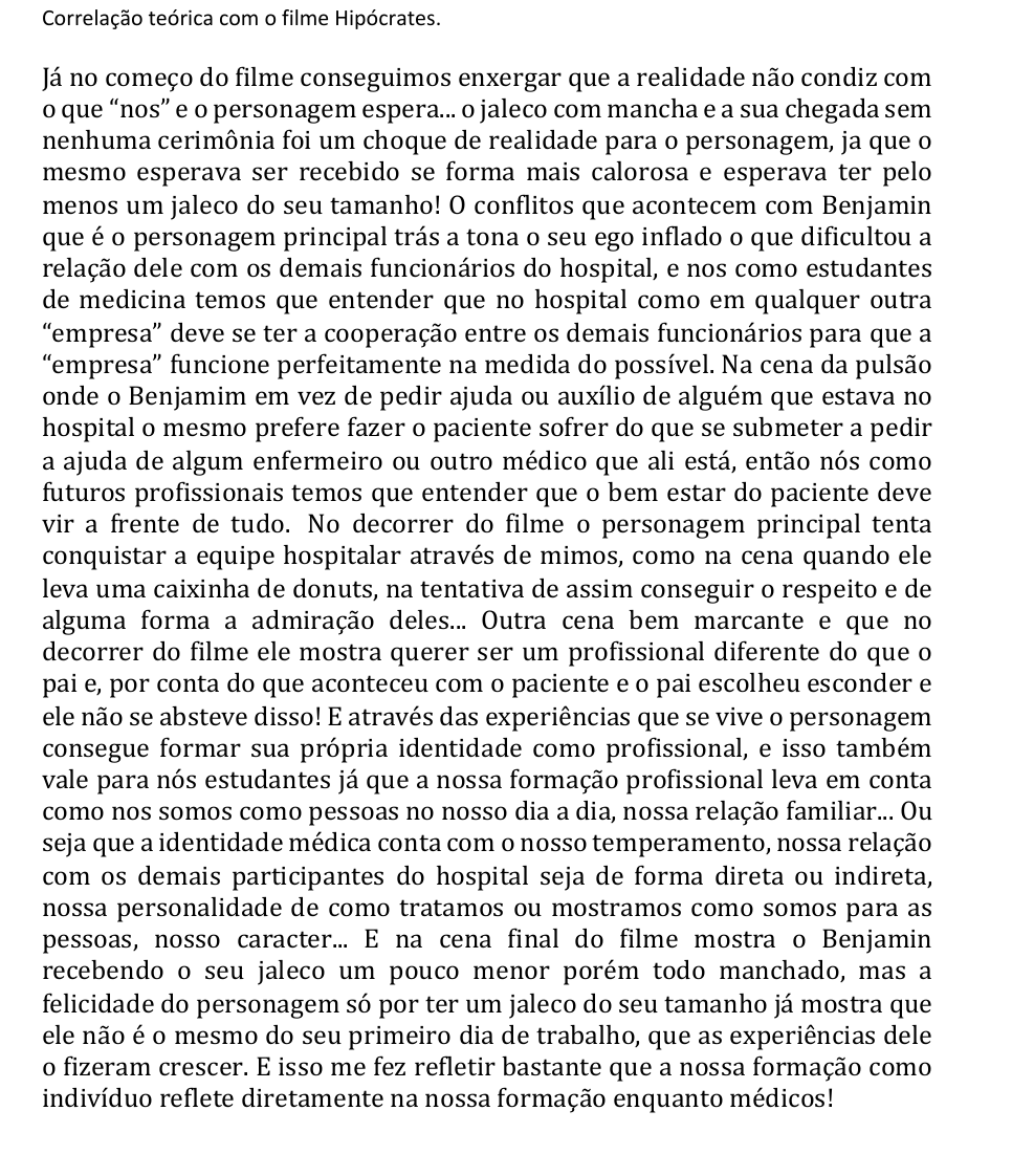 Correlação teórica com o filme Hipócrates. Já no começo do filme conseguimos enxergar que a realidade não condiz com o que “nos” e o personagem espera... o jaleco com mancha e a sua chegada sem nenhuma cerimônia foi um choque de realidade para o personagem, ja que o mesmo esperava ser recebido se forma mais calorosa e esperava ter pelo menos um jaleco do seu tamanho! O conflitos que acontecem com Benjamin que é o personagem principal trás a tona o seu ego inflado o que dificultou a relação dele com os demais funcionários do hospital, e nos como estudantes de medicina temos que entender que no hospital como em qualquer outra “empresa” deve se ter a cooperação entre os demais funcionários para que a “empresa” funcione perfeitamente na medida do possível. Na cena da pulsão onde o Benjamim em vez de pedir ajuda ou auxílio de alguém que estava no hospital o mesmo prefere fazer o paciente sofrer do que se submeter a pedir a ajuda de algum enfermeiro ou outro médico que ali está, então nós como futuros profissionais temos que entender que o bem estar do paciente deve vir a frente de tudo. No decorrer do filme o personagem principal tenta conquistar a equipe hospitalar através de mimos, como na cena quando ele leva uma caixinha de donuts, na tentativa de assim conseguir o respeito e de alguma forma a admiração deles... Outra cena bem marcante e que no decorrer do filme ele mostra querer ser um profissional diferente do que o pai e, por conta do que aconteceu com o paciente e o pai escolheu esconder e ele não se absteve disso! E através das experiências que se vive o personagem consegue formar sua própria identidade como profissional, e isso também vale para nós estudantes já que a nossa formação profissional leva em conta como nos somos como pessoas no nosso dia a dia, nossa relação familiar... Ou seja que a identidade médica conta com o nosso temperamento, nossa relação com os demais participantes do hospital seja de forma direta ou indireta, nossa personalidade de como tratamos ou mostramos como somos para as pessoas, nosso caracter... E na cena final do filme mostra o Benjamin recebendo o seu jaleco um pouco menor porém todo manchado, mas a felicidade do personagem só por ter um jaleco do seu tamanho já mostra que ele não é o mesmo do seu primeiro dia de trabalho, que as experiências dele o fizeram crescer. E isso me fez refletir bastante que a nossa formação como indivíduo reflete diretamente na nossa formação enquanto médicos!