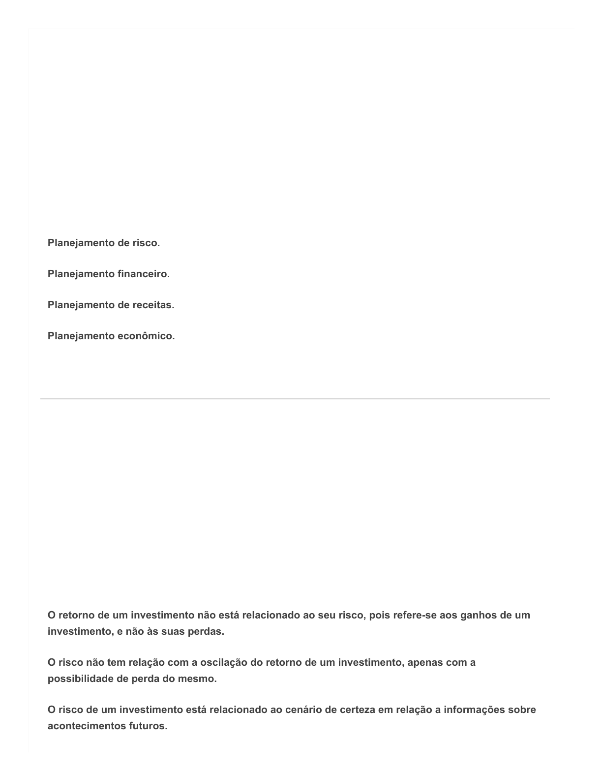 23/11/2020 Ultra https://sereduc.blackboard.com/ultra/courses/_36803_1/grades/assessment/_2946820_1/overview/attempt/_9813610_1/review?courseId=_36803_1 1/1 Ocultar opções de resposta Ocultar opções de resposta Pergunta 1 -- /0,6 O _________________ consiste na elaboração das estimativas de investimentos, principalmente imobilizado, que serão utilizados para a geração de receitas futuras, portanto, precisam ser depreciados ou amortizados. Preenche os espaço em branco: Planejamento de risco. Planejamento financeiro. Planejamento de receitas. Planejamento econômico. Resposta corretaPlanejamento de capital. Pergunta 2 -- /0,6 Em relação ao tema “risco e retorno”, assinale a alternativa correta. O retorno de um investimento não está relacionado ao seu risco, pois refere-se aos ganhos de um investimento, e não às suas perdas. O risco não tem relação com a oscilação do retorno de um investimento, apenas com a possibilidade de perda do mesmo. O risco de um investimento está relacionado ao cenário de certeza em relação a informações sobre acontecimentos futuros. https://ultra.content.blackboardcdn.com/ultra/uiv3900.0.0-rel.18_14f302e#