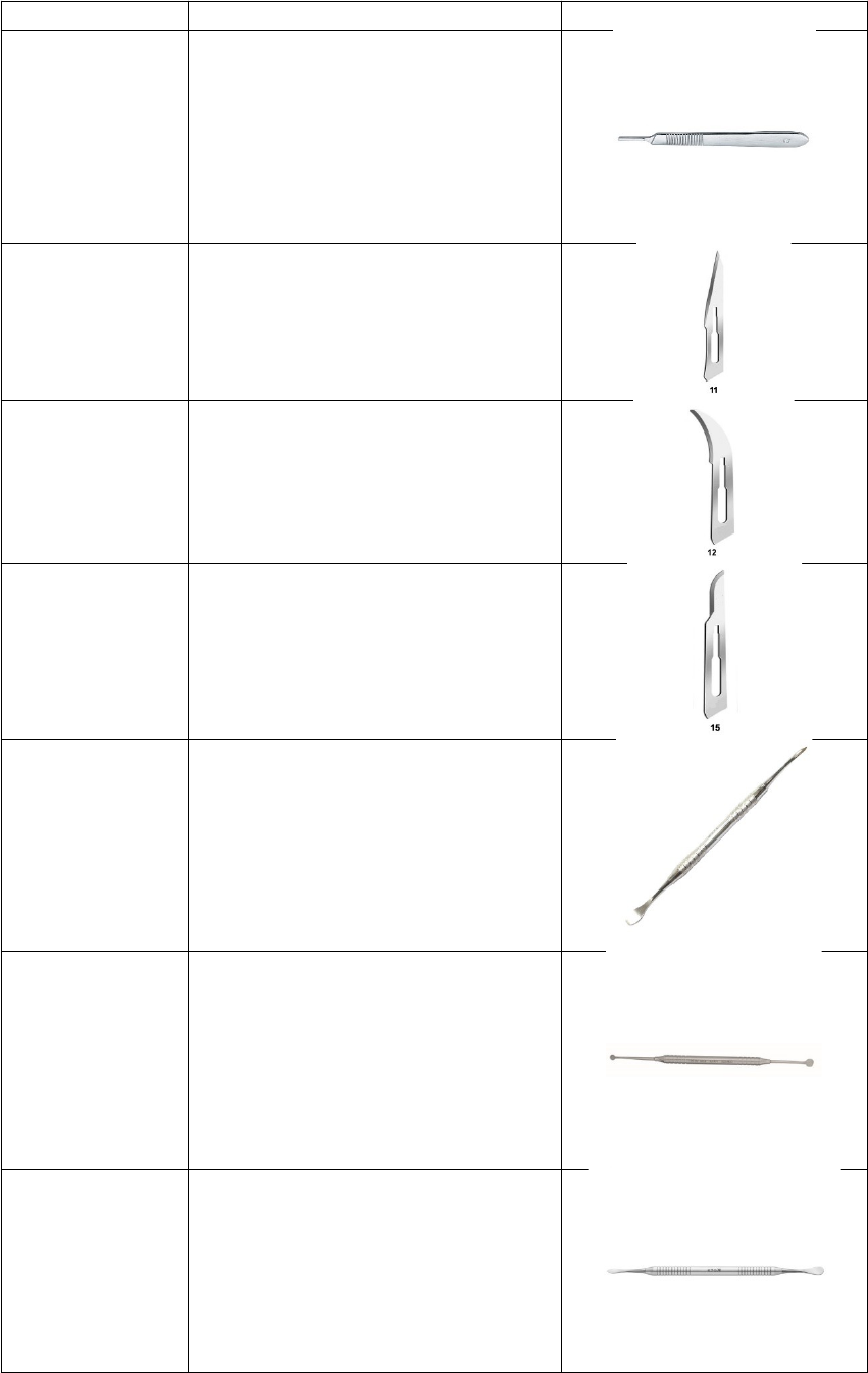 PROVA PRÁTICA DE CIRURGIA NOME FUNÇÃO IMAGEM Cabo de bisturi n°3 Receber lâminas menores; destinado a incisões mais críticas, delicadas. Lâmina n°11 Utilizada para perfurações, drenagens de abscessos. Lâmina n°12 Utilizada para incisões de difícil acesso, como a distal de últimos molares. Lâmina n°15 Utilizadas para incisões lineares em superfície de fácil acesso, como incisões intrasulculares e interpapilares. Descolador de Molt n° 9 Utilizado para sindesmotomia, rebatimento de retalho. Descolador de Molt n°2-4 Utilizado para sindesmotomia, rebatimento de retalho. Espátula 7 Utilizado para sindesmotomia, rebatimento de retalho. Tesoura Íris Reta Tesoura de ponta fina utilizada na remoção de sutura. Tesoura Íris Curva Tesoura de ponta fina utilizada na remoção de sutura. Tesoura Metzenbaum Reta Tesoura de ponta romba destinada a divulsão e corte do fio de sutura. Tesoura Metzenbaum Curva Tesoura de ponta romba destinada a divulsão e corte do fio de sutura. Tesoura Goldman Fox Tesoura de ponta fina e serrilhada destinada a regularização de tecido gengival Fórceps 1 Realiza apreensão de incisivos e caninos superiores e remoção dos mesmos do alvéolo. Fórceps 17 Realiza apreensão de molares inferiores e remoção dos mesmos do alvéolo. Fórceps 18R Realiza apreensão de molares superiores direito e remoção dos mesmos do alvéolo. Fórceps 18L Realiza apreensão de molares superiores esquerdos e remoção dos mesmos do alvéolo. Fórceps 69 Realiza apreensão de raízes e remoção das mesmas do alvéolo. Fórceps 101 Realiza apreensão de pré-molares superiores e remoção dos mesmos do alvéolo. Fórceps 150 Realiza apreensão de incisivos, caninos e pré-molares superiores e remoção dos mesmos do alvéolo. Fórceps 151 Realiza apreensão de incisivos, caninos e pré-molares inferiores e remoção dos mesmos do alvéolo. Alavancas Tipo Seldin São as mais utilizadas; instrumentais de exodontia por mecanismo de alavanca. Alavancas Tipo Heidbrink As pontas ativas são mais delgadas, encaixando em pequenos espaços; instrumentais de exodontia por mecanismo de alavanca. Alavancas Tipo Apicais Possui pontas ativas em “meia cona”; instrumentais de exodontia por mecanismo de alavanca; utilizadas para raízes residuais. Alavancas Tipo Potts Possui cabo em “T”, proporcionando maior potência de alavanca; instrumentais de exodontia por mecanismo de alavanca; indicada para dentes superiores. Alveolótomo ou Pinça Goiva Possuí ponta ativa cortante; utilizada para regularização ósseas do rebordo alveolar pós-extrações . Limas para osso Utilizada para realizar pequenos desgastes das cristas ósseas. Broca carbide multilaminada Utilizada para desgaste ósseo e dental. Broca esférica n° 6 ou 8 Utilizada para desgaste ósseo e dental. Broca cônica n° 703 Utilizada para desgaste ósseo e dental. Cureta de Lucas Utilizada para inspeção; remoção de lesões apicais ou tecidos de granulação inflamatórios em alvéolos dentais após a extração. Pinça Hemostática Tipo Kelly Reta Utilizada para pinçagem de artérias em cirurgias maiores ou apreensão de pequenos fragmentos. Pinça Hemostática Tipo Kelly Curva Utilizada para pinçagem de artérias em cirurgias maiores ou apreensão de pequenos fragmentos. Porta-Agulha Mayo Hegar Possuí ponta ativa com canaleta e serrilhada para apreensão da agulha. Pinça Reta com dente Utilizada para pinçar e segurar tecidos moles. Afastador de Minessota Afastador odontológico. Afastador de Farabeuf Afastador médico. Carpule Seringa para anestesia. Luer ou descartável Seringa para irrigação. Sugadores Pode ser utilizado de metal (reutilizável) ou de plástico (descartável). Cuba metálica Sua função é armazenar líquidos (soro fisiológico). Pinça Collin Utilizada para antissepsia extra oral do paciente. Pinça de Backhaus Utilizada para pinçar o campo cirúrgico. Pinça Allis Utilizada para pinçar tecidos moles.