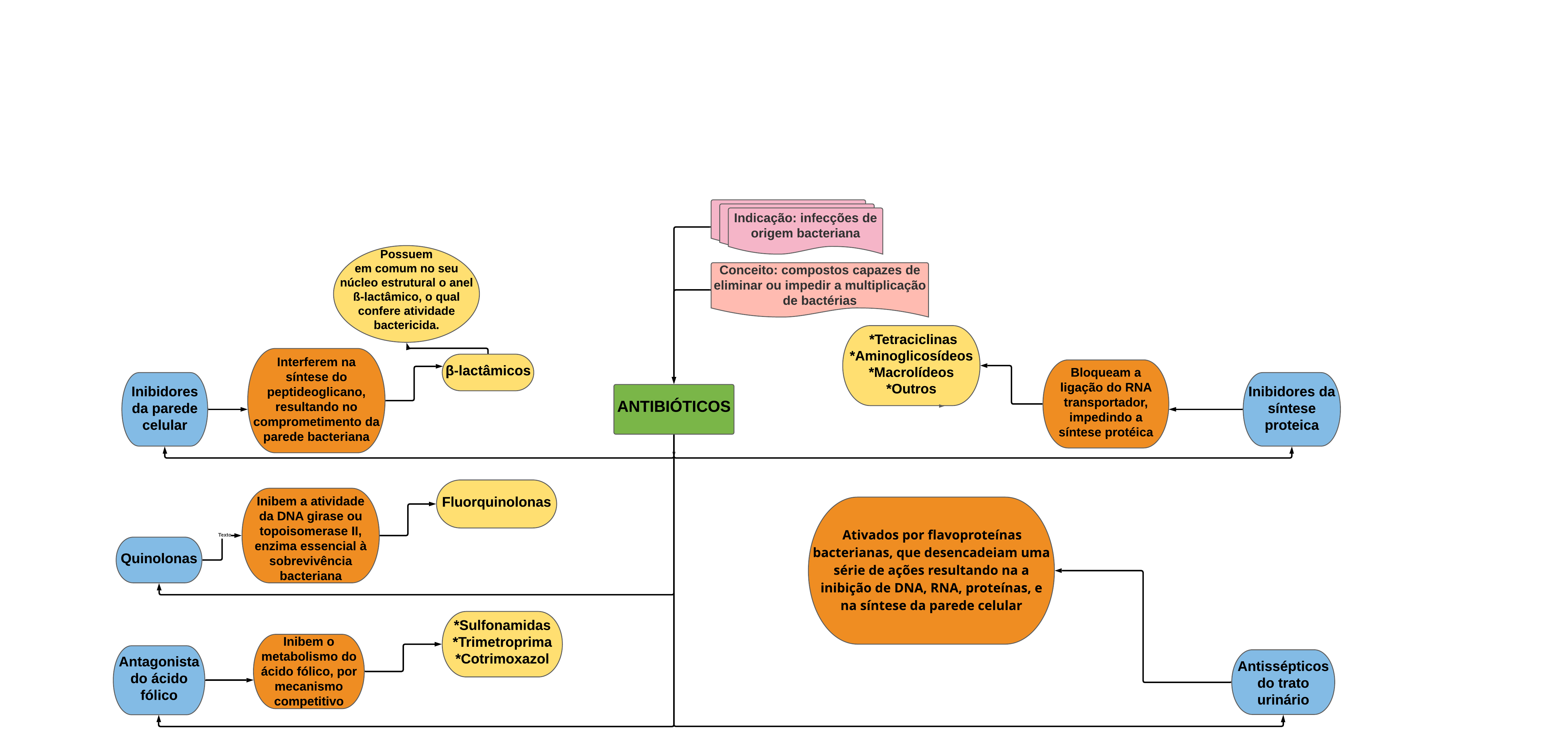 ANTIBIÓTICOS Inibidores da parede celular Inibidores da síntese proteica Antagonista do ácido fólico Quinolonas Antissépticos do trato urinário ?-lactâmicos *Sulfonamidas *Trimetroprima *Cotrimoxazol Fluorquinolonas *Tetraciclinas *Aminoglicosídeos *Macrolídeos *Outros Possuem em comum no seu núcleo estrutural o anel ß-lactâmico, o qual confere atividade bactericida. Inibem a atividade da DNA girase ou topoisomerase II, enzima essencial à sobrevivência bacteriana Interferem na síntese do peptideoglicano, resultando no comprometimento da parede bacteriana Inibem o metabolismo do ácido fólico, por mecanismo competitivo At ivados por f lavoprot eínas bact er ianas, que desencadeiam um a sér ie de ações result ando na a in ibição de DNA, RNA, prot eínas, e na sínt ese da parede celular Bloqueam a ligação do RNA transportador, impedindo a síntese protéica Texto Conceito: compostos capazes de eliminar ou impedir a multiplicação de bactérias Indicação: infecções de origem bacteriana Mapa mental antibiótico Página 1