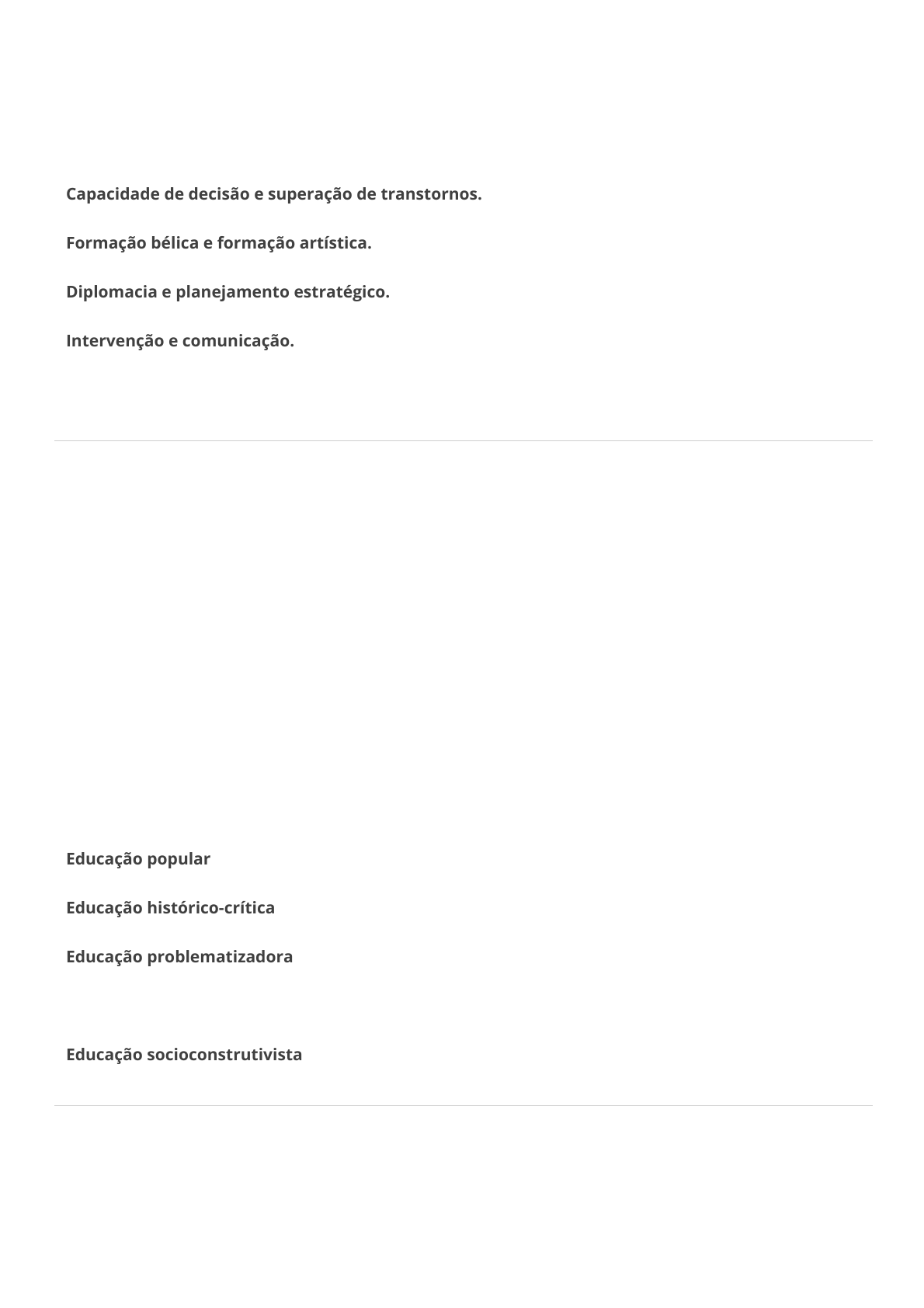 21/11/2020 Ultra https://sereduc.blackboard.com/ultra/courses/_36863_1/grades/assessment/_2952587_1/overview/attempt/_9729727_1/review?courseId=_3686… 1/6 Ocultar opções de resposta Ocultar opções de resposta A Educação para a Paz deve ser desenvolvida fundamentada nos seguintes princípios: Capacidade de decisão e superação de transtornos. Formação bélica e formação artística. Diplomacia e planejamento estratégico. Intervenção e comunicação. Resposta corretaConcepção de paz positiva e perspectiva criativa do conflito. Pergunta 2 -- /0,6 Leia o trecho a seguir: Paulo Freire denominou de _______________ o processo de ensino-aprendizagem centrado no suposto saber docente que parte da ideia de que o estudante está desprovido dos seus próprios pensamentos. Complete a sentença com a alternativa correta: Educação popular Educação histórico-crítica Educação problematizadora Resposta corretaEducação bancária Educação socioconstrutivista Pergunta 3 -- /0,6 21/11/2020 Ultra https://sereduc.blackboard.com/ultra/courses/_36863_1/grades/assessment/_2952587_1/overview/attempt/_9729727_1/review?courseId=_3686… 2/6 Ocultar opções de resposta Ocultar opções de resposta A Educação em Direitos Humanos tem como foco a dignidade humana. Por isso, volta-se para o impedimento do sofrimento humano como base para todo o trabalho educativo, seja ele formal ou não formal. Para tanto, faz-se necessárioque as autoridades e a sociedade em geral reconheçam a capacidadedos indivíduos em desenvolver opensamento crítico. Assim, a Educação em Direitos Humanos deve ser vista como: Uma atitude corajosa e altruísta de regeneração das pessoas que estão fora do convívio social. Uma educação meritocrática que propicie benesses para aqueles que exercem lideranças em processos de assistência social. Uma estratégia de cooptação de pessoas e grupos fora dos consensos do Estado. Resposta correta Uma política pública capaz de transformar os valores e as atitudes daqueles que são excluídos e marginalizados dos espaços sociais. Uma defesa inequívoca da inclusão de todos nos mesmos moldes e valores da cultura dominante. Pergunta 4 -- /0,6 Sobre a Educação em Direitos Humanos, na educação superior, podemos afirmar que deve: 1) Fomentar o debate e o fortalecimento da capacidade argumentativa; 2) Direcionar cada um dos ouvintes a explorar seu potencial; 3) Democraticamente buscar uma solução harmônica entre os pares. Considerando os três postulados, assinale a alternativa correta: Somente o 2 está errado. Resposta correta1, 2 e 3 estão corretos. Somente a 3 está incorreta. 1 e 2 estão errados e a 3 está correta. 21/11/2020 Ultra https://sereduc.blackboard.com/ultra/courses/_36863_1/grades/assessment/_2952587_1/overview/attempt/_9729727_1/review?courseId=_3686… 3/6 Ocultar opções de resposta Ocultar opções de resposta 1 está errado e 2 e 3 estão corretos. Pergunta 5 -- /0,6 Podemos afirmar que a educação em diretos humanos visando a formação de valores: Resposta corretaÉ o resultado contínuo de comportamentos e atitudes no mundo da vida. Prega que os valores dos indivíduos têm a ver com suas heranças genéticas. Incorreta: Acredita que os valores dos indivíduos, em sua integralidade, são frutos de sua formação escolar. Resulta de sua profissão religiosa. É uma herança dos ancestrais. Pergunta 6 -- /0,6 A questão metodológica da Educação em Direitos Humanos no ensino superior assume uma conotação importante porque: Treina os cientistas de amanhã. Ajuda o estudante da educação superior a aprender a estudar mais. Induz a um comportamento competitivo no mercado de trabalho. Leva ao conhecimento de metodologias diversas. 21/11/2020 Ultra https://sereduc.blackboard.com/ultra/courses/_36863_1/grades/assessment/_2952587_1/overview/attempt/_9729727_1/review?courseId=_3686… 4/6 Ocultar opções de resposta Ocultar opções de resposta Resposta correta Passa a formar profissionais graduados no mercado de trabalhocom uma formação cidadã mais conscientes. Pergunta 7 -- /0,6 Quem foi o filósofo inglês, cuja teoria deu um caráter mais universal aos recém-criados direitos da Inglaterra? Ele propõe que o ser humano constitui a base e a origem do poder que é transferido ao soberano mediante o contratosocial, reconhecendo, assim, a base dos direitos como os homens: John Stuart Mill. Resposta corretaJohn Locke. Francis Bacon. Thomas Hobbes. Michael Oakeshott. Pergunta 8 -- /0,6 De 1939 a 1945 ocorreu a Segunda Grande Guerra Mundial,. que foi um empreendimento devastador que acabou com a vida de milhares de homens e mulheres. Além disso, Hitler promoveu políticas racistas de extermínio sistemático. São respostas concretas a esses horrores humanos: A Organização das Nações Unidas para a Educação, Ciência e Cultura (UNESCO) e O Tratado de Forças Nucleares de Alcance Intermediário. 21/11/2020 Ultra https://sereduc.blackboard.com/ultra/courses/_36863_1/grades/assessment/_2952587_1/overview/attempt/_9729727_1/review?courseId=_3686… 5/6 Ocultar opções de resposta Organização para a Segurança e Cooperação na Europa (OSCE) e Declaração das Nações Unidas sobre Todas as Formas de Discriminação Racial. Organização Mundial do Progresso (OMC) e Declaração Americana dos Direitos e Deveres do Homem. Resposta correta Organização das Nações Unidas (ONU) e a Promulgação da Declaração Universal dos Direitos Humanos. Organização para Cooperação e Desenvolvimento Econômico (OCDE) e Declaração sobre a Raça e os Preconceitos Raciais. Pergunta 9 -- /0,6 Após ler o trecho que segue e realizar as devidas reflexões sobre a temática abordada, responda o que se pede. “Os tratados e as declarações internacionais concordam em ressaltar a importância da educação como fator de promoção, desenvolvimento e igualdade entre os povos, pois ela contribui diretamente com a construção da paz e da liberdade das