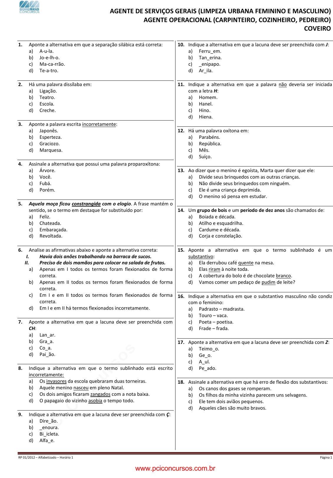 pcimarkpci MjgwNDowMjE0OjgxOTU6MzIzNDowMDAxOjAwMDI6MjU0MTpjZWJi:VHVlLCAxMSBBdWcgMjAyMCAxMDoyNDo0OSAtMDMwMA== AGENTE DE SERVIÇOS GERAIS (LIMPEZA URBANA FEMININO E MASCULINO) AGENTE OPERACIONAL (CARPINTEIRO, COZINHEIRO, PEDREIRO) COVEIRO RP 01/2012 – Alfabetizado – Horário 1 Página 1 1. Aponte a alternativa em que a separação silábica está correta: a) A-u-la. b) Jo-e-lh-o. c) Ma-ca-rrão. d) Te-a-tro. 2. Há uma palavra dissílaba em: a) Ligação. b) Teatro. c) Escola. d) Creche. 3. Aponte a palavra escrita incorretamente: a) Japonês. b) Esperteza. c) Graciozo. d) Marquesa. 4. Assinale a alternativa que possui uma palavra proparoxítona: a) Árvore. b) Você. c) Fubá. d) Porém. 5. Aquela moça ficou constrangida com o elogio. A frase mantém o sentido, se o termo em destaque for substituído por: a) Feliz. b) Chateada. c) Embaraçada. d) Revoltada. 6. Analise as afirmativas abaixo e aponte a alternativa correta: I. Havia dois anões trabalhando na barraca de sucos. II. Preciso de dois mamãos para colocar na salada de frutas. a) Apenas em I todos os termos foram flexionados de forma correta. b) Apenas em II todos os termos foram flexionados de forma correta. c) Em I e em II todos os termos foram flexionados de forma correta. d) Em I e em II há termos flexionados incorretamente. 7. Aponte a alternativa em que a lacuna deve ser preenchida com CH: a) Lan_ar. b) Gra_a. c) Co_a. d) Pai_ão. 8. Indique a alternativa em que o termo sublinhado está escrito incorretamente: a) Os invasores da escola quebraram duas torneiras. b) Aquele menino nasceu em pleno Natal. c) Os dois amigos ficaram zangados com a nota baixa. d) O papagaio do vizinho asobia o tempo todo. 9. Indique a alternativa em que a lacuna deve ser preenchida com Ç: a) Dire_ão. b) _enoura. c) Bi_icleta. d) Alfa_e. 10. Indique a alternativa em que a lacuna deve ser preenchida com J: a) Ferru_em. b) Tan_erina. c) _enipapo. d) Ar_ila. 11. Indique a alternativa em que a palavra não deveria ser iniciada com a letra H: a) Homem. b) Hanel. c) Hino. d) Hiena. 12. Há uma palavra oxítona em: a) Parabéns. b) República. c) Mês. d) Suíço. 13. Ao dizer que o menino é egoísta, Marta quer dizer que ele: a) Divide seus brinquedos com as outras crianças. b) Não divide seus brinquedos com ninguém. c) Ele é uma criança deprimida. d) O menino só pensa em estudar. 14. Um grupo de bois e um período de dez anos são chamados de: a) Boiada e década. b) Atilho e esquadrilha. c) Cardume e década. d) Corja e constelação. 15. Aponte a alternativa em que o termo sublinhado é um substantivo: a) Ela derrubou café quente na mesa. b) Elas riram à noite toda. c) A cobertura do bolo é de chocolate branco. d) Vamos comer um pedaço de pudim de leite? 16. Indique a alternativa em que o substantivo masculino não condiz com o feminino: a) Padrasto – madrasta. b) Touro – vaca. c) Poeta – poetisa. d) Frade – frada. 17. Aponte a alternativa em que a lacuna deve ser preenchida com Z: a) Teimo_o. b) Ge_o. c) A_ul. d) Pe_ado. 18. Assinale a alternativa em que há erro de flexão dos substantivos: a) Os canos dos gases se romperam. b) Os filhos da minha vizinha parecem uns selvagens. c) Ele tem dois aviãos pequenos. d) Aqueles cães são muito bravos. www.pciconcursos.com.br pcimarkpci MjgwNDowMjE0OjgxOTU6MzIzNDowMDAxOjAwMDI6MjU0MTpjZWJi:VHVlLCAxMSBBdWcgMjAyMCAxMDoyNDo0OSAtMDMwMA== AGENTE DE SERVIÇOS GERAIS (LIMPEZA URBANA FEMININO E MASCULINO) AGENTE OPERACIONAL (CARPINTEIRO, COZINHEIRO, PEDREIRO) COVEIRO RP 01/2012 – Alfabetizado – Horário 1 Página 2 19. Assinale a alternativa em que o substantivo em destaque está no grau aumentativo: a) Nossa, ele virou um rapagão. b) Preciso tirar uma soneca. c) A festa será na ruela em frente a minha casa. d) As produtoras ganharam duas estatuetas de ouro. 20. Dentre as palavras sublinhadas abaixo, aponte aquela que está escrita incorretamente: a) Você fez a escolha certa. b) A sopa de ervilhas está divina. c) Comprei uma sandalha azul. d) Os galhos das árvores estão ressecados. 21. Assinale a alternativa em que o termo sublinhado é um adjetivo. a) O bebê tomou chá frio. b) Papai viajou para o sítio. c) Pegue o meu remédio em cima da estante. d) Devido ao excesso de velocidade, todos os motoristas que passaram por ali foram multados. 22. A lacuna deve ser preenchida com RR em: a) Bu_o. b) Menti_a. c) Gravu_a. d) Ca_valho. 23. A palavra em destaque foi escrita de forma incorreta em: a) Eu preciso comprar uma acetona nova. b) Não se esqueça da campanha da vacinação. c) Eu não consigo cortar cebola. d) Ainda não acinamos os papeis do divórcio. 24. Aponte a alternativa em que há uma palavra trissílaba: a) Rochedo. b) China. c) Reclamação. d) Curva. 25. Há uma palavra polissílaba em: a) Reginaldo. b) Mosca. c) Óculos. d) Selos. 26. Indique a alternativa em que a lacuna deve ser preenchida com X: a) Pon_e. b) Gordu_o. c) Ve_ame. d) Tre_o. 27. Aponte a alternativa em que há uma palavra paroxítona: a) Úmido. b) Lágrima. c) Paletó. d) Bônus. 28. Indique a alternativa em que há uma palavra feminina: a) Açúcar. b) Acne. c) Tapa. d) Apetite. 29. A cidade do Rio de Janeiro pertence a qual Região brasileira? a) Norte. b) Nordeste. c) Sul. d) Sudeste. 30. Um dos maiores humoristas do Brasil, falecido neste último mês de março, famoso por ter criado mais de 200 personagens: a) Carlos Manoel da Nóbrega. b) Chico Anysio. c) Tom Cavalcante. d) Costinha. 31. Um teatro tem 18 fileiras de poltronas e em cada fileira há 15 poltronas. Então nesse teatro cabem sentadas: a) 230 pessoas. b) 180 pessoas. c) 320 pessoas. d) 270 pessoas. 32. Lúcia tem 23 anos e seu avô tem triplo da sua idade. Seu avô tem: a) 81 anos. b) 73 anos. c) 69 anos. d) 92 anos. 33. Jonas tem 28 bolinhas de gude, Roberto tem 42 e Lucas 54. Quantas bolinhas de gude eles têm juntos? a) 114. b) 132. c) 128. d) 124. 34. O Sr. Raul nasceu em 1.886 e morreu em 1.964 aos... a) 87 anos. b) 92 anos. c) 