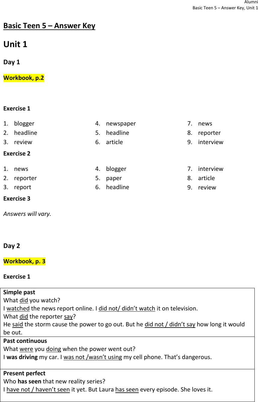 Alumni Basic Teen 5 – Answer Key, Unit 1 Basic Teen 5 – Answer Key Unit 1 Day 1 Workbook, p.2 Exercise 1 1. blogger 2. headline 3. review 4. newspaper 5. headline 6. article 7. news 8. reporter 9. interview Exercise 2 1. news 2. reporter 3. report 4. blogger 5. paper 6. headline 7. interview 8. article 9. review Exercise 3 Answers will vary. Day 2 Workbook, p. 3 Exercise 1 Simple past What did you watch? I watched the news report online. I did not/ didn’t watch it on television. What did the reporter say? He said the storm cause the power to go out. But he did not / didn’t say how long it would be out. Past continuous What were you doing when the power went out? I was driving my car. I was not /wasn’t using my cell phone. That’s dangerous. Present perfect Who has seen that new reality series? I have not / haven’t seen it yet. But Laura has seen every episode. She loves it. Alumni Basic Teen 5 – Answer Key, Unit 1 Exercise 2 1. Juan worked at the store on weekends. Juan was working at the store on weekends. 2. Jenny rode a bike in the morning. Jenny was riding a bike in the morning. 3. Tom and Gina studied Chinese. Tom and Gina were studying Chinese. 4. We did not / didn’t play football in the park. We were not / weren’t playing football in the park. Exercise 3 1. has learned; Tom and Gina have learned how to read in Chinese. 2. has worked; Juan has worked on weekends before. 3. has ridden; Jenny has ridden a bike in the morning. 4. has not / hasn’t played; We have not / haven’t played football in the park. Student’s book, p. 5 Exercise 6 1. was watching / wasn’t watching 2. has seen / hasn’t seen 3. went / didn’t go 4. were posting / weren’t posting Day 3 Workbook, p. 3 Exercise 4 Past passive The article was posted (post) online. The photographs were posted (post) last week. But they were not / weren’t posted (not post) by me. Present perfect passive The video has been watched (watch) by over 3 million people! It’s been seen (see) in over 30 countries. But it has not / hasn’t been seen (not see) in the artist’s own country. Exercise 5 1. A fact-checking site was used to prove that the legend was false. 2. The game scores have not / haven’t been posted to the school website. 3. The summer music festival was attended by over 60,000 people. 4. The event has not / hasn’t been recorded by / on a cell phone. Alumni Basic Teen 5 – Answer Key, Unit 1 Workbook, p. 4 Exercise 1 1. a 2. a 3. a 4. b 5. a 6. b 7. a 8. a Exercise 2 1. as soon as 2. While 3. until 4. since 5. Before 6. By the time 7. Every time 8. after 9. as 10. Whenever 11. when Exercise 3 1. My laptop broke while / as I was watching my friend’s video clips. 2. The game ended as / as soon as / before / by the time / while I texted my dad. 3. I bought tickets for the concert as soon as / after / when they went on sale at noon. 4. The band was playing their last song as / while I recorded it with my smartphone. 5. I studied for the test as / while / every time / whenever I was taking the bus to school Student’s book, p. 5 Exercise 7 1. The TV show was recorded in April. 2. The papers haven’t been delivered. 3. The report was filed in the main office. 4. The letters have been opened. 5. The name of the reporter wasn’t given. Day 4 Workbook, p. 5 Exercise 1 1. Situation that happened in the past. 2. Situation that happened in the past. 3. Thing that happened repeatedly in the past but doesn’t happen now. 4. Thing that happened repeatedly in the past but doesn’t happen now. 5. Situation that happened in the past. 6. Situation that happened in the past. Exercise 2 1. did you use to 2. used to live 3. use to go 4. used to 5. Would 6. wouldn’t / didn’t 7. used to / would 8. would 9. would / used to 10. would / used to 11. would you / did you use to 12. would / used to Alumni Basic Teen 5 – Answer Key, Unit 1 Exercise 3 1. Kevin would play played in the snow last vacation. 2. We would used to live in Hawaii when I was younger. 3. My grandparents didn’t used to would use their new computer until I showed them how. 4. I used to play played my video game at 8:00 last night. 5. My family was buying used to buy / would buy vegetables at the store until we started our garden. Exercise 4 Answers will vary. Workbook, p. 6 Exercise 1 1. I’m really into playing the guitar right now. 2. I’m not crazy about live music. 3. I’m not that into watching music videos. 4. I’m all about punk bands. 5. I can’t stand pop music. 6. I’m crazy about this new video. Exercise 2 1. all about 2. can’t stand 3. not that into / not crazy about 4. crazy about / really into 5. not crazy about / not that into 6. really into / crazy about Day 5 Student’s book, p. 11 Exercise 1 1. the news 2. a report 3. a reporter / paper 4. headlines / article 5. reviews 6. a blogger / interviews Exercise 2 1. I was working a lot yesterday. 2. Tara hasn’t passed her test. 3. The story was written in two days. 4. Ricky worked for a TV station. 5. Were you reading an interesting article? 6. The report has been written in three languages. Alumni Basic Teen 5 – Answer Key, Unit 1 Exercise 3 1. would watch / would look / used to be 2. used to live / would go / used to have 3. Did you use to be / Would you write Exercise 4 1. b 2. a 3. a Alumni Basic Teen 5 – Answer Key, Unit 2 Basic Teen 5 – Answer Key Unit 2 Day 1 Workbook, p. 8 Exercise 1 Exercise 2 1. passionate 2. talented 3. determined 4. hardworking 5. strict 6. impatient 7. easy-going 8. sociable 9. shy 10. motivated Exercise 3 Answers will vary. Day 2 Workbook, p. 9 Exercise 1 1. He hasn’t been surfing for a long time. 2. We ve been chatting online for three hours! 3. Ella s been making forms since 2011. 4. I haven t been watching any movies lately. 5. I used to love running, but now I ve stopped running. 6. They haven t been rock climbing since 2013. Alumni Basic Teen 5 – Answer Key, Unit 2 Exercise 2 1. Kay: have; been having Helen: have not 