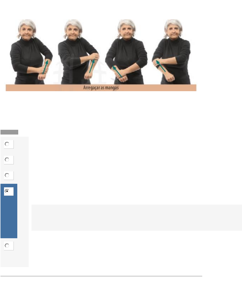 Questão 1/10 - Libras Observe a imagem: Após esta avaliação, caso queira ler o texto integralmente, ele está disponível em: MARTINS, Vanessa Regina de Oliveira ; SANTOS, Lara Ferreira dos; LACERDA, Cristina Broglia Feitosa de (Orgs.). LIBRAS: aspectos fundamentais. Curitiba: InterSaberes, 2019. p. 152 Considerando seus conhecimentos sobre a disciplina e os conteúdos do livro-base Libras: Aspectos fundamentais, assinale a alternativa correspondente ao tipo de metáfora apresentado na imagem Nota: 10.0 A divergente B diferente C semelhante D equivalente Você acertou! Comentário: “Metáfora equivalente: Estas metáforas se equivalem tanto na forma como no sentido. Nesse caso, ao se contrastare m as duas línguas, Libras e português, é possível notar igualdade de forma e equivalência de sentido na metáfora, conforme pode ser visto no exemplo a seguir [apresentação da figura 4.11 – Metáfora equivalente].” (p. 152) E concreta Questão 2/10 - Libras Observe a imagem: Após esta avaliação, caso queira ler o texto integralmente, ele está disponível em: MARTINS, Vanessa Regina de Oliveira ; SANTOS, Lara Ferreira dos; LACERDA, Cristina Broglia Feitosa de (Orgs.). LIBRAS: aspectos fundamentais. Curitiba: InterSaberes, 2019. p. 139. Considerando os conteúdos do livro-base Libras: Aspectos fundamentais, assinale a resposta correspondente ao tipo de ENMs (expressões não manuais) gramaticais usado na imagem. Nota: 10.0 A Negativa B Afirmativa C Exclamativa D Indagativa E Interrogativa Você acertou! Comentário: Conforme se lê no último parágrafo da p. 138, que antecede a imagem: “Acornpanhe a seguir sinais utilizados como marcadores retóricos e interrogativos. No caso de quem e o-que, perceba que o sinal manual é o mesmo, mas a dlferença está, justamente, na ENM facial, especificamente no arredondamento dos lábios para o-que e abertura para quem”. Como consta na legenda da primeira das duas imagens da p.139, os dois sinais correspondem às ENMs (expressões não manuais) “Quem” e “O que”, respectivamente. Questão 3/10 - Libras Leia a citação a seguir (...) em 1827 foi promulgada a primeira e única Lei Geral referente à instrução primária no Brasil durante o império (...) Após esta avaliação, caso queira ler o texto integralmente, ele está disponível em: LACERDA, SANTOS, MARTINS (org) Libras: aspectos fundamentais, Curitiba: InterSaberes, 2019, p. 164. Com base na leitura do livro da disciplina Libras: aspectos fundamentais, em relação a instrução primária no período do Império, assinale a alternativa correta. Nota: 10.0 A A Lei Geral determinou que todas as vilas e lugares mais populosos tivessem escolas de letras, tantas quantas fossem necessárias para mudar o quadro da educação. Você acertou! Comentário: De acordo com Rocha (citado por Sofiato, 2011, p.34) “em 1827 foi promulgada a primeira e única Lei geral referente à instrução primária no Brasil durante o Império, presente no artigo 1º que em todas as cidades, vilas e lugares mais populosos haverá escolas de letras”, tantas quantas fossem necessárias para tentar mudar o quadro educacional da população brasileira. (livro base, p. 164) B A única lei sobre o ensino primário no Brasil foi feita pelos portugueses em 1500. C O Brasil só organizou a educação primária no século XXI. D O período do Império no Brasil se preocupou em organizar o ensino Superior. E A Lei Geral criou escolas nas capitais do país na época do Império. Questão 4/10 - Libras Leia o fragmento de texto a seguir: “No Brasil, atualmente, existem inúmeras instituições (...) que têm alavancado o uso e a difusão da Libras e lutado pela modificação das políticas públicas, além de se organizarem a favor da educação, e integração dos surdos em parceira pelas principais capitais do Brasil” Após esta avaliação, caso queira ler o texto integralmente, ele está disponível em: LACERDA, Cristina Broglia Feitosa et ali. Libras: Aspectos Fundamentais. Curitiba: Intersaberes, 2019. p. 248-49. De acordo com as informações acima e com os conteúdos do livro Libras: Aspectos Fundamentais, as instituições que agem em prol dos direitos das pessoas surdas no Brasil são: Nota: 10.0 A Federação Nacional de Educação e Integração dos Surdos de São Paulo (FENEIS), Federação Brasileira das Associações dos Profissionais Tradutores e Intérpretes e Guiaintérpretes da Língua de Sinais (Febrapils); Federação Desportiva de Surdos do Estado de São Paulo (FDSESP). Você acertou! Comentário: “No Brasil, atualmente, existem inúmeras instituições (...) que têm alavancado o uso e a difusão da Libras e lutado pela modificação das políticas públicas, além de se organizarem a favor da educação, e integração dos surdos em parceira pelas principais capitais do Brasil. Algumas dessas instituições são: Federação Nacional de Educação e Integração dos Surdos de São Paulo (FENEIS), Federação Brasileira das Associações dos Profissionais Tradutores e Intérpretes e Guiaintérpretes da Língua de Sinais (Febrapils); Federação Desportiva de Surdos do E stado de São Paulo (FDSESP).” B Federação Brasileira de Apoio aos Surdos (FBAS), Organização Brasileira de Apoio à Pessoa Surda (OBAPS), Associação Nacional da Pessoa Surda (ANPS). C Instituto Brasileiro de Amparo aos Surdos (IBAS), Federação Brasileira de Língua de Sinais (FBLIBRAS), Federação Nacional de Combate ao Preconceito (FNCP). D Associação Brasileira de Surdos (ABS), Instituto Federal de Surdez (IFS), Companhia Brasileira de Defesa aos Direitos da Pessoa Surda (CBDDPS) E Instituto Brasileiro de Educação de Surdos (IBES), Organização Nacional dos Surdos (ONS), Associação Nacional de Apoio ao Surdos (ANAS). Questão 5/10 - Libras Leia a citação a seguir (Em relação à Libras) abordamos alguns exemplos de uso que nos fazem pensar sobre a língua e seu uso em diferentes espaços