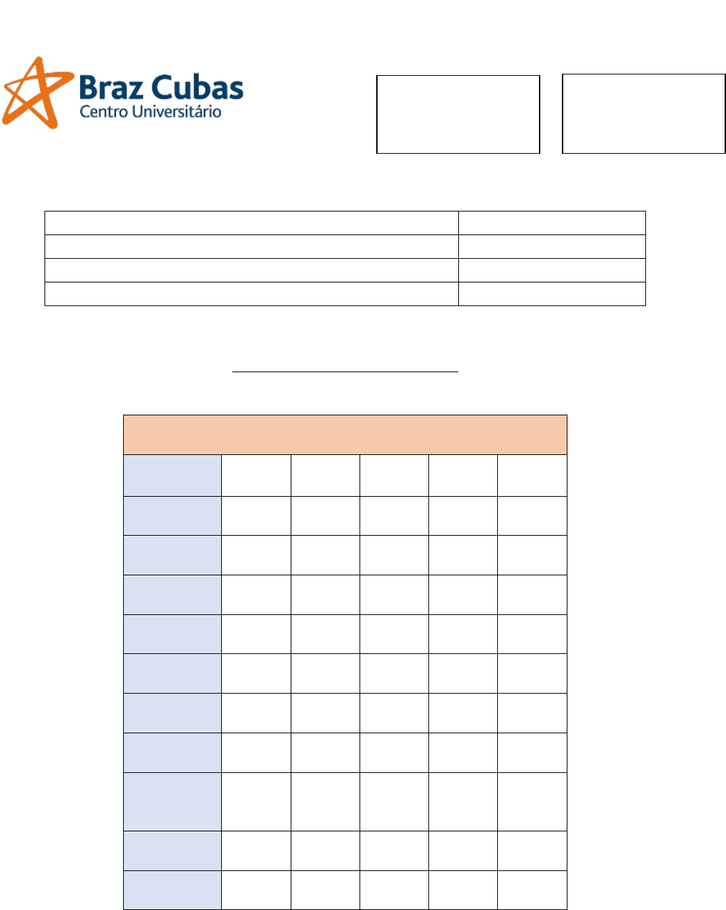 Ciência: Nota: Curso: ENFERMAGEM Data: 14/11/2020 Disciplina: BIOLOGIA CELULAR E TECIDUAL Código: Professor: FERNANDA TALHATI Turma: 1° SEMESTRE Aluno: BRUNA STEFANI SILVA TAKAYANAGI RGM: 24878138 AVALIAÇÃO A2 – BIOLOGIA GABARITO QUESTÃO A B C D E 1 X 2 X 3 X 4 X 5 X 6 X 7 X 8 X 9 X 10 X