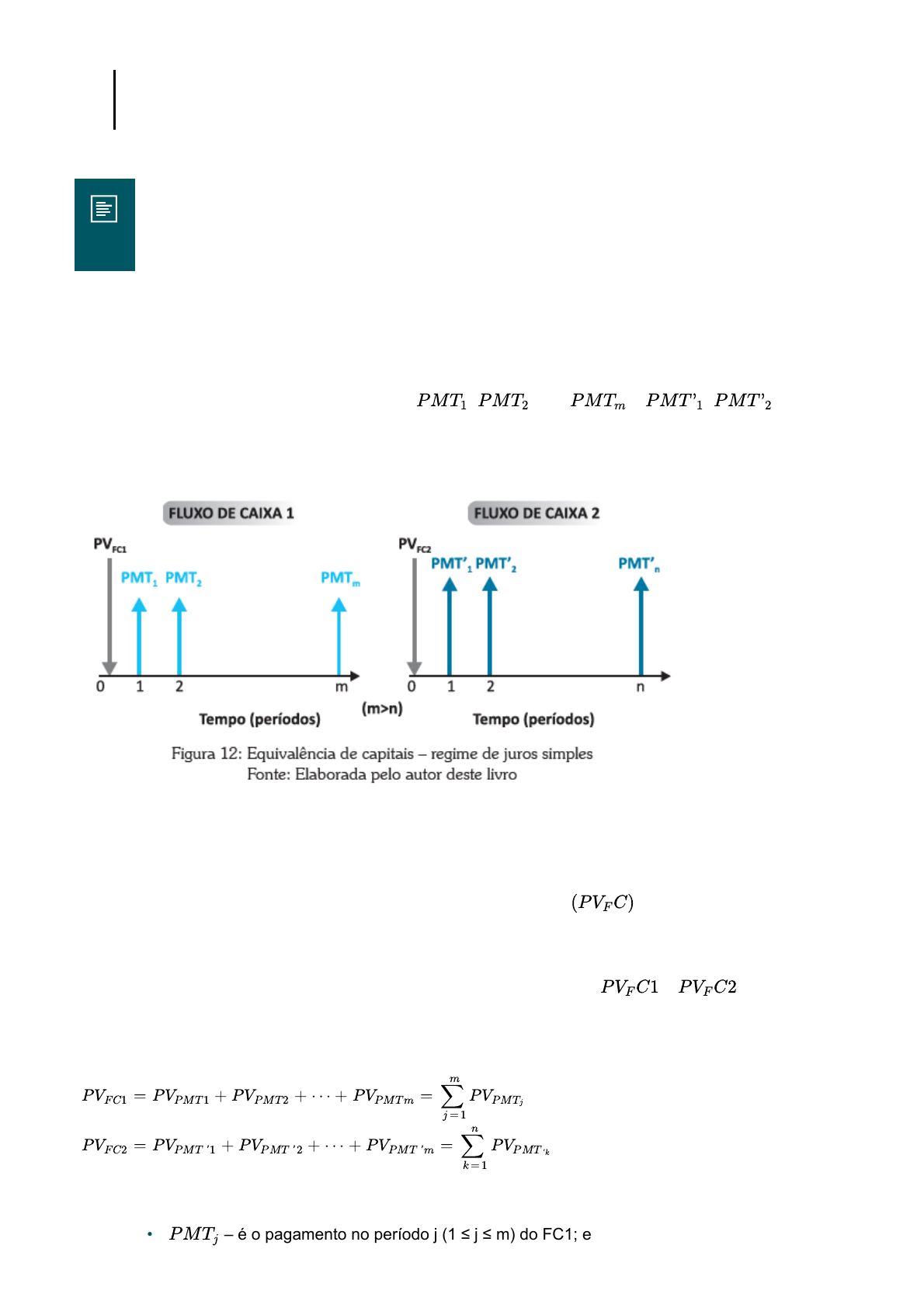 04/08/2020 Texto-base - Acessibilidade Matemática financeira e análise de investimentos - Parte 10 | Ernesto Coutinho Puccini: ENGENHARI… https://cursos.univesp.br/courses/3150/pages/texto-base-acessibilidade-matematica-financeira-e-analise-de-investimentos-parte-10-%7C-ernesto… 1/4 ENGENHARIA ECONÔMICA Conceito de juros e cálculos de juros simples1 TEXTO-BASE Texto-base - Matemá�ca financeira e análise de inves�mentos | Ernesto Cou�nho Puccini | Parte 10 Equivalência de Capitais Considere agora os dois fluxos de caixa representados na Figura 12. Esses fluxos de caixa têm suas entradas de caixa dadas respectivamente por , ,......, e , ,......, PMT’n. O subscrito representa o ponto temporal em que se dá a entrada de caixa. Na Figura 12, o símbolo PVFC representa o valor presente do fluxo de caixa. Para comparar esses dois fluxos de caixa em regime de juros simples, você deve se valer do conceito de valor presente de um fluxo de caixa. Segundo Mathias e Gomes (2009), o valor presente de um fluxo de caixa é a soma algébrica dos valores presentes de cada uma das parcelas do fluxo de caixa para uma dada taxa de juros. Os valores presentes desses dois fluxos de caixa 1 e 2 – denominados e – são a soma de cada uma das parcelas que os compõem descontadas para a data focal zero. Vamos adotar a seguinte representação genérica: Em que: PMT1 PMT2 PMTm PMT ’1 PMT ’2 (PVF C) PVF C1 PVF C2 PVFC1 = PVPMT1 + PVPMT2 + ⋯ + PVPMTm = m ∑ j = 1 PVPMTj PVFC2 = PVPMT ' 1 + PVPMT ' 2 + ⋯ + PVPMT ' m = n ∑ k = 1 PVPMT ' k – é o pagamento no período j (1 ≤ j ≤ m) do FC1; e• PMTj 04/08/2020 Texto-base - Acessibilidade Matemática financeira e análise de investimentos - Parte 10 | Ernesto Coutinho Puccini: ENGENHARI… https://cursos.univesp.br/courses/3150/pages/texto-base-acessibilidade-matematica-financeira-e-analise-de-investimentos-parte-10-%7C-ernesto… 2/4 Equivalência de Fluxos de Caixa Dois fluxos de caixa são equivalentes quando os seus valores presentes, calculados para a mesma taxa de juros, forem iguais, ou seja: FC1 = FC2 Essa equivalência pode ser representada por: FC1 = FC2 Inversamente, se dois fluxos de caixa forem equivalentes para uma dada taxa de juros, então, seus valores presentes, calculados essa taxa de juros, são iguais. Com essa definição, é possível comparar fluxos de caixa alterna tivos para decidir qual deles é o melhor em termos do seu “custo” (menor valor presente). Para isso, você, em primeiro lugar, deve descontar todos os seus componentes para uma única data que é denominada data focal e, em seguida, somá-los algebricamente para determinar o . Em regime de juros simples, a comparação de fluxos de caixa deve ser feita sempre na data focal “zero”. Leia Calculando o valor presente de um fluxo de caixa – aplicação em Leituras Complementares 2. Disponível em: http://www.proativams.com.br/files_aberto/Leiturascomplementares2.doc (http://www.proativams.com.br/files_aberto/Leiturascomplementares2.doc) . Acesso em: 27 jul. 2011. Como dito, para que os dois fluxos de caixa mostrados na Figura 12 sejam equivalentes, eles devem produzir valores presentes iguais quando descontados a uma mesma taxa de juros. A taxa que garante essa igualdade é denominada taxa de juros (ou de desconto) de equivalência. Observe que o desconto para o cálculo dos valores presentes dos fluxos de caixa pode ser feito em modelo racional ou em modelo comercial. Por simplificação, deste ponto em diante, nos referiremos simplesmente a uma taxa que poderá ser racional (taxa de juros) ou comercial (taxa de desconto) conforme a situação em análise. Equivalência de Fluxos de Caixa em Desconto Racional Você pode obter as relações de equivalência calculando os valores atuais dos dois fluxos de caixa, representados na Figura 12, pelo critério do desconto racional (utilizando a fórmula: C = M/(1+i*n)) e lembrando-se de que: Assim, temos: De acordo com a definição de equivalência, esses dois fluxos de caixa serão equivalentes, em desconto racional, quando os seus valores atuais forem iguais (para a taxa de juros), ou seja: – é o pagamento no período k (1 ≤ k ≤ n) do FC2.• PMT ’k PVF C PVPMT1 = ; PVPMT2 = ; ⋯PVPMTm = PMT1 (1 + i ⋅ 1) PMT2 (1 + i ⋅ 2) PMTm (1 + i ⋅ m) PVPMT1 ' = ; PVPMT2 ' = ; ⋯PVPMTm = PMT1 (1 + i ⋅ 1) PMT2 (1 + i ⋅ 2) PMTn (1 + i ⋅ n) PVFC1 = + + ⋯ + PMT1 (1 + 1 ⋅ i) PMT2 (1 + 2 ⋅ i) PMTm (1 + m ⋅ i) PVFC2 = + + ⋯ + PMT1 (1 + 1 ⋅ i) PMT2 (1 + 2 ⋅ i) PMTn (1 + n ⋅ i) PV FC1 = PV FC2 http://www.proativams.com.br/files_aberto/Leiturascomplementares2.doc 04/08/2020 Texto-base - Acessibilidade Matemática financeira e análise de investimentos - Parte 10 | Ernesto Coutinho Puccini: ENGENHARI… https://cursos.univesp.br/courses/3150/pages/texto-base-acessibilidade-matematica-financeira-e-analise-de-investimentos-parte-10-%7C-ernesto… 3/4 Equivalência de Fluxos de Caixa em Desconto Comercial De modo análogo, você determina essa equivalência em desconto comercial fazendo os descontos dos valores futuros para a data presente com a aplicação das fórmulas do desconto comercial (PV = FV * (1 – i *n)). Assim: Como dito, os dois fluxos de caixa serão equivalentes, em desconto comercial, se os seus valores atuais forem iguais (para a mesma taxa de desconto i), ou seja: = Exemplo 2.12 Um título de $ 2.000,00 com vencimento para 60 dias foi renegociado e credor e devedor ajustaram a dívida para dois pagamentos iguais com vencimentos para 90 e 120 dias. Considerando a taxa de juros de 2% am, calcule os novos valores pelo modelo racional. Sumário de dados: Solução A Figura 13 mostra o valor dos novos títulos designado por e . Do ponto de vista financeiro, os fluxos de caixa das duas alternativas de pagamento devem ser equivalentes. Assim, a condição do problema impõe que os valores presentes dessas duas alternativas de pagamento sejam iguais. Aplicando a fórmula
