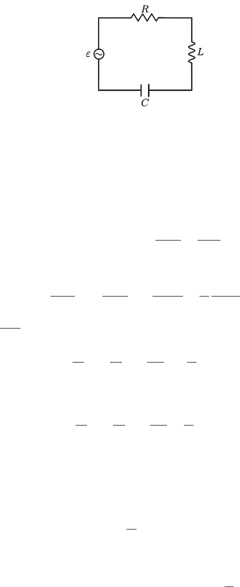 Discussão dos Dados (1) Figura 1 é a esquematização do Circuito RLC em corrente alternada: Figura 1: Desenho esquemático do circuito RLC. Quando aplicado a Lei das Malhas no Circuito da Figura 1 , é obtido que: VFonte = VR + VL + VC (1) Onde VFonte é a tensão gerada pela fonte, VR a tensão no Resistor, VC a tensão no Capacitor e VL a tensão no indutor. Vemos que a equação (1) pode ser escrita em função do tempo da seguinte forma: ε(t) = RI(t) + L dI(t) dt + Q(t) C Derivando a equação anterior em relação ao tempo, é obtido a seguinte equação: dε(t) dt = R dI(t) dt + L d2I(t) dt2 + 1 C dQ(t) dt No entanto, como dQ(t) dt = I(t), substituindo é obtido que: dε dt −RdI dt − Ld 2I dt2 − I 1 C = 0 Utilizando notação complexa, a equação fica: dε̂ dt −RdÎ dt − Ld 2Î dt2 − Î C = 0 (2) Sabendo dessas seguintes equivalências: ε̂ = ε0e iωt Î = Īeiωt d dt = iω Então, a equação (2) na forma polar ficará como: iωε0e iωt = iωRĪeiωt + (iω)2LĪeiωt + Ī C eiωt 1 iωε0 = iωRĪ + (iω) 2LĪ + Ī C Simplificando, têm-se que: Ī[R + i(ωL− 1 ωC )] = ε0 (3) Sabendo que XL = ωL e XC = 1 ωC , são as Reatâncias Indutiva e Capacitiva, respectivamente. E seja as seguintes propriedades dos números complexos: Z̄ = R + (XL −XC)i |Z̄| = √ R2 + (XL −XC)2 Pelo seguinte diagrama de fasores: XL−XC R |Z|- Im Re φ Figura 2: Desenho esquemático do diagrama de fasores. É posśıvel observar que, Z̄ = |Z̄|(cosϕ+ senϕ) = |Z̄|eiϕ Onde, |Z̄| = √ (XL −XC)2 +R2 (4) Assim, Z̄ = |Z̄|eiϕ Observa-se também que: ϕ = arctan ( XL −XC R ) Escrevendo a equação (3) em notação complexa: Î = εeiωt |Z̄|eiϕ0 = ε0e i(ωt−ϕ) |Z̄| Considerando apenas a parte real da corrente imaginária, é concluido que: I(t) = �0 cos ( ωt− arctan ( XL−XC R ))√ (XL −XC)2 +R2 (5) 2 Sabendo que VC = XCI, sendo XC = 1 ωC , e I = V0 R ,assim VC = 1 ωC V0 R Sendo a frequência de ressonância ω = ω0 = 1√ LC temos, VC = 1 ω0C V0 R VC = 1 C√ LC V0 R VC = √ L C V0 R Ou seja, a tensão no indutor e no capacitor são iguais somente quando ω é igual ao ω0 de ressonância e é proporcional à tensão total gerada pela fonte. VC,L = αV0 (6) Onde α = 1 R √ L C é o amortecimento do circuito, e o fator de amortecimento é ζ = α ω0 . Quando α > ω0 o circuito tem um amortecimento forte; para α < ω0 o circuito sofre um amortecimento fraco e quando ζ = 1 ,ou seja, α = ω0 o circuito sofre um amortecimento cŕıtico. Ao substituirmos os valores de L, C e R, temos α = 5, 1598, ω0 = 194, 08 rad s e ζ = 1, 64 ∗ 10−4. Com base nos dados obtidos pelo experimento, foi posśıvel plotar as Tensões do circuito pela Frequência no gráfico da Figura ??: 3 0 10 20 30 40 50 10 20 30 40 50 60 T en sã o (V ) Frequência (kHz) Gráfico 1 Total Resistor Capacitor Indutor Figura 3: Gráfico representando a dependência entre a Tensão Total calculada, a Tensão no Resistor, a Tensão no Indutor e a Tensão no Capacitor versus a Frequência. O valor em que as tansões são máximas ocorrem na frequência de ressonância. Para a tensão total: f0 = 31, 00 kHz e VT = 9, 36 V. Para a tensão do resistor: f0 = 31, 00 kHz e VR = 9, 36 V. Para a tensão no indutor: f0 = 31, 00 kHz e VL = 46, 08 V. Para a tensão no capacitor: f0 = 31, 00 kHz e VC = 46, 08 V, A partir do gráfico é posśıvel observar que V0 = VT = 9, 36V , substituindo esses valores na equação (6): VC,L = 48, 29V Calculando o desvio percentual da Frequência de Ressonância (f0) calculada e a obtida a partir da Figura 1, é visto que: D% = ∣∣∣∣Dcal −DexpDcal ∣∣∣∣ = ∣∣∣∣48, 29− 31, 0048, 29 ∣∣∣∣ = 3, 58% A frequência de ressonância do Circuito RLC acontece quando VL = VC , ou seja, quando há o cruzamento de entre as quatro curvas do gráfico. Desse modo, analisando o gráfico da Figura 1,, a Frequência de Ressonância será fo = 31, 00kHz, tanto para as Tensões no Resistor e Total quanto para as tensões no Capacitor e Indutor. Fazendo o desvio percentual: D% = ∣∣∣∣Dcal −DexpDcal ∣∣∣∣ = ∣∣∣∣30, 89− 31, 0030, 89 ∣∣∣∣ = 3, 56% Analisando os resultados obtidos quando comparados os valores de VR, VL e de VT segundo o gráfico, observa-se que: 4 • Para f << f0 a Reatância Capacitiva (XC) é maior do que a Reatância Indutiva (XL) . Logo, circuito tem caráter de circuito capacitivo. Como a impedância equivalente do circuito é grande, a tensão no capacitor aumenta e onde há uma oposição de passagem da corrente. Sendo assim, o capacitor é um circuito aberto e o indutor é um curto circuito. Nesse caso o circuito é chamado de passa-baixa, ou seja, o circuito permite a passagem de baixas frequências sem dificuldades e atenua (ou reduz) a amplitude das frequências maiores que a frequência de ressonância; • Para f >> f0 ocorre o mesmo processo que no do item anterior. No entanto, agora o circuito tem caráter indutivo e a tensão no Indutor aumenta ocorrendo do mesmo modo uma oposição à passagem de corrente. Nesse caso XC < XL, ou seja a reatância indutiva domina no circuito, então a impedância do circuito tem caráter indutivo, e o oposto do item anterior. Para esse caso, o circuito é chamado de passa-alta pois permite a passagem de altas frequências sem dificuldades e atenua (ou reduz) a amplitude das frequências menores que a frequência de ressonância; • Para f = f0 XL = XC , ou seja, reatância indutiva e capacitiva se anulam, pois são iguais em módulo e o se torna um circuito resistivo puro. Para este caso, a parte LC se comporta como um curto-circuito e a tensão da fonte está totalmente sobre o resistor, gerando uma máxima dissipassão de potência e impedância pequena. Ocasionando que as correntes de maior magnitude passe pelo circuito. Esse circuito é chamado então de passa-faixa, pois permite a passagem de frequências em uma determinada faixa intermediária (