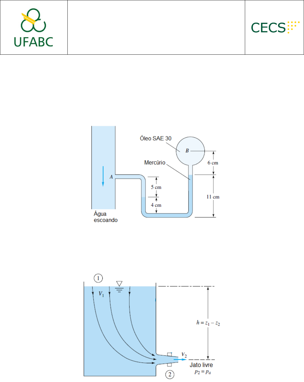 1 Fenômenos de Transporte Prof. João Lameu joao.lameu@ufabc.edu.br Lista de Exercícios em Sala 2 – Tópico 3: Mecânica dos Fluidos: Estática e Manometria, Bal. Energia Mecânica, Bernoulli, Escoamento Interno Viscoso Caso necessário, consulte as tabelas de propriedades dos fluidos! Dados: Mar = 28,9 kg/kmol, ρref,líquido = 997 kg/m³ (água, 20 ºC) 3.1. O esquema mostrado na figura abaixo é usado para mensurar a pressão em um trecho onde água escoa (ponto A). Se a pressão no ponto B é 87 kPa, calcule a pressão no ponto A. Considere todos os fluidos a 20ºC. 3.2. Encontre uma relação entre a velocidade de descarga do bocal V2, e a altura h da superfície livre do reservatório. Considere o escoamento permanente e sem atrito. O que implica um escoamento permanente em uma descarga de tanque? Em quais condições isto será válido? 2 3.3. Um piezômetro e um tubo de Pitot são colocados em um tubo horizontal por onde escoa água, conforme a figura abaixo, com objetivo de medir as pressões estática e de estagnação (estática + dinâmica), respectivamente. Para as leituras indicadas nas colunas, determine a velocidade no centro do tubo. 3.4. Determine o fator de atrito de Darcy em um tubo de ferro fundido asfaltado de 152 mm de diâmetro transportando água (ρ = 998 kg/m³; μ = 1 x 10 -3 Pa.s) com uma velocidade média de 1,83 m/s, utilizando: a) o diagrama de Moody. b) a correlação iterativa de Colebrook c) a correlação explícita de Haaland 3.5. Água a 20ºC é bombeada entre dois reservatórios a uma vazão de 100 L/s, por um tubo de 122 m de comprimento e 50 mm de diâmetro com diversos acessórios, conforme mostrado abaixo. Os tubos são feitos de aço comercial. Calcule a potência requerida a bomba em hp (1 hp = 745,7 W), se esta opera com eficiência de 75%. Curva suave de 90º rosqueada 3 3.6. Um trecho de um sistema de distribuição de água feito de ferro fundido envolve uma seção em paralelo com dois ramais (figura abaixo). Ambos os tubos tem diâmetro de 30 cm, e o escoamento é plenamente turbulento. O ramal A tem 1000 m de comprimento, enquanto o ramal B tem comprimento de 3000 m. Se a vazão no ramal A é 0,4 m³/s, determine a vazão em B. Desconsidere as perdas locais e assuma que a água está a 20ºC.