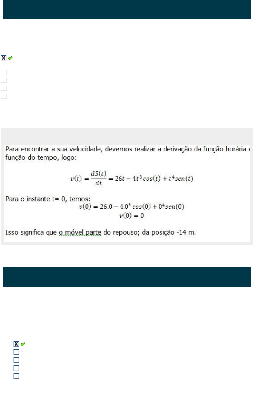 1a Questão Acerto: 1,0 / 1,0 Um móvel se locomove em função do tempo de tal forma que a sua função horária é dada por: S(t)=-14 +13t2 -t4.cos(t). Qual a sua velocidade no instante t=0? Considere as unidades no SI. zero √3 / 2 1 -14 √2 / 2 Respondido em 12/11/2020 20:24:42 Explicação: 2a Questão Acerto: 1,0 / 1,0 Um motorista dirige seu automóvel em uma pista reta a uma velocidade de 108km/h, quando avista um sinal amarelo situado a 100m à sua frente. O motorista sabe que do sinal amarelo para o sinal vermelho há um intervalo de tempo de 3s. Qual deve ser a aceleração imposta ao carro para que ele consiga pará-lo no exato momento em que o sinal fica vermelho? -4,5m/s² -1,0m/s² -45m/s² -10m/s² -5m/s² Respondido em 12/11/2020 20:37:37 Explicação: Primeiramente, devemos passar a velocidade de km/h para m/s, dividindo 108 por 3,6 e obtendo: 3a Questão Acerto: 1,0 / 1,0 Um bloco desliza sem atrito em uma plataforma horizontal, a uma velocidade de 25 m/s, quando de repente passa por uma parte da plataforma que promove atrito entre a plataforma e o bloco, de 10 m de comprimento, e quando sua velocidade atinge 20 m/s, o bloco volta a deslizar sem atrito, e continua seu caminho à velocidade constante. Se o bloco possui massa de 1kg, qual o módulo da força de atrito atuante no bloco. -10,12 N -11,25 N -6 N -9,75 N - 13 N Respondido em 12/11/2020 20:51:08 Explicação: 4a Questão Acerto: 1,0 / 1,0 Uma bala de canhão é atirada a um ângulo de 45° com velocidade inicial de 100 m/s. No ponto de máxima altura, o módulo de sua velocidade é de? 0 m/s 50√2 m/s - 50√2 m/s 25√2 m/s 15√2 m/s Respondido em 12/11/2020 20:53:02 Explicação: 5a Questão Acerto: 1,0 / 1,0 Considere um carro se locomovendo à velocidade constante de 108km/h, em um plano horizontal, quando, de repente, começa a subir uma rampa. No início da rampa, o condutor desliga o motor e o deixa subir por inércia. Considerando que toda a energia cinética se converte em energia potencial, e que a gravidade local é de 10m/s², assinale a opção que representa a altura máxima que o carro consegue atingir: 30m 65m 45m 50m 55m Respondido em 12/11/2020 20:50:34 Explicação: Antes de solucionar o problema, é necessário converter a velocidade de km/h para m/s, assim: v=108km/h=30m/s A energia mecânica inicial é a energia cinética, assim: E0=(m.v^2) / 2 = 450.m Na altura máxima, temos somente a energia potencial, assim: E = m.g.h = 10.m.h Pelo princípio da conservação de energia: 450.m = 10.m.h h=45 m 6a Questão Acerto: 1,0 / 1,0 Uma mola está disposta na horizontal, encostada em um anteparo à sua esquerda. Da direita para a esquerda, move-se uma bola com velocidade constante de 25m/s. Assinale a alternativa que representa a correta deformação da mola, no máximo de sua contração devido ao choque da bola com a mola, em metros. Considere g= 10m/s², m_bola=10g e K=35 N/m 0,55 0,50 0,40 0,46 0,43 Respondido em 12/11/2020 20:50:40 Explicação: Toda a energia cinética da bola se transformará em energia potencial. Assim, pelo princípio da conservação de energia, temos: 7a Questão Acerto: 1,0 / 1,0 Um móvel se move a uma velocidade de 108 km/h. A essa velocidade, ele possui um momento linear de 20 N.s. Assinale a alternativa que representa corretamente o valor da massa desse móvel: 0,35 kg 0,42 kg 0,29 kg 0,60 kg 0,67 kg Respondido em 12/11/2020 20:50:45 Explicação: P=mv 20 N.s=m.30 m/s m=2/3=0,67 kg Note que foi necessário converter a velocidade de km/h para m/s. 8a Questão Acerto: 0,0 / 1,0 No experimento intitulado MOVIMENTO RETILÍNEO UNIFORME - MRU que consiste de um plano inclinado, onde há um tubo transparente com água preso na lateral do plano inclinado (inclinação de 20º). Neste tubo há uma esfera de metal que pode ser deslocada para posição que desejar através da utilização de um ímã. Com a ajuda desse ímã, um aluno arrastou e depois soltou a esfera de metal na posição 0mm (a régua milimetrada encontra-se atrás do tubo com água), acionando o disparador, ele esperou a esfera descer até a posição 100mm, 200mm, 300mm e 400mm, apertando novamente o disparador a cada posição. O valor de tempo, que foi registrado pelo aluno, foi dado pelo multicronômetro. Com base nesse experimento qual o perfil esperado das curvas de Posição x Tempo e Velocidade x Tempo, respectivamente? Uma reta crescente e Uma reta decrescente. Uma reta crescente e Uma reta paralela a abcissa. Duas retas crescente. Uma parábola com concavidade para baixo e Uma reta crescente. Uma parábola com concavidade para cima e Uma reta crescente. Respondido em 12/11/2020 21:00:24 Explicação: Justificativa: Por se tratar de um MRU, temos: Uma reta crescente e Uma reta paralela a abcissa. 9a Questão Acerto: 0,0 / 1,0 No experimento intitulado QUEDA LIVRE que consiste basicamente em soltar uma esfera de metal de (12mm de diâmetro), liberando-a através de uma eletroímã preso a uma haste vertical. Nesta haste vertical há uma régua milimetrada, um sensor fotoelétrico ajustável e um cesto na base. Um aluno ajustou o sensor na posição 112mm (100mm abaixo da esfera metálica). Ao desligar o eletroímã o multicronômetro é acionado e após passar pelo sensor fotoelétrico e multicronômetro é acionado novamente, parando a contagem. Deste modo, vamos supor que este aluno tenha encontrado o valor t1 no multicronômetro. O aluno para testar sua teoria, repetiu o mesmo procedimento mais duas vezes, obtendo os seguintes valores apresentados no multicronômetro: 0,136s e 0,138s. Com base neste experimento o aluno calculou a aceleração da gravidade local, observando todos os procedimentos para encontrar o melhor resultado. Sabendo que o valor encontrado foi 10,813 m/s^2, encontre o valor de t1. t1 = 0,136s t1 = 0,132s t1 = 0,134s t1 = 0,139s t1 = 0,138s Respondido em 12/11/2020 21:00:25 Explicação: Justificativa: S = S0 + V0.t + 0,5.a.t^2 S - S0 = + V0.t + 0,5.a.t^2 Delta_S = + V0