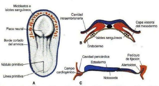 SISTEMA CARDIOVASCULAR DEL EMBRIÓN El sistema cardiovascular constituye el primer sistema importante en funcionar en el embrión. El corazón (primer órgano impar) y el sistema vascular primitivos aparece en la mitad de la tercera semana, cuando el embrión ya no es capaz de satisfacer sus requerimientos nutritivos y de oxígeno exclusivamente por difusión. En consecuencia, necesita un método eficiente para obtener el oxígeno y los nutrientes a partir de la sangre materna, y de eliminar el dióxido de carbono y los productos de desecho. El sistema vascular de embrión aparece en la mitad de la tercera semana. Las células cardiacas progenitoras se encuentran en el epiblasto, laterales a la línea primitiva, estas migran a través de la línea primitiva y las que migran en primer lugar son las células destinadas a formar los segmentos craneales del corazón y el tracto de salida, y luego lo hacen en orden sucesivo las células que forman las porciones más caudales siendo estas el ventrículo derecho, ventrículo izquierdo y el seno venoso respectivamente. Las células avanzan en dirección craneal y se disponen rostralmente a la membrana bucofaríngea y a los pliegues neurales, en esta se sitúa la hoja esplácnica de la lámina del mesodermo lateral. En este periodo, en el estadio presomita tardío del desarrollo, el endodermo faríngeo subyacente las induce a formar mioblastos cardiacos, los islotes sanguíneos también aparecen en el mesodermo, donde darán origen a células y vasos sanguíneos por el proceso de vasculogénesis. Con el transcurso del tiempo, los islotes unen y constituyen un tubo revestido de endotelio rodeado por mioblastos con forma de herradura. Esta se conoce como campo cardiogénico, la cavidad intraembrionaria situada por encima formará después la cavidad pericárdica. Además de la región cardiogénica, aparecen a ambos lados otros islotes sanguíneos que se disponen paralelamente y próximos a la línea media del campo embrionario. Los islotes forman un par de vasos longitudinales que son las aortas dorsales. FORMACIÓN Y POSICIÓN DEL TUBO CARDÍACO Inicialmente la porción central del área cardiogénica, está situada por delante de la membrana bucofaríngea y de la placa neural. No obstante, con el cierre del tubo neural y la formación de las vesículas cerebrales, el sistema nervioso crece en dirección cefálica y se extiende sobre la región cardiogénica central y la futura cavidad pericárdica. La membrana bucofaríngea es llevada hacia adelante mientras que el corazón y la cavidad pericárdica se sitúan primero en la región cervical y finalmente en el tórax, esto sucede por el crecimiento del cerebro y el plegamiento cefálico del embrión. A medida que el embrión se pliega en dirección cefalocaudal, de igual manera lo hace lateralmente. Como resultado, las regiones caudales de los tubos endoteliales del primordio cardiaco se fusionan, en excepto en su extremo caudal y en ese mismo tiempo la porción semilunar del área en forma de herradura se expande para constituir las futuras regiones del tracto de salida y ventricular, de esta manera, el corazón se convierte en un tubo en continua expansión que consiste del revestimiento endotelial interno y una capa miocárdica externa. Recibe el flujo desde su polo caudal, se da inicio a bombear la sangre del primer arco aórtico desde su polo craneal en dirección a la aorta dorsal. El tubo cardiaco en desarrollo sobresale gradualmente en la cavidad pericárdica. No obstante, al comienzo permanece adosado al lado dorsal de la cavidad pericardio por un pliegue de tejido mesodérmico, el mesocardio dorsal. No hay presencia de la formación del mesocardio ventral. Se desaparece el mesocardio dorsal y se forma un seno pericardio transverso que comunica ambos lados de la cavidad pericárdica. Ahora el corazón se halla suspendido en la cavidad por vasos sanguíneos, de su polo craneal y su polo caudal. Tubo endocárdico En el curso de estos fenómenos, el miocardio se va engrosando y secreta una capa de matriz extracelular, rica en ácido hialurónico, que lo separa del endotelio. Además, las células mesoteliales de la superficie del septum transvesum forman el proepicardio cerca del seno venoso y migran sobre el corazón para formar la mayor parte del epicardio. El resto del epicardio deriva de las células mesoteliales que se origina en la región del tracto de salida. De este modo, el tubo cardiaco está formado por tres capas: • Endocardio, que representa el revestimiento endotelial interno del corazón; • Miocardio, que constituye la pared muscular; • Epicardio o pericardio visceral, que cubre el exterior del tubo; Esta capa externa es necesaria para la formación de las arterias coronarias, incluidos sus revestimientos endoteliales y el musculo liso. FORMACIÓN DEL ASA CARDIACA A los 23 días, el tubo cardiaco comienza a incurvarse. La porción cefálica se pliega en dirección ventral y caudal (derecha), mientras que la porción articular Aorta dorsal M embrana bucofaringea Primer arco aórtico Intesti no anterior Mesocardio dorsal Intestino anterior C avidad peri c á rdia M anto miocárdio (caudal) va en dirección dorsocraneal (izquierda). Este plegamiento por cambios de la morfología celular, da lugar al Asa Cardiaca, se completa a los 28 días. La porción auricular, que al principio es una estructura situada por fuera de la cavidad pericárdica, forma una aurícula común y se incorpora. La unión auriculoventricular (estrecha) constituye el canal auriculoventricular, que comunica la aurícula común con el ventrículo embrionario primitivo. El bulbo cardiaco es estrecho en excepto en su tercio proximal. Esta región formara la porción trabeculada del ventrículo derecho. El cono arterial (porción media), formara los infundíbulos (tractos de salida) ventriculares. El tronco arterial (parte distal del bulbo), originara las raíces, la porción proximal de la aorta y la art