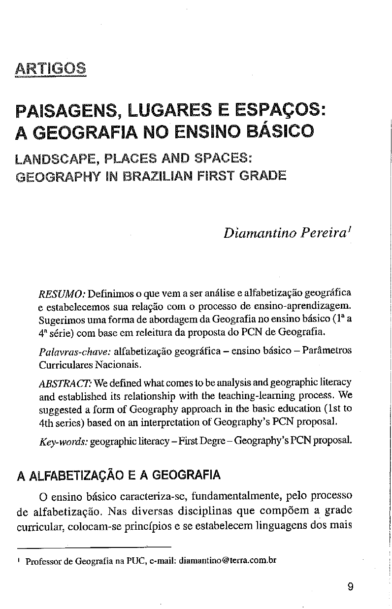 ARTIGOS PAISAGENS, LUGARES E ESPAÇOS; A GEOGRAFIA NO ENSINO BÁSICO LANDSCAPE, PLACES AMD SPACES: GEOGRAPHY SN BRA2ILSAN FIRST GRADE Diamantino Pereira1 RESUMO: Definimos o que vem a ser análise e alfabetização geográfica e estabelecemos sua relação com o processo de ensino-aprendizagem. Sugerimos uma forma de abordagem da Geografia no ensino básico ( Ia a 4a série) com base em releitura da proposta do PCN de Geografia. Palavras-chave: alfabetização geográfica- ensino básico-Parâmetros Curriculares Nacionais. ABSTRACT: We defined what comes to be analysis and geographic literacy and established its relationship with the teaching-leaming process. We suggested a form of Geography approach in the basic education (lst to 4th series) based on an interpretation of Geography’s PCN proposal. Key-words:geographicliteracy-FirstDegre-Geography’s PCN proposal. A ALFABETIZAÇÃO E A GEOGRAFIA 0 ensino básico caracteriza-se, fundamentalmente, pelo processo de alfabetização. Nas diversas disciplinas que compõem a grade curricular, colocam-se princípios e se estabelecem linguagens dos mais 1 Professor de Geografia na PUC, e-mail: diamantino@ terra.com.br 9 DIAMANTINO PEREIRA variados tipos que serão absorvidas pelos alunos como ferramentas de comunicação e de entendimento do mundo. Na disciplina Comunicação e Expressão, por exemplo, o aluno é alfabetizado do ponto de vista da escrita, da leitura e da expressão oral. A partir daí e cumulativamente, uma série de símbolos e regras que anteriormente não faziam o menor sentido, passam a compor um universo de signos e passam a integrar o universo do estudante. No caso da matemática a mesma coisa acontece com os números e suas operações: o aluno adquire progressivamente uma nova linguagem, torna-se capaz de se expressar através dela e desenvolve os fundamentos do raciocínio lógico. Qual a contribuição da geografia no processo de alfabetização da criança? Que contribuição específica essa disciplina pode acrescentar ao processo de aprendizagem pelo qual passa o aluno? A alfabetização, para a geografia, somente pode significar que existe a possibilidade do espaço geográfico ser lido e, conseqiientemente, entendido. Pode transformar-se, portanto, a partir disso, em instrumento concreto do conhecimento, em uma janela a mais para possibilitar o desvendamento da realidade pelo aluno. ALFABETIZAÇÃO GEOGRÁFICA Eu olho para uma paisagem e o que vejo? Simples elementos construídos social e/ou naturalmente? Não, as paisagens são as formas de um processo, são a aparência. Mas nós não falamos sempre que o que importa não é a aparência e sim a essência? Não a forma, mas o conteúdo? Triste caminho da reflexão baseada na caricatura da ilusão de que uma coisa pudesse existir sem a outra. Mas a aparência é manifestação concreta da essência, assim como a forma o é do conteúdo. O que tudo isso tem a ver com a paisagem e a Geografia? Como já afirmamos, a paisagem é a forma e a Geografia tem como método de análise partir, justamente, da paisagem, ou seja da forma dos fenômenos. Notem que eu falei “ partir” e não ficar estacionado na paisagem. 10 BOLETIM PAULISTA DE GEOGRAFIA, SÃO PAULO, n. 79, p. 9-21, 2003 Como eu posso partir de uma paisagem para analisar geograficamente uma realidade? Dando sentido para os elementos que nela estão contidos. O quer dizer isso concretamente? Quer dizer que temos queentender o conteúdo para podermos entender a forma e também admitir que ela, uma vez constituída, influencia tanto na própria forma, quanto no conteúdo. Quando observamos uma paisagem, começamos por identificar suas formas e seus componentes: o meio físico constituído pelas edificações, ruas, estradas, viadutos, rios, montanhas, vegetação, meios de transporte e deslocamento, as pessoas, suas vestimentas, seus procedimentos etc. Todas essas identificações podem ser representadas na forma de uma descrição, uma representação gráfica ou cartográfica. Independentemente dessas modalidades, entramos em contato com a forma que uma dada realidade assume para que possa existir: a sua espacialidade manifestada nas formas da paisagem. Para dar prosseguimento à análise geográfica, precisamos dar sentido para as formas paisagísticas que observamos, ou seja, por que as coisas estão dispostas daquela maneira e naquele lugar. Por que, por exemplo, num primeiro momento, eu posso ter uma paisagem urbana constituída fundamentalmente por residências, pela igreja e pela sede do poder político e militar, rodeados por campos agrícolas? Por que, em outro momento e/ou lugar aparece a fábrica no centro da área urbana já expandida? Por que, a seguir, as áreas centrais das cidades libertam-se da presença das fábricas que passam a se localizar em áreas mais periféricas? As paisagens vão se modificando, na medida em que se altera a dinâmica que as produz, ou seja, a sociedade, se modifica e, com isso, modifica suas paisagens, que são, então, a forma do novo conteúdo. A grande tentação é explicar tudo como se fosse uma história, como se fosse um desenrolar de fatos transcorrendo no tempo. Mas os fatos, ao acorrerem, constroem seu espaço e é por isso que, ao mudarem os fatos, muda também o seu espaço. AQUI TEMOS A ANáLISE GEOGRáFICA : em qualquer tempo, em qualquer lugar, em qualquer escala, sempre que 11 DIAMANTINO PEREIRA estiver analisando a distribuição territorial dos fenômenos e, portanto, como eles se organizam, pois isso não se dá de maneira aleatória. ALFABETIZAR GEOGRAFICAMENTE é, pois, dar sentido a essa espa- cialidadedos fenômenos. Mas, como estamos nos referindo a um processo de ensino-aprendizagem, é preciso que nos referenciemos pedagogi- camente para podermos construir, passo a passo, essa noção e esse ins- trumento de análise com o nosso aluno. Antes de tecer algumas considerações a respeito de algumas possibilidades de trabalhar com a noção de a