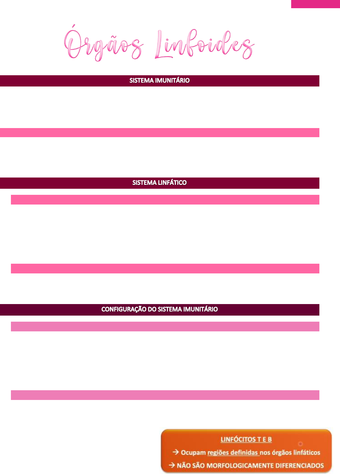 BBPM1 Histologia – AULA MARINA CÉLULAS ISOLADAS: Linfócitos, granulócitos e células do sistema mononuclear fagocitário TECIDOS: Tecido linfático difuso e Nódulos linfáticos (MALTs) ÓRGÃOS: Medula óssea, timo, linfonodos e baço FUNÇÃO DO SISTEMA IMUNITÁRIO -Capacidade de distinguir moléculas do corpo (SELF) e das moléculas estranhas (NON-SELF) -Identificar agressores levando a inativação ou destruição dessas moléculas -Responsáveis pelo desenvolvimento de doenças autoimunes CENTRAIS: Medula óssea e TIMO São órgãos de origem e maturação dos linfócitos -É, também, onde os linfócitos adquirem imunocompetência capacidade de reconhecer o que é selfie ou non-self -TODOS os linfócitos se originam na medula óssea -Alguns linfócitos precisam passar pelo timo para adquirir a imunocompetência -Após a maturação, os linfócitos seguem para os tecidos usam o sangue ou linfa para se locomover PERIFÉRICOS: Baço, linfonodos, MALTs Vão sofrer proliferação e diferenciação -Será onde os linfonodos entrará em contato com antígenos para o desencadeamento de uma resposta imunológica LINFÓCITOS B -5 a 10% dos linfócitos sanguíneos -Responsáveis pela resposta humoral síntese e secreção de anticorpos Ao migrar para o sítio de ação, podem ser ativados ocorre a diferenciação em plasmócitos plasmocitos possuem a capacidade de produzir anticorpos os anticorpos podem ser reconhecidos por macrófagos e neutrófilos, além de ativar o sistema complemento LINFÓCITOS T -Produzidos na medula óssea -Encaminhados para o timo diferenciação em T helper ou T citotóxico destinação a órgãos secundários -Responsáveis pela resposta celular -65 a 75 % dos linfócitos sanguíneos BBPM1 Histologia – AULA MARINA -Órgão linfático central -Órgão linfoepitelial localizado no mediastino, atrás do esterno e na altura dos grandes vasos do coração -Possui origem mesodérmica e endodérmica ENDODÉRMICA: O terceiro arco faríngio (um epitélio endodérmico de revestimento da faringe primitiva) dará origens a células que se diferenciará e migram para formar o timo MESODÉRMICA: A parte mesodérmica vem dos linfócitos T que vão povoar o timo -Possui 2 lobos envoltos por Cápsula de TECIDO CONJUNTIVO DENSO Dessa cápsula partem septos que vão dividir o timo em lóbulos incompletos -Na região de septos é possível encontrar vasos sanguíneos ORGANIZAÇÃO DO LOBO: 1. ZONA CORTICAL / CORTEX (c) Parte periférica,, mais corada (basofílica) e RICA EM LINFÓCITOS T 2. ZONA MEDULAR (M) Parte central menos corada só os linfócitos maduros chegam na região medular -A maturação dos linfócitos T ocorre no sentido C M Durante o processo de maturação 90% dos linfócitos sofrem apoptose pois respondem de forma errada os estímulos celulares -O córtex é mais corado que a medula pois no córtex possui MUITO mais linfócitos -O CORTEX E MEDULA POSSUEM O MESMO TIPO DE CÉLULAS, MAS EM PROPORÇÕES DIFERENTES LINFÓCITOS T -Origem: mesodérmica Vieram da medula óssea -Tipo celular predominante -Núcleos mais corados -Em diversos estágios de maturação -Abundante no córtex -é comum encontrar macrófagos e células apresentadoras de antígenos CÉLULAS RETICULARES EPITELIAIS -Origem endodérmica -Possui núcleo grande e cromatina fina núcleo pouco corado Nucléolo evidente Citoplasma com numerosos prolongamentos -Não produzem fibras reticulares são os prolongamentos citoplasmáticos que dão sustentação ao timo -As CRE adjacentes são unidas pelos seus prolongamentos citoplasmáticos por meio do DESMOSSOMOS BBPM1 Histologia – AULA MARINA -Formam retículo na região cortical e medular através de seus prolongamentos celulares -Formam camadas em volta dos vasos sanguíneos do timo -Formam CORPÚSCULOS DE HASSAL na região medular Acredita-se que as células reticulares epiteliais ao envolverem e dar sustentação aos linfócitos T em maturação, são capazes de estimular a proliferação e diferenciação de linfócitos T no timo -As células reticulares epiteliais envolvem capilares sanguíneos na região cortical: No córtex, os linfócitos estão passando pelo processo de imunocompetência (aprendendo a reconhecer o que é selfie de non-selfie) se por acaso alguma partícula estranha saísse da corrente sanguínea e entrasse em contato com os linfócitos T ia prejudicar todo o desenvolvimento da imunocompetência não seriam capaz de promover uma resposta imune correta -Já na região da medula, não há células reticulares epiteliais envolvendo os vasos os linfócitos T já são imunocomprometidos BBPM1 Histologia – AULA MARINA BARREIRA HEMATOTÍMICA -Localizada na região cortical 1. Capilares com endotélio sem poros e envoltos por periquitos 2. Células reticulares epiteliais envolvem os capilares 3. Lâmina basal espessa (lâmina basal endotelial + lâmina basal das células reticulares) -Serve para dificultar a entrada de macromoléculas estranhas presentes no sangue na camada cortical Proteção aos linfócitos T em desenvolvimento) -Só possui vasos linfáticos eferentes ZONA CORTICAL -Obtenção de células T imunologicamente competentes -Ocorre a eliminação dos linfócitos T que não reconhecem MHC próprios (self) acontece a seleção e a imunocompetência dos linfócitos 1. LINFOCITOS T vem da medula óssea origem mesodérmica pois vem de células precursoras do sangue -TIMÓCITOS: Linfocitos que estão no processo de maturação 2. CÉLULAS RETICULARES EPITELIAIS: origina-se da terceira bolsa faríngea (endodérmica) -Separa o córtex da cápsula do TC CAMADA ENTRE A CAMADA DE tc E CORTEX -Envolve elementos vasculares abraçar os vasos sanguíneos -Possuem prolongamentos celulares unidos por desmossomos -Isolam córtex de medula separando as células do córtex e medula 3. MACRÓFAGOS E CÉLULAS APRESENTADORAS DE ANTÍGENO ZONA MEDULAR -Menor população de linfócitos linfócitos T imunocompetentes -Grande número de células r