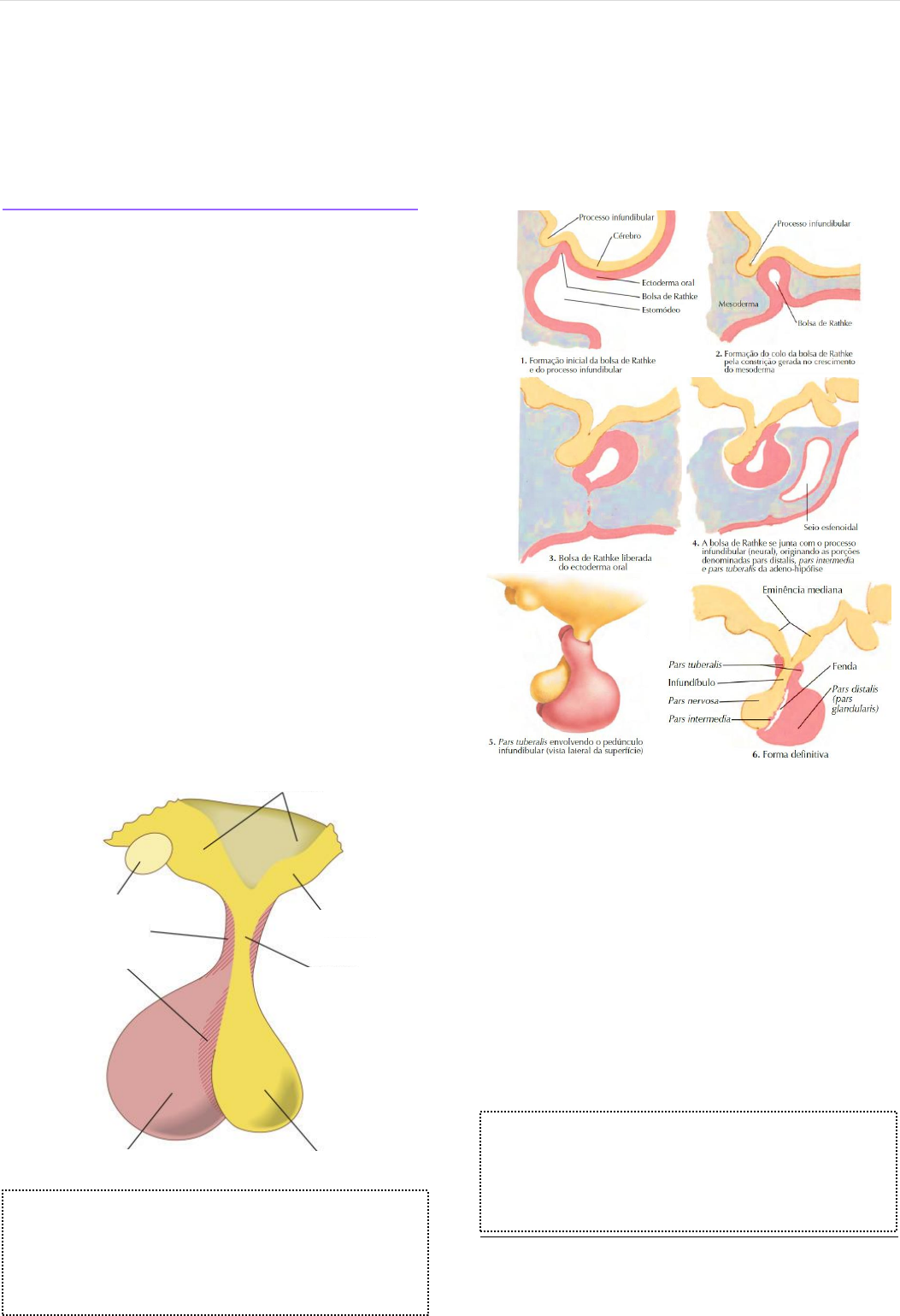 2 0 2 0 . 1 J Ú L I A M O R A I S 1 4 3 ( 2 0 1 9 . 2 ) | 1 HISTOLOGIA II AULA 1 – SISTEMA ENDÓCRINO Hipófise, tireoide e paratireoide HIPÓFISE É uma glândula endócrina, responsável pela produção de hormônio tróficos, os quais estimulam a ação de outras glândulas. Está localizada abaixo do hipotálamo, no interior do osso esfenoide, mais especificamente na fossa hipofisário ou sela túrcica, revestida pela dura-máter. O talo hipofisário, também conhecido como haste ou infundíbulo, conecta a hipófise a base do cérebro, na eminência média do hipotálamo. Ela possui um lobo posterior, denominado neuro- hipófise, constituído por axônios de neurônios do hipotálamo e sustentados por células de pituícitos. Além dele, temos o lobo anterior, chamado de adeno-hipófise. Possui cordões celulares intercalados por vasos sanguíneos, responsáveis pela síntese de hormônios, sendo assim considerada uma glândula cordonada. Para produzir hormônios ela é estimulada por núcleos neuronais do hipotálamo. É subdividida em parte distal, intermediária e tuberal. A parte distal é a parte funcional, tendo como função a produção da maior parte dos hormônios e a parte intermediária produz o hormônio estimulado de melanócitos. A eminência média é o local de onde surgem os neurônios, os quais formam os núcleos neuronais. EMBRIOLOGIA ADENO-HIPÓFISE A adeno-hipófise é envolvida por uma cápsula de tecido conjuntivo e constituída por um epitélio glandular cordonado com cordões intercalados de vasos sanguíneos de paredes fenestradas. É composta por dois tipos celulares, as cromófilas, que possuem afinidade por corantes, e as cromófobas, que não possuem. As células secretoras são cromófilas e divididas em acidófilas e basófilas, nas quais as mais abundantes são acidófilas. As células acidófilas (eosina) são as somatotróficas, que poduzem GH pelo estímulo do GHRH, e as mamotróficas, que produzem prolactina pelo estímulo do PRH e oxcitocina. As células basófilas (hematoxilina) são as adenocorticotróficas, que produzem ACTH pelo estímulo do CRH, as gonadotróficas, que produzem Dentre os núcleos neuronais hipotalâmicos, os mais importantes a saber são o núcleo paraventricular, responsável pela produção de ocitocinas, e o núcleo supraóptico, responsável pela produção de ADH. O corante orange G (amarelo) é capaz de diferenciar as células somatotróficas das mamotróficas, corando somente as somatotróficas. A eritrosina (vermelho) também auxilia nessa diferenciação, corando apenas as mamotróficas. HIPOTÁLAMO QUIASMA ÓPTICO PARTE TUBERAL PARTE INTERMEDIÁRIA EMINÊNCIA MÉDIA PARTE NERVOSA PARTE DISTAL TALO HIPOFISÁRIO 2 0 2 0 . 1 J Ú L I A M O R A I S 1 4 3 ( 2 0 1 9 . 2 ) | 2 FSH e LH pelo estímulo do GnRH, e as tireotróficas, que prodruzem TSH pelo estímulo do TRH. O P.A.S. (aldeído tionina) cora as células basófilas, as tireotróficas têm seus grânulos corados de violeta, as gonadotróficas se coram de azul e as células adrenocorticotróficas se coram de vermelho. As células cromófobas provavelmente são células cromófilas, as quais ainda não produziram grânulos secretores ou que já eliminaram seus grânulos. ACIDÓFILAS HEMÁCIAS HEMÁCIAS BASÓFILAS BASÓFILAS ACIDÓFILAS HEMÁCIAS HEMÁCIAS CROMÓFOBAS HEMÁCIAS CROMÓFOBAS BASÓFILAS HEMÁCIAS ACIDÓFILAS HEMÁCIAS BASÓFILAS ACIDÓFILAS NEURO-HIPÓFISE ADENO-HIPÓFISE 2 0 2 0 . 1 J Ú L I A M O R A I S 1 4 3 ( 2 0 1 9 . 2 ) | 3 NEURO-HIPÓFISE É a parte nervosa, constituída por prolongamentos amielínicos de axônios de neurônios hipotalâmicos, nos núcleos supra-óptico e paraventricular. Tem a formação de corpos de Hering, onde encontramos um acúmulo de neurossecreções no interior do axônio. Responsável pelo armazenamento e secreção de ADH e ocitocina, produzidos nos núcleos hipotalâmicos. Próximos aos axônios temos os pituícitos, que são células da glia especializadas, responsáveis por fornecer suporte. Os núcleos vistos nas lâminas são dos pituícitos. TIREOIDE É uma glândula endócrina, localizada anteriormente à traqueia, a qual possui um formato de escudo contendo dois lobos, um esquerdo e um direito, unidos por um istmo. A glândula tireoide é responsável pela secreção dos hormônios tiroxina (T4), triiodotironina (T3) e calcitonina. Está organizada em vesículas de epitélio cúbico simples, que contém um coloide, essas células cúbicas são chamadas de tireócitos. Entre os tireócitos e a membrana basal, encontramos a célula parafolicular ou célula C. A tireoide é revestida com uma capsula de tecido conjuntivo, a qual emite projeções para dentro da glândula, sendo encontrada entre as vesículas. Dessa forma, temos tecido conjuntivo frouxo com capilares sanguíneos circundando as vesículas. Os tireócitos apresentam um núcleo basófilo e citoplasma acidófilo, estão envolta do coloide extremamente glicoproteico, sendo assim corado intensamente. SISTEMA PORTA-HIPOFISÁRIO Temos um plexo capilar primário no infundíbulo, dele partem as vênulas e pequenos vasos, os quais seguem para a parte distal da adeno-hipófise, formando um plexo capilar secundário. PITUÍCITOS CORPOS DE HERING AXÔNIOS TECIDO CONJUNTIVO (CÁPSULA) VESÍCULAS/FOLÍCULOS VESÍCULAS/FOLÍCULOS COLOIDE TECIDO CONJUNTIVO CAPILAR SANGUÍNEO COLOIDE CÉLULA PARAFOLICULAR/ CÉLULA C CÉLULA FOLICULAR/ TIREÓCITO CÉLULA FOLICULAR/ TIREÓCITO COLOIDE CAPILAR SANGUÍNEO 2 0 2 0 . 1 J Ú L I A M O R A I S 1 4 3 ( 2 0 1 9 . 2 ) | 4 PARATIREOIDE São quatro glândulas cordonadas minúsculas, encontradas em pares nas partes superior e inferior da tireoide. São envoltas por uma capsula de tecido conjuntivo e compostas por células principais, as quais produzem o hormônio da paratireoide. As células cordonadas apresentam um citoplasma reduzido e os núcleos ficam próximos uns aos outros. CÉLULAS PRINCIPAIS CÉLULAS PRINCIPAIS PARA