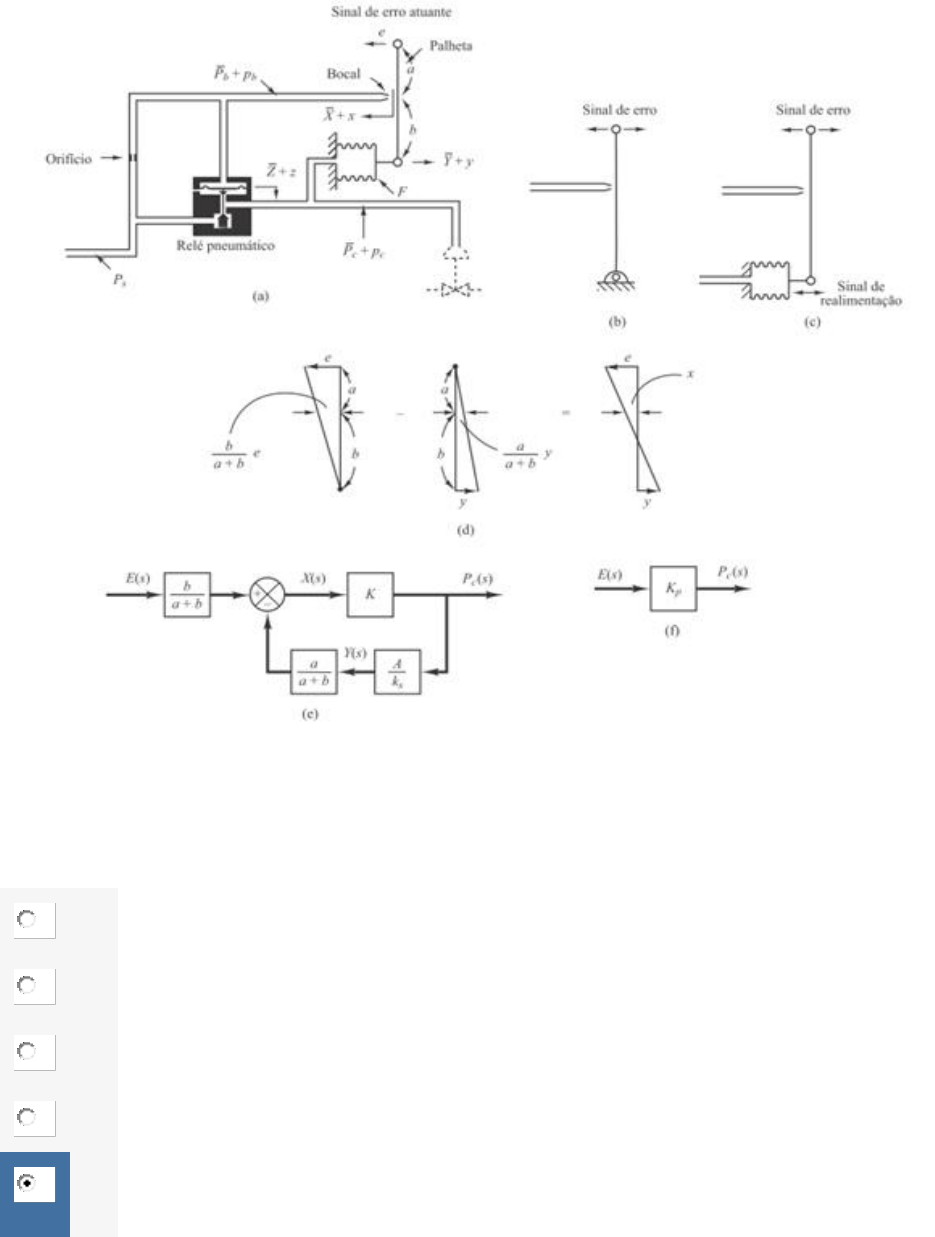 APOL 2 - TÓPICOS DE SISTEMAS DINÂMICOS Questão 1 - TÓPICOS DE SISTEMAS DINÂMICOS - ELETIVA Observe a imagem: "[...] (a) diagrama esquemático de um controlador pneumático; (b)paleta montade em um ponto fixo; (c) paleta montada em um fole de realimentação;(d) deslocamento x; (e)diagrama de blocos; (f) diagrama de blocos simplificado do controlador. Fonte: imagem retirada do livro base OGATA, Katsuhiko. Engenharia de controle moderno. São Paulo: Pearson Education do Brasil, 2014. , p. 103 A imagem acima retirada do livro base Engenharia de controle moderno apresenta os 6 passos de um tipo de controlador. Com base nisso, assinale a alternativa que apresenta o tipo de controlador representado na figura acima. A Bocal-palheta B Nozzle-flapper C Pressão-pneumático D Pressão-paleta E Força-distância Comentário: Na página 103, temos: Questão 2 - TÓPICOS DE SISTEMAS DINÂMICOS - ELETIVA Leia a citação: "Algumas análises industriais, referem-se a componentes com 'superfície livre', por sem um meio versátil para a transmissão de sinais e força". Após esta avaliação, caso queira ler o texto integralmente, ele está disponível em: OGATA, Katsuhiko. Engenharia de controle moderno. São Paulo: Pearson Education do Brasil, 2014. p.91 Considerando a citação e os conteúdos do livro-base Engenharia de controle moderno, o texto acima refere-se a um conjunto de componentes de ampla aplicabilidade em componentes térmicos. Assinale a alternativa que apresenta corretamente o componente abordado no texto. A O componente abordado é o plasma, por causa dos seus elementos termodinâmicos. B O componente abordado é o plasma, pois possui características de grande valia dentro dos aspectos termodinâmicos. C O componente abordado é a água, por causa da sua transmissão integral de força. D O componente abordado é a água, por causa do seu potencial de refrigeração e de substancial importância em meios termodinâmicos. E O componente abordado são os fluídos (líquidos e gases), justamente por não ter uma forma fixa e se adequar ao ambiente em que se encontra. Comentário: na página 91, temos: Questão 3 - TÓPICOS DE SISTEMAS DINÂMICOS - ELETIVA Leia a citação: "A utilização de fluídos (seja de natureza líquida ou gasosa) traz grande aplicabilidade em sistemas em que é necessária a transmissão de força. Em casos específicos, a incompressibilidade dos líquidos é de grande valia pelo fato de possuir uma superfície livre". Após esta avaliação, caso queira ler o texto integralmente, ele está disponível em: OGATA, Katsuhiko. Engenharia de controle moderno. São Paulo: Pearson Education do Brasil, 2014. p.91 Considerando a citação e os conteúdos do livro-base Engenharia de controle moderno, o texto acima refere-se a componentes que necessitam uma transmissão integral da força, pois os líquidos possuem a característica de ter uma superfície livre. Assinale a alternativa que apresenta a área da engenharia responsável pelos estudos que referem-se a líquidos. A Pneumática B Mecânica C Elétrica D Hidráulica Você acertou! Comentário: No capítulo 4, o termo hidráulico refere-se aos sistemas que apresentam óleo na sua aplicação (p.92) E Térmica Questão 4 - TÓPICOS DE SISTEMAS DINÂMICOS - ELETIVA Leia o texto: Um fábrica de chocolate possui, na sua parte superior, o misturador (onde misturam-se os ingredientes para produzir chocolate). Depois de pronto, o chocolate aquecido desce por tubulações onde é colocado em formas, passa por um túnel de refrigeração, quando chega ao formato de barra como produto final. Fonte: Texto produzido pelo autor da questão. Analisando a situação descrita acima, temos uma coluna de chocolate derretido (interna ao cilindro) com 2 metros de altura e a sua vazão é de 20 litros por segundo (0,02 m3/s). Considerando essas informações e os conteúdos do livro-base Engenharia de controle moderno, assinale a alternativa que apresenta o valor do coeficiente (K), em metros quadrados por segundos, dessa fábrica de chocolate. A 0,01 m2/s Você acertou! Comentário: Comentário: Utilizando a equação da página 92, temos Q = K.H ? K = Q/H = 0,02/2 = 0,01 m2/s B 0,02 m2/s C 0,03 m2/s D 0,04 m2/s E 0,05 m2/s Questão 5 - TÓPICOS DE SISTEMAS DINÂMICOS - ELETIVA Leia a citação: "A capacitância do sistema de pressão depende do tipo do processo de expansão envolvido. A capacitância pode ser calculada pela aplicação dos gases perfeitos. A equação envolvida é: Após esta avaliação, caso queira ler o texto integralmente, ele está disponível em: OGATA, Katsuhiko. Engenharia de controle moderno. São Paulo: Pearson Education do Brasil, 2014. p.98. Considerando a citação e os conteúdos do livro-base Engenharia de controle moderno, podemos perceber as diversas atuações que operam em um sistema fechado. Assinale a alternativa que apresenta a representação correta da letra n na equação. A Pressão absoluta B Constante universal dos gases C Volume específico D Massa molar E Expoente politrópico Comentário: na página 98, temos uma descrição mais ampla dentro do contexto pneumático. Questão 6 - TÓPICOS DE SISTEMAS DINÂMICOS - ELETIVA Leia a citação: "Uma das características de controladores pneumáticos é que praticamente todos empregam válvulas atuadoras". Após esta avaliação, caso queira ler o texto integralmente, ele está disponível em: OGATA, Katsuhiko. Engenharia de controle moderno. São Paulo: Pearson Education do Brasil, 2014. p.106. Considerando a citação e os conteúdos do livro-base Engenharia de controle moderno, assinale a alternativa que justifica corretamente a aplicação de tais válvulas em sistemas pneumáticos. A Pode produzir uma grande potência de saída. Comentário: Na página 106, temos a descrição dos elementos. B Controla o torque das máquinas C Regula o controle de oxigênio D Controla os elementos de fluxo de Nitrogênio E Apresenta dispositivo híb