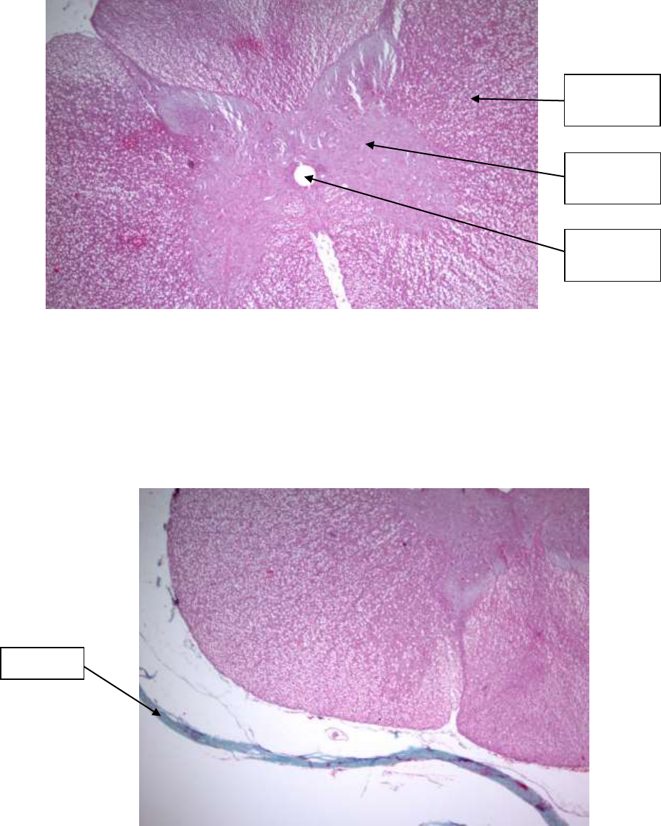 PRÁTICA 09 -TECIDO NERVOSO Lâmina - Corte de medula espinhal e gânglio Coloração: Tricrômico de Gomori Medula espinhal (40X) Observe, na medula, uma área de coloração mais clara. Esta área corresponde à substância branca. Além dela, existe uma região mais escura, central, com a forma de H, que corresponde à substância cinzenta. Note que a substância cinzenta apresenta 2 cornos anteriores (mais globosos) e dois posteriores, de tamanho menor. Medula espinhal (40X) Substância branca Substância cinzenta Canal medular Pia-máter Colado ao tecido nervoso, na sua periferia, está um tecido conjuntivo, corado em verde. É a pia-mater. Daí partem septos, com vasos sanguíneos, que penetram na medula até uma certa distância. Medula espinhal (100X) Medula espinhal (1000X) Observe a substância branca, mais externa que a cinzenta; aí vamos encontrar numerosas fibras nervosas cortadas transversalmente. Estas fibras, mielínicas,constituem-se de um ponto negro correspondente ao axônio e em volta dele Substância branca Substância cinzenta Neurônios motores Núcleos de céls da neuróglia Fibra nervosa Bainha de mielina a bainha de mielina (em imagem negativa). Por fora existe um contorno rosa escuro – são restos de uma trama proteica. Passe para a substância cinzenta. Procure identificar os neurônios motores. Seus corpos, as únicas partes que aparecem, têm a forma estrelada. Além disso, seus núcleos vesiculados são facilmente identificados, principalmente pelo nucléolo, corado em vermelho. Note também, próximo a estes neurônios motores, um grande número de pequenos núcleos. São núcleos de células da neuroglia. Gânglio (400X) Observe ao MO o corte de gânglio. Ele é o menor da lâmina (o outro é de medula). Verifique que o gânglio também está envolto por um tecido conjuntivo (em verde), a pia- mater. Na parte central do gânglio ocorrem neurônios do tipo pseudounipolar. Eles são globosos, grandes, apresentando núcleo vesiculoso e nucléolo bem evidenciável. Desenhe abaixo o que você observou.