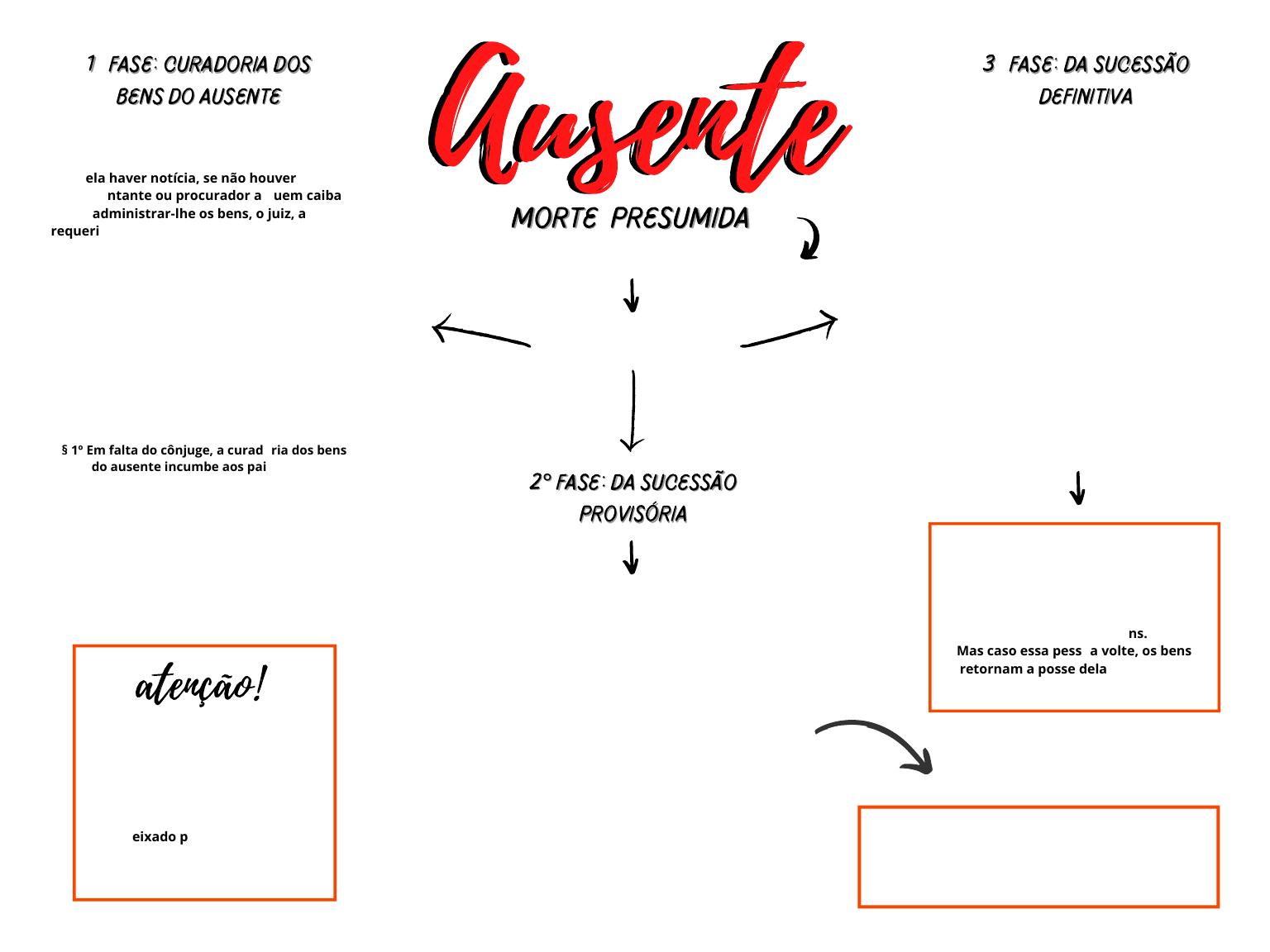Depois de um ano da arrecadação dos bens do ausente, ou três anos, e se ele não tenha deixado representante ou procurador, podem os interessados, requerer a abertura da sucessão provisória. Consideram-se interessados, as pessoas a quem se confere legitimidade para requerer a abertura da sucessão provisória segundo o Art. 27° : a) o cônjuge não separado judicialmente; b) os herdeiros presumidos, legítimos ou testamentários; c) os que tiverem sobre os bens do ausente direito dependente de sua morte; d) os credores de obrigações vencidas e não pagas. AusenteAusente 2° FASE: da sucessão2° FASE: da sucessão provisóriaprovisória § 1º Em falta do cônjuge, a curadoria dos bens do ausente incumbe aos pais ou aos descendentes, nesta ordem, não havendo impedimento que os iniba de exercer o cargo. § 2º Entre os descendentes, os mais próximos precedem os mais remotos. § 3º Na falta das pessoas mencionadas, compete ao juiz a escolha do curador. se declara sem decretação de ausência mortemorte presumidapresumida Art. 22° ao 39° 1° FASE: CURADORIA DOS1° FASE: CURADORIA DOS BENS DO AUSENTEBENS DO AUSENTE Art. 22° Desaparecendo uma pessoa do seu domicílio sem dela haver notícia, se não houver deixado representante ou procurador a quem caiba administrar-lhe os bens, o juiz, a requerimento de qualquer interessado ou do Ministério Público, declarará a ausência, e nomear-lhe-á curador. Art. 25° O cônjuge do ausente, sempre que não esteja separado judicialmente, ou de fato por mais de dois anos antes da declaração da ausência, será o seu legítimo curador. INCISOS: atenção! A curadoria dos bens do ausente é a primeira fase do processo de sucessão de ausentes, em regra tem a duração de um ano, ou excepcionalmente de três anos na hipótese do ausente ter deixado procurador ou representante. Caso termine os prazos acima e não houver nenhum interessado à sucessão provisória, cumpre ao Ministério Público requere-la ao juízo competente. 3° FASE: da sucessão3° FASE: da sucessão definitivadefinitiva Sucessão definitiva é a fase da ausência após o tempo estipulado de 10 anos onde é declarada a morte da pessoa, após declarada a morte os herdeiros entram na posse e na propriedade dos bens. Mas caso essa pessoa volte, os bens retornam a posse dela do jeito que estão Art. 37° Dez anos depois de passada em julgado a sentença que concede a abertura da sucessão provisória, poderão os interessados requerer a sucessão definitiva e o levantamento das cauções prestadas Art. 39° Regressando o ausente nos dez anos seguintes à abertura da sucessão definitiva, ou algum de seus descendentes ou ascendentes, aquele ou estes haverão só os bens existentes no estado em que se acharem, os sub-rogados em seu lugar, ou o preço que os herdeiros e demais interessados houverem recebido pelos bens alienados depois daquele tempo