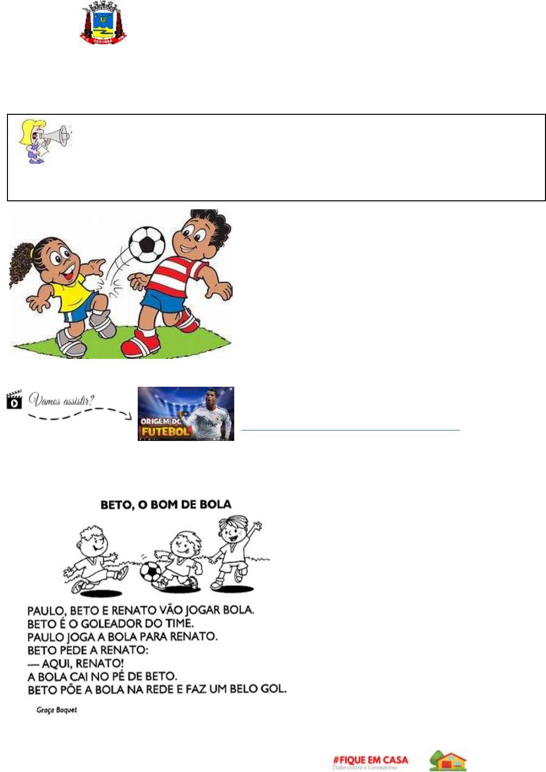 MUNICÍPIO DE CORUMBÁ SECRETARIA MUNICIPAL EDUCAÇÃO ROTEIRO DE ESTUDO – 1º ANO DO ENSINO FUNDAMENTAL Bloco 2 VOCÊ SABE A ORIGEM DO FUTEBOL? ESSE ESPORTE QUE FICOU CONHECIDO POR PRATICAMENTE TODOS OS PAÍSES, E HOJE EM DIA É O MAIS POPULAR DO MUNDO! EXISTEM VÁRIOS TIMES, MILHARES DE JOGADORES PROFISSIONAIS, E DIVERSOS ESTÁDIOS ESPALHADOS POR TODO O PLANETA. DESCUBRA AGORA NESSE VÍDEO COMO SURGIU O FUTEBOL DE UMA FORMA DIVERTIDA E DE CURTO PRAZO. Click no link para assistir o vídeo: “ A origem do futebol”. https://www.youtube.com/watch?v=dx-OQdxW9Io. 1- LEIA O TEXTO ABAIXO: 2-APÓS A LEITURA “BETO, O BOM DE BOLA”, ESCREVA NO CADERNO DE LÍNGUA PORTUGUESA OS NOMES DOS MENINOS QUE APARECEM NO TEXTO. TODAS AS ATIVIDADES DEVEM SER REALIZADAS NO CADERNO DE CADA DISCIPLINA COM A AJUDA DE UM RESPONSÁVEL. CASO POSSUA APENAS UM CADERNO PODEM SER ORGANIZADAS DA MESMA FORMA. ATENÇÃO! https://www.youtube.com/watch?v=dx-OQdxW9Io MUNICÍPIO DE CORUMBÁ SECRETARIA MUNICIPAL EDUCAÇÃO 2- AGORA ESCREVA NO CADERNO DE LÍNGUA PORTUGUESA AS PALAVRAS DO TEXTO QUE TERMINAM COM A LETRA O. 3- PESQUISE E ESCREVA NO CADERNO DE LÍNGUA PORTUGUESA COM AJUDA DA FAMÍLIA, 5 (CINCO) PALAVRAS QUE VOCÊ CONHECE QUE COMEÇA COM A LETRA B. Click no link para assistir o vídeo: Futebol com a Masha. https://youtu.be/_NS5ywDB6EY. 4- AGORA ESCREVA NO CADERNO DE LÍNGUA PORTUGUESA COM AJUDA DA FAMÍLIA, 2 (DOIS) NOMES DE JOGADORES DE FUTEBOL QUE VOCÊ CONHECE. 5- DE ACORDO COM O TEXTO, BETO É O GOLEIRO DO TIME, NO CADERNO DE MATEMÁTICA DESENHE 12 (DOZE) BOLAS, QUE EQUIVALE A QUANTIDADE DE GOL QUE BETO PEGOU. 6- RENATO MARCOU 2 GOL E PAULO MARCOU 1 GOL. QUANTOS GOLS OS DOIS MARCARAM JUNTOS? NO CADERNO DE MATEMÁTICA ESCREVA O NÚMERO CORRESPONDENTE. Click no link para assistir o vídeo: “Contando até 10”. https://youtu.be/4cPyEghUEr4. https://youtu.be/_NS5ywDB6EY https://youtu.be/4cPyEghUEr4 MUNICÍPIO DE CORUMBÁ SECRETARIA MUNICIPAL EDUCAÇÃO 7- BETO, ORGANIZOU UM JOGO DE FUTEBOL COM A TURMA DA ESCOLA. O 1º ANO A TINHA 6 JOGADORES E O 1º ANO B TINHA 5 JOGADORES, POIS SANDRO TINHA MACHUCADO O PÉ. NO CADERNO DE MATEMÁTICA DESENHE A QUANTIDADE DE JOGADORES QUE PARTICIPARAM DO JOGO. 8- O JOGO DE FUTEBOL É UM MOMENTO DE DESCONTRAÇÃO E QUE MUITAS FAMÍLIAS PARTICIPAM JUNTAS. NO CADERNO DE HISTÓRIA DESENHE AS PESSOAS QUE MORAM COM VOCÊ E OS TIMES QUE ELES TORCEM. 9- AS FAMÍLIAS NÃO PRECISAM SER IGUAIS, NEM DESENVOLVER AS MESMAS ATIVIDADES E NEM PENSAR IGUAL. PORÉM, TEM QUE TER O RESPEITO E AFETIVIDADE UNS COM OS OUTROS. NO CADERNO DE GEOGRAFIA DESENHE O QUE VOCÊ MAIS GOSTA DE FAZER JUNTO COM A SUA FAMÍLIA. 10- PERTO DO CAMPINHO QUE BETO JOGA BOLA, TEM UM PÉ DE IPÊ-AMARELO. VOCÊ SABIA QUE O IPÊ-AMARELO É CONSIDERADO O SÍMBOLO DO BRASIL? NO CADERNO DE CIÊNCIAS DESENHE UM PÉ DE IPÊ E PINTE ELE NA COR AMARELA OU NA COR QUE VOCÊ PREFERIR. MUNICÍPIO DE CORUMBÁ SECRETARIA MUNICIPAL EDUCAÇÃO 11- ASSISTA O VÍDEO DE UMA PARTIDA DE FUTEBOL COM CLEO E CUQUIN. E NO SEU CADERNO DE ARTES DESENHE A SUA PARTIDA DE FUTEBOL. Click no link para assistir o vídeo: Uma partida de futebol. https://youtu.be/xu-NxywteSQ. ATIVIDADES DE LÍNGUA ESTRANGEIRA MODERNA (LÍNGUA INGLESA OU LÍNGUA ESPANHOLA) ESCOLHA DE ACORDO COM A DISCIPLINA QUE A SUA ESCOLA OFERECE Língua Inglesa: 12- EM SEU CADERNO DE LÍNGUA INGLESA DESENHE UMA BOLA DE FUTEBOL (SOCCER BALL) E PINTE COM AS SEGUINTES CORES: Click no link para assistir o vídeo. As cores em inglês. https://youtu.be/TqJENud9wdc. https://youtu.be/xu-NxywteSQ https://youtu.be/TqJENud9wdc MUNICÍPIO DE CORUMBÁ SECRETARIA MUNICIPAL EDUCAÇÃO Língua Espanhola 13-OBSERVE O CONVITE DE ANIVERSÁRIO DE JUAN E RESPONDA NO SEU CADERNO DE LÍNGUA ESPANHOLA. ¿QUÉ EDAD COMPLETARÁ JUAN EN SU CUMPLEAÑOS? Click no link para assistir o vídeo. ¡Feliz cumpleaños! | Mickey Mouse. https://youtu.be/jVRc-K5xDmU. https://youtu.be/jVRc-K5xDmU