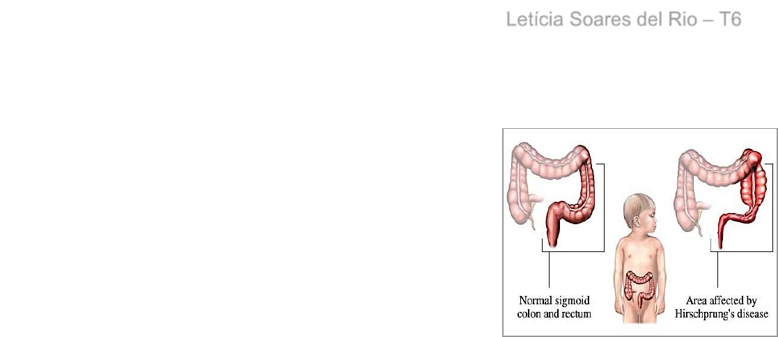 Letícia Soares del Rio – T6 MEGACOLON CONGÊNITO Doença de Hirschsprung Quadro clínico de obstrução colonica funcional Agangliose intestinal congênita Mais no sexo masculino História familiar Neurocristopatia: Para da migração das céls ganglionares da crista neural para o TGI Principalmente no canal anal, reto e sigmoide Segmento ultracurto (canal anal) – 20% Agangliose total é rara Ausência de céls ganglionares nos plexos de Meissner (submucoso) e de Auerbach (mioentérico) Aumento das fibras neurais colinérgicas Perda da atividade motora peristáltica normal Aumento do tônus da parede do segmento afetado – funciona como obstáculo funcional Dilatação do segmento intestinal à jusante Acúmulo de grande quantidade de fezes = fecaloma Mecanismo da motilidade: Alteração na inervação autônoma Contração do m. liso: fibras colinérgicas pré ganglionares Relaxamento do m. liso: fibras adrenérgicas pós-ganglionares e fibras não adrenérgicas/colinérgicas NO (óxido nítrico) = neurotransmissor Genética: Herança autossômica dominante ou recessiva Alterações mais comuns - mutações no proto oncogene Ret - no gene EDNRB, END3 Pode estar associada a outras neurocristopatias: neoplasias endócrinas múltiplas, carcinoma medular tireoidiano, síndrome de Waadenburg Outras associações: macroftalmia, enoftalmia, glaucoma, neuroblastoma, feocromocitoma, neoplasia endócrina múltipla II, síndrome de Down, alterações GI, GU e cardíacas Quadro clínico: ➢ Em lactentes e bebês Distensão abdominal Sem evacuação ao nascimento (24-48h) Quadro de obstrução intestinal Vômitos Toque retal explosivo Enterocolite (< 2 anos) Megacolo tóxico ➢ Em crianças maiores Constipação crônica (vários dias sem evacuar – 3 a 15 dias) Massa abdominal palpável (fecaloma) Fezes grandes Encompresse ou Soiling Megacolo tóxico Megacolo tóxico: Quadro infeccioso, sepse Distensão abdominal importante Hiperemia da parede abdominal Diarreia sanguinolenta Alta taxa de mortalidade Diagnóstico: • Raio x simples • Enema baritado sem preparo intestinal • Enema opaco • Raio x retardado – 24h após o enema • Megacolo total • Manometria anorretal = mostra a ausência do reflexo reto-anal inibitório (RIRA) Relaxamento do esfíncter interno em resposta a distensão retal Depende da integridade dos plexos intramurais Ausente em 100% na doença de Hirschprung • Biopsia retal Padrão ouro Cirúrgica: via aberta ou videolaparoscopia Por sucção: via retal (pinça de Noblett) Características histológicas = ausência de céls ganglionares, hiperplasia de fibras nervosas na lâmina própria e muscular Estudo imuno-histoquímico: atividade da acetilcolinesterase (AChE), sintetase de NO, calretinina Ausência de calretina (proteína que se liga ao Ca) = agangliose Raio x simples Enema opaco Megacolo total Cone de transição: Ausência do cone não exclui a aganglionose 75% dos neonatos com doença de Hirshsprung apresentam o cone de transição Conduta: ✓ Obstipação / fecaloma Tratamento clínico até o diagnóstico definitivo Lavagens intestinais, laxantes ✓ Quadro de obstrução SNG aberta Reposição hidroeletrolítica Antibióticoterapia ✓ Descompressão mecânica Sonda retal Cirurgia: colostomia 80% dos casos ✓ Perfuração do colo (megacolo tóxico) Cirurgia Tratamento cirúrgico: Colostomia (duas bocas) Cirurgia definitiva – abaixamento do colo o Duhamel Abaixamento retroretal endoanal e transanal o Soave Abaixamento endorretal: mucosectomia retal preservando o esfíncter interno e anastomose colo- anal o Swenson Ressecção do segmento agangliônico + anastomose colo-retal próximo à linha pectínea com a preservação do esfíncter interno o De la Torre Mondragon Abaixamento transanal (pull throug) por descolamento submucoso retal o Georgesson Videolaparoscopia + tempo perineal Complicações pós-operatórias: Estenose cicatricial Enterocolite, megacolo tóxico Encopresse Incontinência fecal e urinária (lesão nervosa) Constipação Disfunção sexual (lesão nervosa) ANOMALIA ANORRETAL Ânus imperfurado Defeito congênito do ânus, reto e trato urogenital 70-80% fístula retal -> períneo, genitália externa, trato urogenital Anomalias altas (mais em meninos) Anomalias baixas (meninas) Malformações associadas 20-54%: GI, GU, cardíacas Divisão da cloaca primitiva na 5ª-7ª semana Tipos de anomalias: 1. Fístula reto vesical 2. Fístula reto uretral 3. Fístula reto vaginal 4. Fístula reto vestibular 5. Fístula reto perineal 6. Atresia retal 7. Estenose anal Sexo masculino: fístula reto uretral Sexo feminino: fístula reto vestibular 5% ânus imperfurado sem fístula (síndrome de Down) Atresia real < 1% “Alça de balde” Classificação: AAR alta ou baixa Em relação ao fundo do reto: acima ou abaixo do m. levantador do ânus – elemento mais importante na continência fecal Invertograma Wangesteen rice AAR baixa: Saída de mecônio por fístula perineal ou rafe escrotal Ânus coberto por membrana cutânea Estenose anal Distância entre o reto e a pele menor que 1 cm ao intvertograma Cloaca: Reto + vagina + uretra = canal comum Diagnóstico: Raio x simples (invertograma) Raio x contrastado pela boca da colostomia (colostograma) Síndrome de Vacterl: V – anomalias da coluna Vertebral A – anomalia Anorretal C – anomalia Cardiovascular T – fístula Traqueoesofágica E – atresia de Esôfago R – anomalia do Rádio L – defeitos dos membros (Limbs) Tratamento: ✓ Anoretoplastia sagital posterior AAR baixa (2 cm): fístula em alça de balde, fístula na rafe mediana, membrana anal e estenose anal Cirurgia de Peña ✓ Colostomia AAR alta (> 2cm): períneo achatado sem sulco interglúteo, sem impressão anal, mecônio eliminado na urina Cirurgia definitiva 2 meses a 1 ano Complicações tardias: Constipação: defeitos baixos sem anomalias sacrais Incontinência fecal: defeitos altos e severos com anomalias sacrais Bexiga