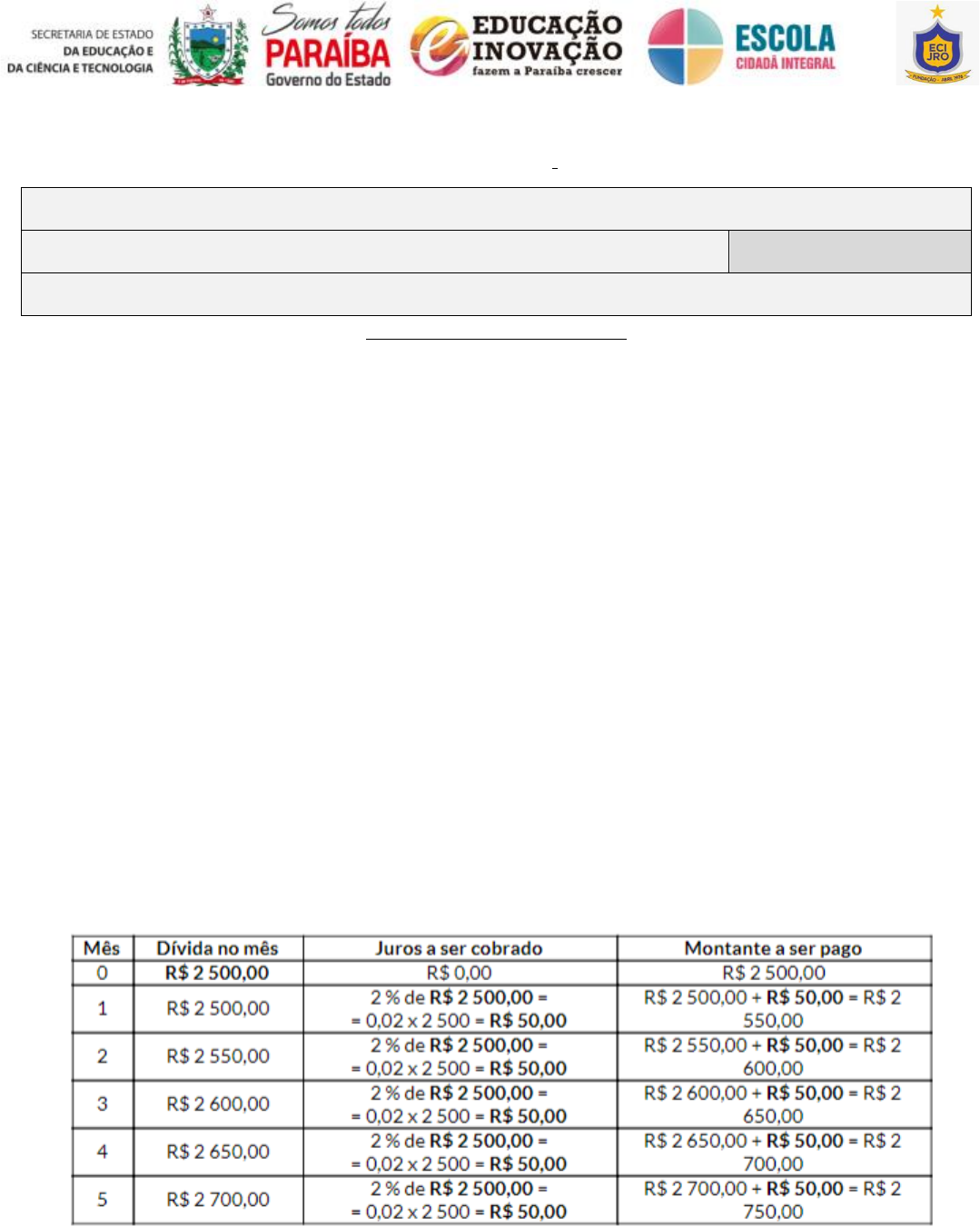 Escola Cidadã Integral Estadual de Ensino Fundamental e Médio José Rolderick de Oliveira Atividade: Revisões com foco no ENEM – 1ª Semana do 4° bimestre Nome do/a Professor: Bosoerg Pereira Nome do/a Estudante: Turma: 3° Ano A Eixo norteador: Ciência, Tecnologia e Inovação Revisões com foco no ENEM Ola! Tudo bem? Criado para avaliar o desempenho dos estudantes no final da educação básica, o Exame Nacional do Ensino Médio (Enem) foi reformulado com o passar do tempo e hoje é uma importante ferramenta de seleção usada pelas universidades públicas e particulares. Do Enem derivam ainda alguns programas de bolsas e financiamento estudantil para universitários. Para auxilia-los neste semestre vamos dedicar a revisão de alguns conteúdos que são cruciais como matemática financeira. Inicialmente vamos trabalhar com juros simples, veja exemplo abaixo. Exemplo: Pauloe José são amigos desde a infância. No último mês a situação financeira de Paulo piorou e ele pediu ao amigo a quantia de R$ 2 500,00emprestado, prometendo que depois de 5 meses de volveria o dinheiro a José. Solidário com seu amigo José emprestou a quantia e combinou que cobraria 2% ao mês de juros para o colega. O cálculo dos juros sempre envolve uma quantia (conhecida por Capital), oprazo que demorará a negociação e ataxa de juros envolvida (que muitas vezes vem indicada na forma percentual). Contudo uma informação muito relevante é sobre qual valora taxa de juros irá ser cobrada. Continue analisando o caso dos amigos: José propôs a Paulo que a taxa de juros sempre fosse cobrada sobre o valor inicialmente emprestado. Paulo não aceitou e disse a José que a taxa de juros deveria ser cobrada ao final de cada mês. Dessa maneira os dois colegas acabaram fechando o acordo com a última opção. Considerando que a taxa de juros fosse cobrada sobreo valor inicialmente emprestado podemos elaborar uma tabela e analisar mensalmente o montante a ser pago. Dessa maneira temos: Como os acréscimos são constantes (cada mês é sempre acrescido R$ 50,00) podemos determinar uma função que relaciona o montante final partido o período de tempo que durar o f(x) empréstimo. Neste caso temos: Perceba que o cálculo do montante no sistema de capitalização simples envolve uma função afim e ainda podemos deduzir uma fórmula que detecta os juros no final de cada mês: 𝐽 = 𝐶 ∙ 𝑖. 𝑡, na qual J representa o juros, C o capital, i a taxa (porcentagem na forma decimal) e t o tempo. Logo o montante será dado por 𝑀 = 𝐶 + 𝐽 = 𝐶(1 + 𝑖𝑡). Exemplo: Uma pessoa aplicou o capital de R$ 1.200,00 a uma taxa de 2% ao mês, sobre regime de juros simples, durante 14 meses. Determine os juros e o montante dessa aplicação. Solução: dados C= 1200, i= 2%=0,02 e t = 14, assim 𝐽 = 𝐶 ∙ 𝑖 ∙ 𝑡 = 1200 ∙ 0,02 ∙ 14 = 336 Montante 𝑀 = 𝐶 + 𝐽 = 1200 + 336 = 1536. Exemplo: Um capital aplicado a juros simples durante 2 anos, sob taxa de juros de 5% ao mês, gerou um montante de R$ 26.950,00. Determine o valor do capital aplicado. (CUIDADO O TEMPO ESTÁ EM ANOS E A TAXA EM MÊS. ASSIM DEVEMOS TER OS DOIS NO MESMO MARCADOR DE TEMPO) Solução: dados Montante (M) = R$ 26.950,00, Tempo (t) = 2 anos = 24 meses e Taxa (i) = 5% ao mês = 5/100 = 0,05. Como M = C + J podemos adaptar a situação isolando o juros ou melhor J = M – C e dai calcularmos Atividade 1) Um investidor aplicou a quantia de R$ 500,00 em um fundo de investimento que opera no regime de juros simples. Após 6 meses o investidor verificou que o montante era de R$ 560,00. Qual a taxa de juros desse fundo de investimento? ( dica é semelhante ao segundo exemplo) a) 1 % b) 1,5 % c) 2 % d) 2,5 % e) 3 % Escola Cidadã Integral Estadual de Ensino Fundamental e Médio José Rolderick de Oliveira Atividade: Revisões com foco no ENEM – 2ª Semana do 4° bimestre Nome do/a Professor: Bosoerg Pereira Nome do/a Estudante: Turma: 3° Ano A Eixo norteador: Ciência, Tecnologia e Inovação Revisões com foco no ENEM Ola! Tudo bem? Para auxilia-los neste semestre vamos dedicar a revisão de alguns conteúdos que são cruciais como matemática financeira. Inicialmente vimos o regime de juros simples e hoje vamos dar continuidade com esta aprendizagem através da seguinte atividade Atividade 1) Um investidor aplica R$ 1.000,00 a juros simples de 3% ao mês. Determine o valor recebido após um ano é: a) R$ 1.460,00. b) R$ 1.390,00. c) R$ 1.670,00. d) R$ 1.360,00. e) R$ 1.660,00. 2) Calcule o juro que renderá um capital de R$ 15.000,00 aplicado a uma taxa de juros simples de 12% ao ano, durante seis meses. a) R$ 970,00. b) R$ 800,00. c) R$ 900,00. d) R$ 910,00. e) R$ 870,00. 3) Um capital de 7.500,00 foi aplicado em um investimento que rende juro simples de 5% ao mês. Qual será o saldo dessa aplicação após seis meses? a) 2.250,00 b) 10.000,00 c) 9.750,00 d) 8.500,00 e) 9.875,00 4) Um capital foi aplicado a juro simples com taxa de 10% ao mês, durante cinco meses. Se no fim desse período o juro produzido foi de R$ 305. Qual foi o capital aplicado? a) 500,00 b) 600,00 c) 390,00 d) 610,00 e) 750,00 5) Um capital é aplicado, a juros simples, à taxa de 4% ao mês. Quanto tempo, no mínimo, ele deverá ser aplicado, a fim de que seja possível resgatar o triplo da quantia aplicada? a) 50 meses. b) 40 meses. c) 30 meses. d) 20 meses. e) 10 meses. Essa semana peguei pesado rsrsrsrs, mais você conseguiu Parabéns. Escola Cidadã Integral Estadual de Ensino Fundamental e Médio José Rolderick de Oliveira Atividade: Revisões com foco no ENEM – 3ª Semana do 4° bimestre Nome do/a Professor: Bosoerg Pereira Nome do/a Estudante: Turma: 3° Ano A Eixo norteador: Ciência, Tecnologia e Inovação Revisões com foco no ENEM Ola! Tudo bem? Para auxilia-los neste semestre vamos dedicar a revisão de alguns conteúdos que são cruciais como matemática financeira. Inicialmente vimos o regime de juros simples e hoje vamos estuda