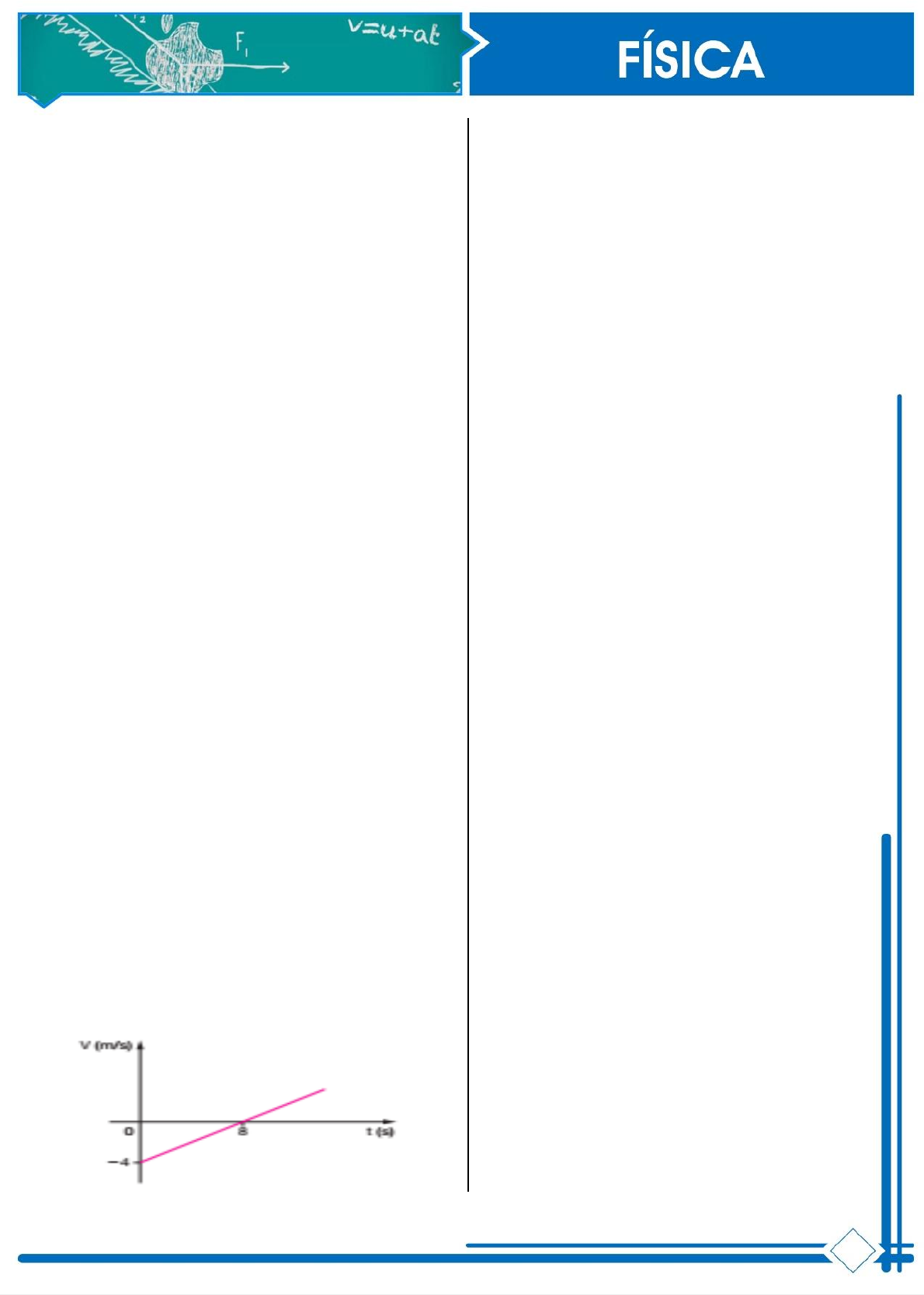 Exercícios de Revisão de Conteúdo Prof.: Andrey Maciel 01 - (UEPG-PR) Um passageiro anotou, a cada minuto, a velocidade indicada pelo velocímetro do táxi em que viajava; o resultado foi 12 km/h, 18 km/h, 24 km/h e 30 km/h. Pode-se afirmar que: a) o movimento do carro é uniforme; b) a aceleração média do carro é de 6 km/h, por minuto; c) o movimento do carro é retardado; d) a aceleração do carro é 6 km/h2; e) a aceleração do carro é 0,1 km/h, por segundo. 02 - (Unimep-SP) Uma partícula parte do repouso e em 5 segundos percorre 100 metros. Considerando o movimento retilíneo e uniformemente variado, podemos afirmar que a aceleração da partícula é de: a) 8 m/s2 b) 4 m/s2 c) 20 m/s2 d) 4,5 m/s2 e) Nenhuma das anteriores 03 - (MACK-SP) Uma partícula em movimento retilíneo desloca-se de acordo com a equação v= - 4 + t, onde v representa a velocidade escalar em m/s e t, o tempo em segundos, a partir do instante zero. O deslocamento dessa partícula no intervalo (0 s, 8 s) é: a) 24 m b) 2 m c) 8 m d) zero e) 4 m 04 - Uma partícula parte do repouso e em 5 segundos percorre 100 metros. Considerando o movimento retilíneo e uniformemente variado, podemos afirmar que a aceleração da partícula é de: a) 8 m/s2 b) 4 m/s2 c) 20 m/s2 d) 4,5 m/s2 e) Nenhuma das anteriores 05 - O gráfico representa a velocidade escalar de um corpo, em função do tempo De acordo com o gráfico, o módulo da aceleração desse corpo, em metros por segundo ao quadrado, é igual a: a) 0,50 c) 8,0 e)16,0 b) 4,0 d) 12,0 06 - Um corpo é abandonado de uma altura de 20 m num local onde a aceleração da gravidade da Terra é dada por g 10 m/s2. Desprezando o atrito, o corpo toca o solo com velocidade: a) igual a 20 m/s d) igual a 20 km/h b) nula e) igual a 15 m/s c) igual a 10 m/s 07 - Uma bola é lançada de uma torre, para baixo. A bola não é deixada cair mas, sim, lançada com uma certa velocidade inicial para baixo. Sua aceleração para baixo é (g refere-se à aceleração da gravidade): a) exatamente igual a g. b) maior do que g c) menor do que g. d) inicialmente, maior do que g, mas rapidamente estabilizando em g. e) inicialmente, menor do que g, mas rapidamente estabilizando em g. 08 - Um corpo é lançado verticalmente para cima com uma velocidade inicial de v0=30 m/s. Sendo g=10 m/s2 e desprezando a resistência do ar qual será a velocidade do corpo 2,0 s após o lançamento? a) 20 m/s d) 40 m/s b) 10 m/s e) 50 m/s c) 30 m/s 09 - Em relação ao exercício anterior, qual é a altura máxima alcançada pelo corpo? a) 90 m d) 360 m b) 135 m e) 45 m c) 270 m 10 - Um corpo é abandonado a 80m do solo. Sendo g = 10m/s² e o corpo estando livre de forças dissipativas, determine o instante e a velocidade que o móvel possui ao atingir o solo.