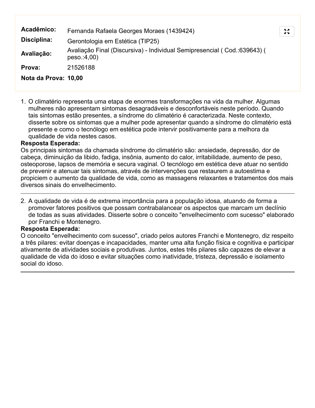 02/12/2020 UNIASSELVI - Centro Universitário Leonardo Da Vinci - Portal do Aluno - Portal do Aluno - Grupo UNIASSELVI https://portaldoalunoead.uniasselvi.com.br/ava/notas/request_gabarito_n2.php?action1=VElQMDE0OA==&action2=VElQMjU=&action3=NjM5NjQz&a… 1/1 Acadêmico: Fernanda Rafaela Georges Moraes (1439424) Disciplina: Gerontologia em Estética (TIP25) Avaliação: Avaliação Final (Discursiva) - Individual Semipresencial ( Cod.:639643) (peso.:4,00) Prova: 21526188 Nota da Prova: 10,00 1. O climatério representa uma etapa de enormes transformações na vida da mulher. Algumas mulheres não apresentam sintomas desagradáveis e desconfortáveis neste período. Quando tais sintomas estão presentes, a síndrome do climatério é caracterizada. Neste contexto, disserte sobre os sintomas que a mulher pode apresentar quando a síndrome do climatério está presente e como o tecnólogo em estética pode intervir positivamente para a melhora da qualidade de vida nestes casos. Resposta Esperada: Os principais sintomas da chamada síndrome do climatério são: ansiedade, depressão, dor de cabeça, diminuição da libido, fadiga, insônia, aumento do calor, irritabilidade, aumento de peso, osteoporose, lapsos de memória e secura vaginal. O tecnólogo em estética deve atuar no sentido de prevenir e atenuar tais sintomas, através de intervenções que restaurem a autoestima e propiciem o aumento da qualidade de vida, como as massagens relaxantes e tratamentos dos mais diversos sinais do envelhecimento. 2. A qualidade de vida é de extrema importância para a população idosa, atuando de forma a promover fatores positivos que possam contrabalancear os aspectos que marcam um declínio de todas as suas atividades. Disserte sobre o conceito "envelhecimento com sucesso" elaborado por Franchi e Montenegro. Resposta Esperada: O conceito "envelhecimento com sucesso", criado pelos autores Franchi e Montenegro, diz respeito a três pilares: evitar doenças e incapacidades, manter uma alta função física e cognitiva e participar ativamente de atividades sociais e produtivas. Juntos, estes três pilares são capazes de elevar a qualidade de vida do idoso e evitar situações como inatividade, tristeza, depressão e isolamento social do idoso.