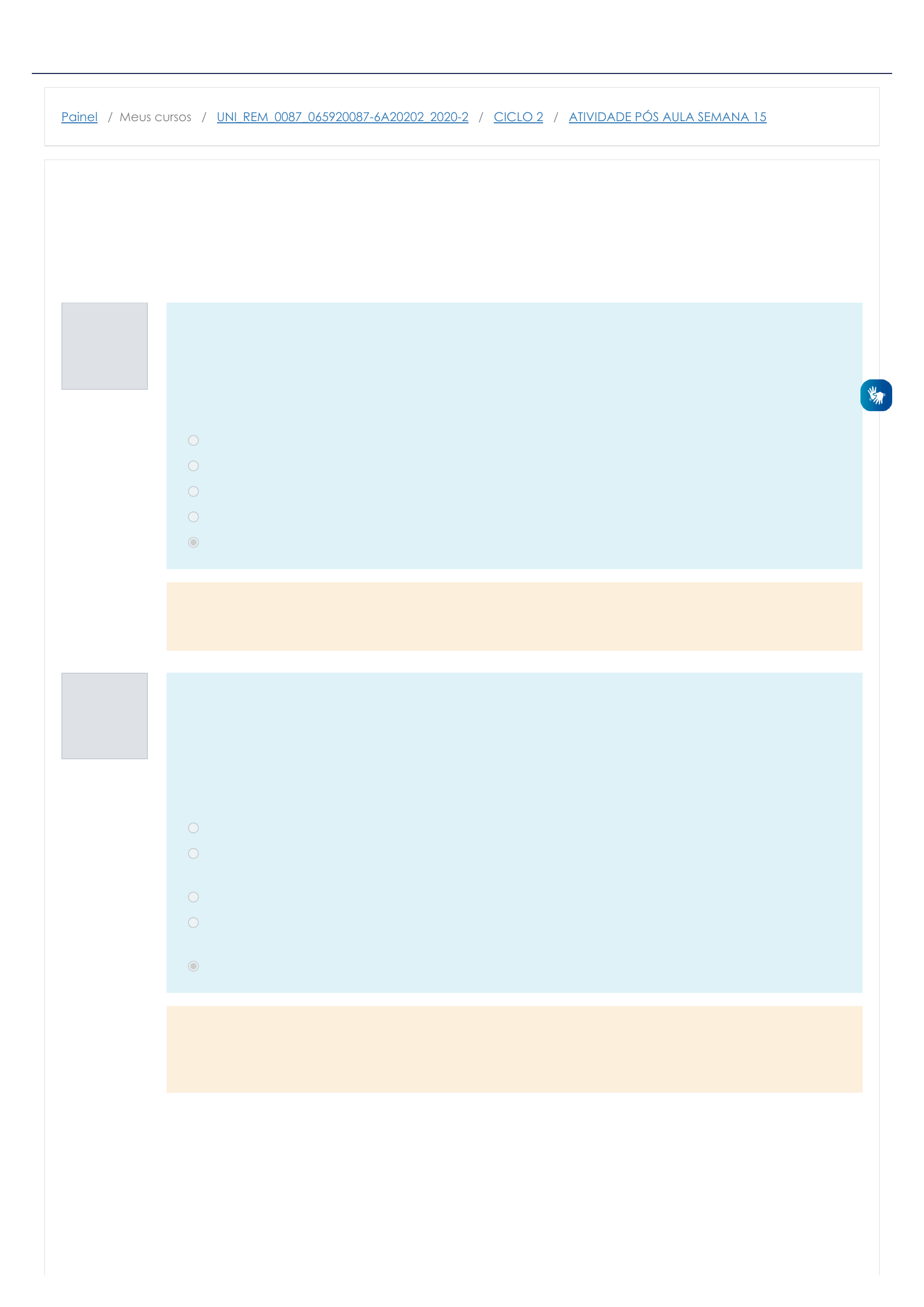 25/11/2020 ATIVIDADE PÓS AULA SEMANA 15: Revisão da tentativa https://avagraduacao.unievangelica.edu.br/disciplinasonline/mod/quiz/review.php?attempt=856755&cmid=337162 1/2 Painel / Meus cursos / UNI_REM_0087_065920087-6A20202_2020-2 / CICLO 2 / ATIVIDADE PÓS AULA SEMANA 15 Questão 1 Correto Atingiu 0,50 de 0,50 Questão 2 Incorreto Atingiu 0,00 de 0,50 Iniciado em quarta, 25 Nov 2020, 19:55 Estado Finalizada Concluída em quarta, 25 Nov 2020, 19:59 Tempo empregado 3 minutos 54 segundos Avaliar 1,00 de um máximo de 2,00(50%) (SAGAH) O custeio ABC tem como objetivo principal aprimorar a apropriação dos custos indiretos e despesas indiretas aos produtos. Indique qual a sequência correta de apropriação dos custos pelo sistema de custeio ABC: Escolha uma: a. Departamentos – produtos – atividades b. Atividades – departamento – produtos c. Produto- departamento – atividades d. Atividades – produtos – departamentos e. Departamento- atividades – produtos Sua resposta está correta. A resposta correta é: Departamento- atividades – produtos. (SAGAH) A Gestão Estratégica de Custos é uma ferramenta gerencial que utiliza as informações baseadas nos custos para criar as vantagens competitivas de seus produtos. Para isso, utiliza-se de alguns elementos que auxiliam-na a promover as informações precisas e pertinentes. Marque a alternativa que apresenta os elementos da GEC: Escolha uma: a. Dados, procedimentos, custeio ABC, cadeia de valor, direcionador, relatórios financeiros. b. Dados, sistema de aplicativos, procedimentos, método de custeio, relatórios, indicadores de desempenho. c. Recursos humanos, finanças, custeio ABC, qualidade, dados, relatórios. d. Indicador de desempenho, custeio por absorção, dados, relatórios, sistema de aplicativosIndicador de desempenho, custeio por absorção, dados, relatórios, sistema de aplicativos, qualidade. e. Custeio ABC, cadeia de valor, direcionador de custos, relatórios financeiros, dados. Sua resposta está incorreta. A resposta correta é: Dados, sistema de aplicativos, procedimentos, método de custeio, relatórios, indicadores de desempenho.. https://avagraduacao.unievangelica.edu.br/disciplinasonline/my/ https://avagraduacao.unievangelica.edu.br/disciplinasonline/course/view.php?id=2894 https://avagraduacao.unievangelica.edu.br/disciplinasonline/course/view.php?id=2894§ion=4 https://avagraduacao.unievangelica.edu.br/disciplinasonline/mod/quiz/view.php?id=337162 25/11/2020 ATIVIDADE PÓS AULA SEMANA 15: Revisão da tentativa https://avagraduacao.unievangelica.edu.br/disciplinasonline/mod/quiz/review.php?attempt=856755&cmid=337162 2/2 Resumo de retenção de dados Obter o aplicativo para dispositivos móveis Questão 3 Correto Atingiu 0,50 de 0,50 Questão 4 Incorreto Atingiu 0,00 de 0,50 (SAGAH) O sistema ABC foi criado com o objetivo de reduzir as distorções provocadas pelo rateio excessivo dos custos, visando eliminar as limitações impostas pelos sistemas tradicionais de custeio. Qual é a principal característica dessa metodologia? Escolha uma: a. Custeio baseado em atividades. b. Custo baseado na produção contínua. c. Custeio baseado em outros custos. d. Cálculo do custo sem utilizar a margem de contribuição. e. Custo baseado somente nos custos diretos. Sua resposta está correta. A resposta correta é: Custeio baseado em atividades.. (SAGAH) O direcionador de custos representa quanto cada unidade de produto ou serviço consumiu na atividade, assim devem se identificar as atividades, identificar o direcionador da atividades, determinar uma taxa por direcionador e atribuir os custos ao produto aplicado à taxa referida. Assim, identifique a alternativa que apresenta os direcionadores de custos respectivos das atividades. Escolha uma: a. - Pagamentos - número de cheques emitidos; - Reparos – horas de reparos. b. - Recebimentos – número de descarregamento; - Pagamento – horas de reparo. c. - Compras de material – numero de pedido; - Reparos – número de cheques emitidos. d. - Recebimentos – números de pedidos; - Pagamentos – número de descarregamento. e. - Reparos – número de descarregamentos; - Compra de material – horas de reparos. Sua resposta está incorreta. A resposta correta é: - Pagamentos - número de cheques emitidos; - Reparos – horas de reparos.. ◄ GRAVAÇÃO - AULA DE AP. ANÁLISE DE CUSTOS - SEMANA 15 18/11/2020 Seguir para... AVALIAÇÃO 2ª VA ► https://avagraduacao.unievangelica.edu.br/disciplinasonline/admin/tool/dataprivacy/summary.php https://download.moodle.org/mobile?version=2019052003.02&lang=pt_br&iosappid=633359593&androidappid=com.moodle.moodlemobile https://avagraduacao.unievangelica.edu.br/disciplinasonline/mod/url/view.php?id=338620&forceview=1 https://avagraduacao.unievangelica.edu.br/disciplinasonline/mod/quiz/view.php?id=89008&forceview=1
