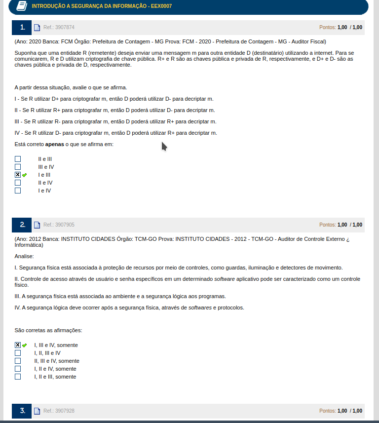 Analise: São corretas as afirmacoes: I. Segurança física está associada proteção de recursos por meio de controles, como guardas, iluminação e detectores de movimento. II. Controle de acesso através de usuário e senha em um determinado software aplicativo pode ser caracterizado como um controle físico. III. A segurança física está associada ao ambiente e a segurança lógica aos programas. IV. A segurança lógica deve ocorrer após a segurança física, através de softwares e protocolos. III e IV. somente II, III e IV II, III e IV. somente II e IV. somente II