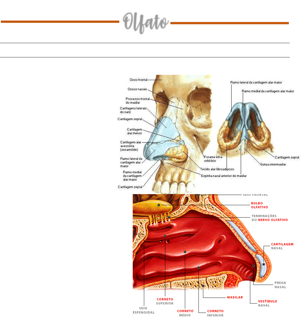 VICTORIA CHAGAS 1 Olfato ANATOMIA OLFATÓRIA PARTE EXTERNA: Formado por esqueleto de cartilagem e uma parte óssea. - Possui duas aberturas (narinas) - A pele por cima da cartilagem possui glândulas sebáceas SEPTO NASAL: é uma parte óssea/cartilaginosa que separa as duas cavidades nasais. - A parte óssea é chamada de lâmina do etmoide e vômer. CAVIDADES NASAIS: A cavidade nasal estende-se das narinas (abertura anterior) até as coanas (abertura posterior – liga narina a faringe). Produz uma substância viscosa que ajuda na lubrificação, filtração e olfato. TÚNICA MUCOSA: dividido em 2/3 posteriores/inferior em mucosa respiratória/ mucosa vermelha (mais vasos sanguíneos) e o terço anterior/superior é mucosa olfatória/ mucosa amarela (mais inervação) CONCHAS /CORNETOS: 3 lâminas na parede lateral → divide em superior, inferior e média. BOLHA ETMOIDAL: A bolha etmoidal, uma elevação arredondada superior ao hiato, é visível quando a concha média é removida. A bolha é formada por células etmoidais médias que formam os seios etmoidais. CANAIS DE DRENAGEM: 1. Meato inferior: abertura do ducto nasolacrimal 2. Meato médio: abertura dos seios maxilares, frontal e grupo anterior de células etmoidais 3. Meato superior: abertura do grupo posterior de células etmoidais e abertura do forame esfenopalatino INERVAÇÃO: maxilar e trigêmeo - A região posteroinferior é inervada pelo N. maxilar. - A inervação da parte anterossuperior é feita pelo N. oftálmico (NC V1) – principalmente. - O N. olfatório (NC I) inerva as células do epitélio olfatório que fica na parte superior das paredes laterais e septo nasal. VICTORIA CHAGAS 2 TRANSDUÇÃO DO CHEIRO O sistema olfatório é o único no qual os receptores sensoriais primários são células bipolares em uma área especializada de epitélio do revestimento da parte superior da cavidade nasal. Além disso, essas células sofrem reposição contínua durante toda a vida. Esses receptores primários fazem sinapse com neurônios olfatórios secundários no bulbo olfatório. O epitélio olfatório possui 3 tipos de células: ▪ Células receptoras olfatórias: transdução→ são neurônios bipolares com axônios próprios que penetram no SNC ▪ Células de suporte com glândulas de Bowman: produção de muco (proteção – solução aquosa rica em proteoglicanos, proteínas e sais – também possui anticorpos) ▪ Células basais: fonte de novos receptores (células-tronco) 1) Substancias odoríferas 2) Ligam-se aos receptores nos cílios das células receptoras olfatórias 3) Estimulação da proteína G 4) AMPc 5) Ligação do AMPc ao canal catiônico 6) Influxo de Na+ e Ca2+ 7) Saída de Cl- 8) Despolarização A resposta olfatória pode ser encerrada por diferentes fatores: - Substâncias odoríferas se difundem - Enzimas podem degradá-las - Na presença continuada de um odorante, a célula receptora se adapta ao estímulo - Aumento da camada de muco VICTORIA CHAGAS 3 VIAS CENTRAIS NC I → penetração pela lâmina cribriforme → bulbo olfatório → glomérulo (células mitrais e em tufo) → trato olfatório → estria olfatória medial e lateral (trígono olfatório) → córtex olfatório ou para outras estruturas como a amigdala, córtex entorrinal e sistema límbico - Não precisa atravessar o tálamo para chegar ao córtex - Na área olfatória medial fazem conexão com hipotálamo e sistema límbico - Na área olfatória lateral pode ir para: córtex pré-piriforme, córtex piriforme e amígdala → e todos vão para o sistema límbico - 3ª via: Pode ir para o córtex orbitofrontal VICTORIA CHAGAS 4 LESÕES Anosmia: ausência de olfato → ex.: trauma na placa cribiforme Hiperosmia: aumento da olfação Hiposmia: diminuição da olfação Disosmia/cacosmia: percepção de odores desagradáveis Fantosmia: percebe cheiros que não estão ali Parosmia: distorção do olfato Lesões superiores→ sente o cheiro, mas não consegue distinguir (agnosmia) Lesões periféricas ou no nervo olfatório→ hiposmia ou anosmia