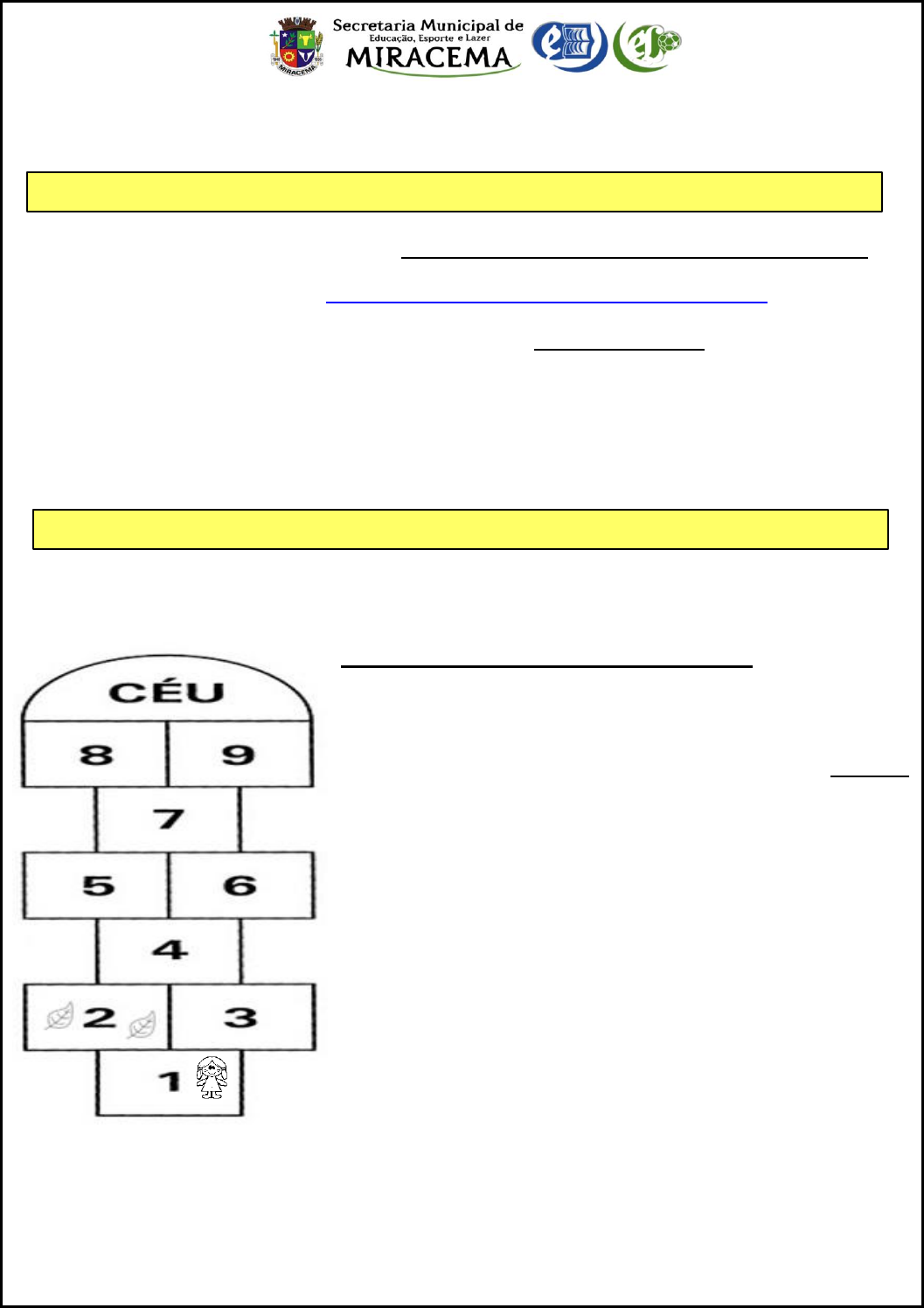 30/03/2020 - SEGUNDA-FEIRA 31/03/2020 - TERÇA-FEIRA Roteiro de atividades semanais – 1º ano – 30/03 a 03/04 Acompanhar a leitura da história: “O ESCUDO PROTETOR CONTRA O REI VÍRUS”; Disponível em https://www.youtube.com/watch?v=pkIbbypfQgU&t=9s Após a leitura a criança deverá construir o seu escudo protetor. Incentive seu filho no capricho e criatividade com a atividade e quando o escudo estiver pronto, tire uma foto e poste no grupo de WhatsApp da turma. Realizar a ATIVIDADE 1 (disponível na plataforma). Realizar a ATIVIDADE 2 (disponível na plataforma); Hoje será dia de brincar de amarelinha! Com ajuda de um adulto construa uma amarelinha e não se esqueça de numerar os quadrinhos. Mas, antes da brincadeira você precisa cumprir um desafio. Vamos lá? Para cada quadrinho da amarelinha, você deverá representar a quantidade referente ao numeral. Pode usar brinquedos, pedrinhas, folhas das árvores, frutas, garrafas, etc... Observe o exemplo e use a sua criatividade: Tire uma foto do desafio e poste no grupo de WhatsApp da turma. https://www.youtube.com/watch?v=pkIbbypfQgU&t=9s 01/04/2020 - QUARTA-FEIRA 02/04/2020 - QUINTA-FEIRA 03/04/2020 - SEXTA-FEIRA No dia 22 de março foi comemorado o Dia Mundial da Água. Assista o vídeo, que fala sobre a importância da água, disponível em https://youtu.be/13dhsz00xKg Realizar a ATIVIDADE 3 (disponível na plataforma). Realizar a ATIVIDADE 4 (disponível na plataforma); Dica de um jogo para trabalhar as rimas entre as palavras. Disponível em: https://www.digipuzzle.net/digipuzzle/kids/puzzles/connectpieces_rhyme_pt.htm?language=portuguese&linkb ack=../../../pt/jogoseducativos/palavras/index.htm Basta clicar no link, se tiver dificuldade, copie e cole no navegador. Realizar a ATIVIDADE 5 (disponível na plataforma); Estamos em casa de quarentena e para os dias serem mais divertidos as brincadeiras precisam acontecer. Vamos brincar? Hoje, é dia de DESAFIO: construa com sucatas ou recursos retirados da natureza um brinquedo bem bonito. Tire uma foto do desafio e poste no grupo de WhatsApp da turma. ______________________________________________________________________________________________ Senhor Responsável, As crianças em processo de alfabetização estão no momento de reconhecer as letras e explorar os seus sons. É importante que o responsável pegue o LIVRO DIDÁTICO NA ESCOLA nessa primeira semana, para que nas próximas sejam trabalhados os conteúdos e atividades do livro. O levantamento de hipóteses e o registro feito por elas dizem muito para nós. Então, incentive-as a pensar e refletir sobre o que estão fazendo nas atividades propostas. Juntos venceremos essa batalha! https://youtu.be/13dhsz00xKg https://www.digipuzzle.net/digipuzzle/kids/puzzles/connectpieces_rhyme_pt.htm?language=portuguese&linkback=../../../pt/jogoseducativos/palavras/index.htm https://www.digipuzzle.net/digipuzzle/kids/puzzles/connectpieces_rhyme_pt.htm?language=portuguese&linkback=../../../pt/jogoseducativos/palavras/index.htm ALUNO (A):_________________________________________________________________________ ESCOLA ___________________________________________________________________________ DATA: ____/____/_____ 1º ANO PROFESSOR (A) _________________________________ ==================================ATIVIDADE 1 ========================================= ESTAMOS UNIDOS NA LUTA CONTRA O CORONAVÍRUS. MOSTRE PARA O REI VÍRUS QUE VOCÊ É UMA CRIANÇA ESPERTA E QUE VAI VENCER ESSA LUTA! OBSERVE A PALAVRA ABAIXO: 1- ESCREVA A LETRA INICIAL ______ LETRA FINAL ______ 2- PINTE AS VOGAIS QUE APARECEM NA PALAVRA E ESCREVA AQUI: _________ 3- ESSA PALAVRA É FORMADA POR QUANTAS LETRAS? ________ 4- PINTE UM ESCUDO PARA CADA LETRA DA PALAVRA ACIMA: 5- COMPLETE O ALFABETO E PINTE AS LETRAS QUE FORMAM A PALAVRA ACIMA: 6- PINTE OS DESENHOS QUE REPRESENTAM OS QUATROS PASSOS PARA ATIVAR O ESCUDO DE COMBATE AO REI VÍRUS: B F J Q S ATIVE O SEU ESCUDO! 3 ALUNO (A):_________________________________________________________________________ ESCOLA ___________________________________________________________________________ DATA: ____/____/_____ 1º ANO PROFESSOR (A) _________________________________ ==================================ATIVIDADE 2 ========================================= VEJA COMO POSSIVELMENTE SURGIU O CORONAVÍRUS. LEIA COM A AJUDA DE UM ADULTO E FAÇA ILUSTRAÇÕES PARA A HISTÓRIA. O CORONAVÍRUS É UM TIPO DE GRIPE QUE PODE PROVOCAR CONSEQUÊNCIAS GRAVES. OS PRODUTOS ABAIXO SÃO USADOS NA PROTEÇÃO CONTRA O CORONAVÍRUS. PINTE A QUANTIDADE PEDIDA DE CADA UM: FIQUE EM CASA! VAMOS VENCER O CORONAVÍRUS. OS MORCEGOS SÃO ANIMAIS QUE CARREGAM CONSIGO O CORONAVÍRUS. CERTO DIA, UM MORCEGO INFECTADO DEIXOU SEUS EXCREMENTOS EM UMA FLORESTA NA CHINA. UM PANGOLIM À PROCURA DE INSETOS PARA COMER TEVE CONTATO COM OS EXCREMENTOS E SE INFECTOU. HOMENS CAPTURARAM O PANGOLIM E SE INFECTARAM. OS HOMENS INFECTADOS FORAM VENDER OS ANIMAIS EM UM MERCADO DE ANIMAIS SILVESTRES NA CHINA E INFECTARAM OUTRAS PESSOAS. 8 6 ALUNO (A):_________________________________________________________________________ ESCOLA ___________________________________________________________________________ DATA: ____/____/_____ 1º ANO PROFESSOR (A) _________________________________ ==================================ATIVIDADE 3 ========================================= A ÁGUA É MUITO IMPORTANTE EM NOSSAS VIDAS. ESCUTE COM ATENÇÃO A LEITURA DO TEXTO ABAIXO: 4) RESPONDA AS PERGUNTAS ABAIXO: OBSERVE A PALAVRA ÁGUA 1) VOLTE NO TEXTO E PINTE ESSA PALAVRA. 2) QUANTAS VEZES ESSA PALAVRA APARECEU NO TEXTO: _______ 3) PINTE TODOS OS DESENHOS E FAÇA A HISTÓRIA FICAR BEM MAIS BONITA E DIVERTIDA. 5) VAMOS ASSISTIR UM LINDO VÍDEO? CLIQUE NO LINK OU COPIE E COLE NO NAVEGADOR: https://www.youtube.com/watch?v=V8hZwx 2Clg0 OU PROCURE NO YOUTUBE COM O NOME Filme infantil - A água é um mundo fantástico Isabel Cristina Silveira Soares https://www.youtube.com/watch?v=V8hZwx2Clg0 https://www.