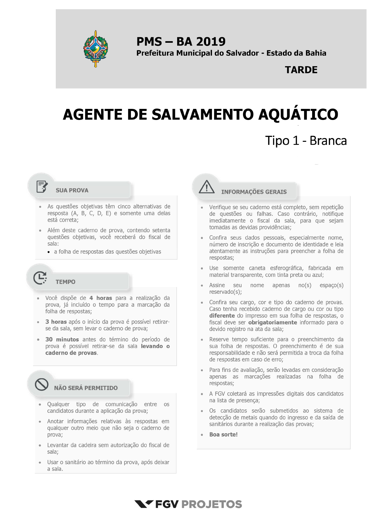 Prefeitura Municipal do Salvador FGV – Projetos Agente de Salvamento Aquático na área de qualificação de Agente de Salvamento Aquático Τ1 Tipo 1 – Cor BRANCA – Página 3 MÓDULO I Língua Portuguesa 1 Nas opções a seguir, a primeira oração foi reescrita de modo a dar-se a ela um caráter genérico, com a utilização da partícula se. Assinale a opção em que isso foi feito de forma gramaticalmente incorreta. (A) Todo mundo viu a morte de perto. / Viu-se a morte de perto. (B) As pessoas reclamam de tudo. / Reclama-se de tudo. (C) Muita gente pensa o contrário de todos. / Pensa-se o contrário de todos. (D) Muitas pessoas não respeitam os horários. / Desrespeitam-se os horários. (E) Todos cometem as mesmas falhas. / Comete-se as mesmas falhas. 2 A revista Veja, em 30/03/2016, publicou a seguinte manchete: Comida desperdiçada na América Latina reduziria 37% da fome do mundo Cerca de 348 mil toneladas de alimentos são perdidas por dia na região. Sobre os componentes do texto dessa manchete, assinale a afirmativa correta. (A) Se a América Latina não desperdiçasse tantos alimentos, acabaria a fome no mundo. (B) A principal crítica do texto se dirige ao atraso cultural e econômico da América Latina. (C) A expressão “cerca de” indica precisamente a quantidade de alimentos desperdiçada. (D) Em todo o texto há a identificação clara do responsável pelo desperdício de alimentos. (E) A forma verbal “reduziria” indica uma possibilidade, e não uma certeza. 3 “Muito se tem falado de conservação do meio ambiente, mas não se criou ainda a consciência de que o planeta precisa urgentemente de nossos cuidados.” (Brasil Escola) Assinale a opção que indica os termos que, nesse segmento do texto, desempenham a mesma função sintática. (A) de conservação / do meio ambiente (B) de que o planeta precisa urgentemente / de nossos cuidados (C) de conservação / de nossos cuidados (D) de que o planeta precisa urgentemente de nossos cuidados / do meio ambiente (E) de conservação / de que o planeta precisa 4 “Ler é importante porque leva a pessoa a ter contato com várias ideias diferentes (dos autores), adquirindo assim uma visão mais ampla do mundo e dos conflitos que envolvem a humanidade e a sociedade. Quando se tem uma visão mais ampla, se tem também mais material para formar as próprias ideias e resolver de melhor forma os próprios problemas.” brunokabuki.blogspot.com/2019/ Segundo o texto, a leitura (A) faz os autores entrarem em contato com várias ideias. (B) obriga os leitores a terem uma visão mais ampla do mundo. (C) torna menos compreensíveis os conflitos do mundo. (D) fornece ferramentas para a formação de nossas ideias. (E) minimiza os problemas que enfrentamos. 5 “Ler é importante porque leva a pessoa a ter contato com várias ideias diferentes (dos autores), adquirindo assim uma visão mais ampla do mundo e dos conflitos que envolvem a humanidade e a sociedade. Quando se tem uma visão mais ampla, se tem também mais material para formar as próprias ideias e resolver de melhor forma os próprios problemas.” brunokabuki.blogspot.com/2019/ A relação lógica entre os dois segmentos sublinhados é a de (A) simultaneidade temporal. (B) causa e consequência. (C) proporcionalidade. (D) comparação desproporcional. (E) condição. 6 Violência, participação e democracia “Manifestações públicas constituem um dos aspectos essenciais da vida democrática. Um regime político que é incapaz de tolerar a livre manifestação da população – inclusive a que contraria os ocupantes do poder – não pode ser considerado democrático. Historicamente, os regimes democráticos se consolidam quando a luta política deixa de ser o arriscado jogo do tudo ou nada e se institucionaliza como parte do cotidiano da sociedade.” Folha de São Paulo, 14/6/2014. Esse trecho apresenta uma série de pensamentos de caráter democrático, à exceção de um. Assinale-o. (A) A luta política não deve ter caráter radical. (B) As manifestações públicas devem ser normalmente aceitas. (C) O poder político deve tolerar manifestações opostas. (D) A luta política não deve fazer parte do cotidiano social. (E) A violência não deve ser empregada contra manifestações. Prefeitura Municipal do Salvador FGV – Projetos Agente de Salvamento Aquático na área de qualificação de Agente de Salvamento Aquático Τ1 Tipo 1 – Cor BRANCA – Página 4 7 Um dos temas de discussão mais frequentes na atualidade é o das vantagens e desvantagens da redução da maioridade penal. Assinale a opção que apresenta um argumento que pode ser considerado desfavorável a essa redução. (A) A redução protegeria os jovens do aliciamento do tráfico, que tem recrutado menores para a prática de crimes. (B) O sistema prisional brasileiro apresenta situação caótica. (C) A impunidade gera o aumento da violência. (D) A opinião pública brasileira apoia a redução. (E) A legislação brasileira deve alinhar-se à de países desenvolvidos. 8 Assinale a opção que indica a frase em que não ocorre a relação de causa e consequência. (A) Apesar das chuvas, as ruas não amanheceram alagadas. (B) Em virtude da crise, o comércio está vendendo menos. (C) Muitas pessoas deixaram de viajar em função do mau tempo. (D) As necessidades econômicas geram muitos problemas. (E) A violência resulta, muitas vezes, da ignorância. 9 O jornal A Tarde publicou as duas manchetes esportivas a seguir. Bahia cai para o Atlético-MG e acaba com chance de vaga na Libertadores Vitória perde para Atlético-PR e se complica na luta contra o rebaixamento Sobre essas duas manchetes, assinale a opção que apresenta a afirmativa correta. (A) A estruturação dos textos se dirige aos “iniciados” no futebol. (B) A gravidade das derrotas é apresentada como equivalente. (C) O verbo “cair” pertence à linguagem denotativa. (D) Uma das siglas representativas de estados 