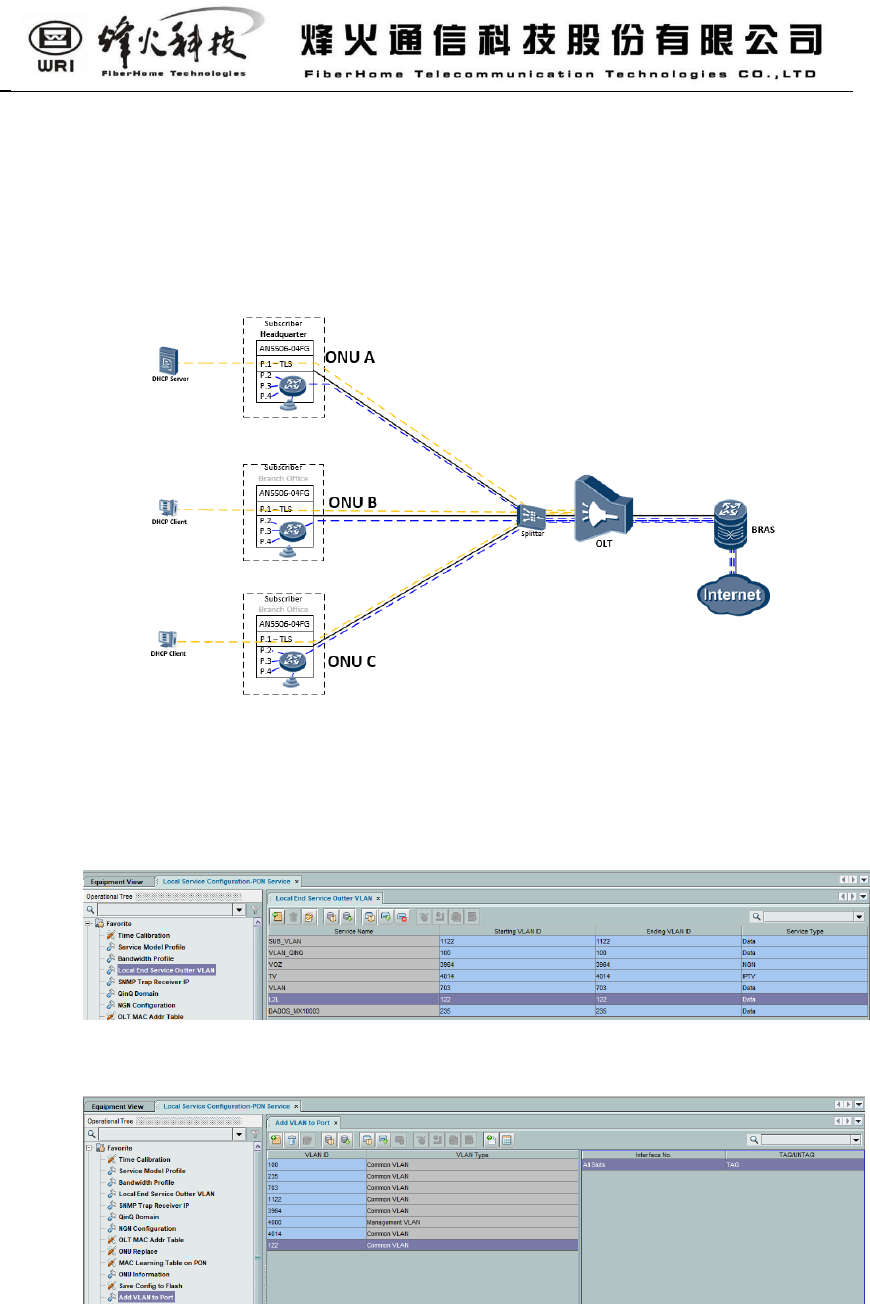 Configuração LAN to LAN A configuração LAN to LAN é utilizada para que diferentes ONUs conectadas na mesma OLT possam se comunicar. Isso significa que a ONU pode se comunicar sem roteadores e switches. 1. Configuração no UNM a. Criar VLAN que será utilizada no serviço Configuration – Local Service Configuration – PON Service – Local End Service Outter VLAN b. Adicionar a VLAN ao slot Add VLAN to Port – Adicionar para todos os slots em TAG c. Configurar a porta da ONU ONU List – Selecionar ONU – Port Service Config – Data Port – LAN1/2 – Service Configuration – Add – Preencher os campos assinalados em vermelho – Clicar em OK – Create on Device 2. Configuração da OLT A configuração do LAN to LAN na OLT pode ser de três maneiras distintas. a. ONUs conectadas no mesmo slot e na mesma porta PON Conecte na OLT via Telnet e execute os comandos abaixo: Admin# cd card Admin\card# set in_olt_interflow slot 1 index 1 pon 1 vlan 122 interflow_mode in_card Admin\card# apply in_olt_interflow slot 1 b. ONUs conectadas no mesmo slot e em PONs distintas Conecte na OLT via Telnet e execute os comandos abaixo: Admin# cd card Admin\card# set in_olt_interflow slot 1 index 1 pon 1 vlan 122 interflow_mode in_card Admin\card# set in_olt_interflow slot 1 index 2 pon 2 vlan 122 interflow_mode in_card Admin\card# apply in_olt_interflow slot 1 c. ONUs conectadas em slots diferentes Conecte na OLT via Telnet e execute os comandos abaixo: Admin# cd card Admin\card# set in_olt_interflow slot 1 index 1 pon 1 vlan 122 interflow_mode in_card Admin\card# set in_olt_interflow slot 2 index 1 pon 1 vlan 122 interflow_mode between_card Admin\card# apply in_olt_interflow slot 1 Admin\card# apply in_olt_interflow slot 2 Admin\card# apply in_olt_interflow core_card Observação: Jamais aplique o comando para todos os slots, pois pode causar um excesso de sobrecarga na OLT e perder a conexão Telnet. 3. Teste Para testar se a configuração de LAN to LAN está correta, conecte um computador na porta LAN de cada ONU e configure um IP estático para cada dispositivo. Execute o cmd e teste o ping entre os dois computadores, se houver comunicação o serviço está pronto para uso. Observação: O firewall do Windows pode bloquear a comunicação entre os dois computadores, portanto certifique-se de que o mesmo estará desabilitado durante o teste. Configuração LAN to LAN com QinQ habilitado O QinQ pode ser utilizado em conjunto com o LAN to LAN para trazer transparência de VLAN no circuito, ou seja, qualquer VLAN utilizada pelo cliente será enxergada pela OLT. 1. Configuração no UNM a. Criar VLAN que será utilizada no serviço Configuration – Local Service Configuration – PON Service – Local End Service Outter VLAN b. Adicionar a VLAN ao slot Add VLAN to Port – Adicionar para todos os slots e Trunk 1 em TAG c. Criar o QinQ Profile QinQ Profile – Add (Criar a regra baseado em VLAN ID com o range entre 0 e 4000) – OK – Create on Device. d. Configurar a porta da ONU ONU list – Selecionar ONU – Port Service Config – Data Port – LAN1/2 – Service Configuration – Add – Preencher os campos assinalados em vermelho – Clicar em OK 2. Configuração da OLT Com a utilização do QinQ será configurada a mesma VLAN para habilitar o LAN to LAN. A configuração do LAN to LAN na OLT pode ser de três maneiras distintas. a. ONUs conectadas no mesmo slot e na mesma porta PON Conecte na OLT via Telnet e execute os comandos abaixo: Admin# cd card Admin\card# set in_olt_interflow slot 1 index 1 pon 1 vlan 100 interflow_mode in_card Admin\card# apply in_olt_interflow slot 1 b. ONUs conectadas no mesmo slot e em PONs distintas Conecte na OLT via Telnet e execute os comandos abaixo: Admin# cd card Admin\card# set in_olt_interflow slot 1 index 1 pon 1 vlan 100 interflow_mode in_card Admin\card# set in_olt_interflow slot 1 index 2 pon 2 vlan 100 interflow_mode in_card Admin\card# apply in_olt_interflow slot 1 c. ONUs conectadas em slots diferentes Conecte na OLT via Telnet e execute os comandos abaixo: Admin# cd card Admin\card# set in_olt_interflow slot 1 index 1 pon 1 vlan 100 interflow_mode in_card Admin\card# set in_olt_interflow slot 2 index 1 pon 1 vlan 100 interflow_mode between_card Admin\card# apply in_olt_interflow slot 1 Admin\card# apply in_olt_interflow slot 2 Admin\card# apply in_olt_interflow core_card Observação: Jamais aplique o comando para todos os slots, pois pode causar um excesso de sobrecarga na OLT e perder a conexão Telnet. 3. Teste Para testar se a configuração de LAN to LAN está correta, conecte um computador na porta LAN de cada ONU e configure um IP estático para cada dispositivo. Execute o cmd e teste o ping entre os dois computadores, se houver comunicação o serviço está pronto para uso. Observação: O firewall do Windows pode bloquear a comunicação entre os dois computadores, portanto certifique-se de que o mesmo estará desabilitado durante o teste.