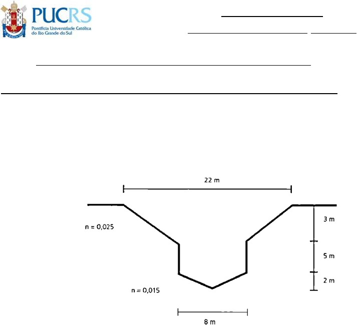 HIDRÁULICA GERAL Prof. Dr. Jaime Gomes 2 pontos Nome: Data: _______ Responda no corpo da prova. Tempo de prova: 1h:30 Boa Sorte! 1. Dado o canal de drenagem da figura, com seção composta em concreto e revestimento vegetal, implantado com declividade longitudinal de 0,08%, pede-se: a. Calcular sua capacidade máxima de vazão em escoamento uniforme; b. Definir quais seriam as alternativas possíveis para aumentar-se a capacidade de vazão do canal, mantendo-se a mesma largura superficial e a mesma profundiade de escavação.