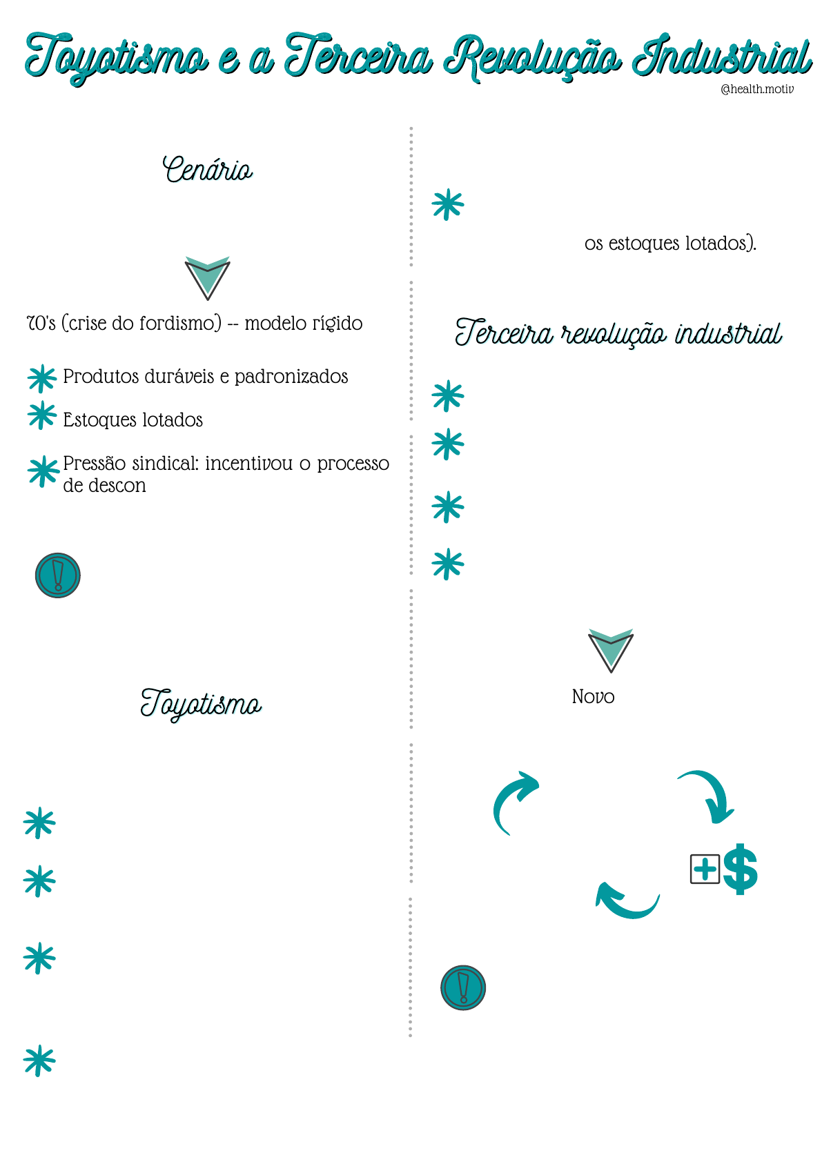 Desconcentração espacial / industrial . (baixa atuação sindical) Mão - de - obra qualificada (exerce múltiplas funções) Produtos não - duráveis (COP) - ciclo da obsolescência programada através de falhas mecânicas ou atualização tecnológica. Diversos produtos Trabalha com a qualidade Inovar aplicando tecnologia de ponta no produto Surgiu nos técnopolos: Califórnia, EUA, Vale do silício Robótica, aeroespacial, biogenética, nanotecnologia Entre os anos 50 e 60, no auge do Fordismo e grande mercado. Toyotismo e a Terceira Revolução IndustrialToyotismo e a Terceira Revolução IndustrialToyotismo e a Terceira Revolução Industrial CenárioCenárioCenário @health.motiv 70's (crise do fordismo) -- modelo rígido Produtos duráveis e padronizados Estoques lotados Pressão sindical: incentivou o processo de desconcentração industrial. A indústria procurou lugares sem sindicato, mão - de - obra barata, e matéria -prima abundante. Lugares como: América Latina e Ásia. ToyotismoToyotismoToyotismo Modelo flexível (adaptável): criado para atender as demandas japonesas. Just in time: Produzir de acordo com a demanda e tamanho do mercado. ( solucionou os estoques lotados). Terceira revolução industrialTerceira revolução industrialTerceira revolução industrial Novo ciclo Tecnologia Pesquisa e desenvolvimento Problema: a fonte de energia utilizada ainda é o petróleo