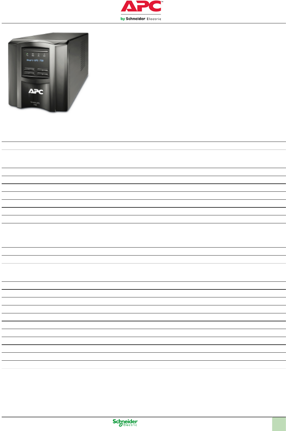 Product data sheet Characteristics SMT750IC APC Smart-UPS 750VA LCD 230V with SmartConnect Overview Lead time Usually Ships within 2 Weeks General Provided equipment USB cable Additional specification Cloud-enabled monitoring Performance multiplier 1 Number of tare power 15 W Number of power module free slots 0 Number of power module filled slots 0 Redundant No Size UPS version Internetworking Server Telecom Workstation UPS size S Value multiplier 1 Physical Cable length 1.83 M Colour Black Depth 36.9 Cm Height 16.1 Cm Mounting location Front Mounting preference No preference Net weight 11.8 Kg Mounting mode Not rack-mountable Two post mountable 0 USB compatible Yes Width 13.8 Cm Th e in fo rm at io n pr ov id ed in th is d oc um en ta tio n co nt ai ns g en er al d es cr ip tio ns a nd /o r t ec hn ic al c ha ra ct er is tic s of th e pe rfo rm an ce o f t he p ro du ct s co nt ai ne d he re in . Th is d oc um en ta tio n is n ot in te nd ed a s a su bs tit ut e fo r a nd is n ot to b e us ed fo r d et er m in in g su ita bi lit y or re lia bi lit y of th es e pr od uc ts fo r s pe ci fic u se r a pp lic at io ns . It is th e du ty o f a ny s uc h us er o r i nt eg ra to r t o pe rfo rm th e ap pr op ria te a nd c om pl et e ris k an al ys is , e va lu at io n an d te st in g of th e pr od uc ts w ith re sp ec t t o th e re le va nt s pe ci fic a pp lic at io n or u se th er eo f. N ei th er S ch ne id er E le ct ric In du st rie s SA S no r a ny o f i ts a ffi lia te s or s ub si di ar ie s sh al l b e re sp on si bl e or li ab le fo r m is us e of th e in fo rm at io n co nt ai ne d he re in . 24-Nov-2020 1 Input Network frequency 50/60 Hz +/- 3 Hz auto-sensing Plug standard IEC 320 C14 Input voltage limits 151...302 V adjustable 160...280 V Inputvolt_other 220 V 240 V Number of cables 1 Input voltage 230 V Output Rated power in W 500 W Maximum configurable power in W 500 W Harmonic distortion Less than 5 % Output frequency 50/60 Hz +/- 3 Hz sync to mains Outputvolt_other 220 V 240 V UPS type Line interactive Wave type Sine wave Nb of power socket outlets 6 IEC 320 C13 2 IEC Jumpers Curve equation Efficiency Curve fixed loss 0.0117 Curve load maximum 100 % Curve load minimum 2 % Curve proportional loss 0 Curve square loss 0.0012 Curve X-axis maximum 100 % Curve test cond ID Curve fit of data measured in accordance with the ENERGY STAR Test Method- for Uninterruptible Power Supplies. All measurements taken in normal mod- e(s), at typical environmental conditions, with 230V/50Hz electrical input and bal- anced resistive load (PF = 1.0) output. Curve X-axis minimum 0 % Curve X-axis title Load Curve X-axis units Percentage Curve Y-axis maximum 100 % Curve Y-axis minimum 50 % Curve Y-axis title Efficiency Curve Y-axis units Percentage Graph display 1 Output voltage 230 V Maximum configurable power in VA 750 VA Rated power in VA 750 VA Transfer time 6 ms typical : 10 ms maximum Conformance Product certifications CE EAC RCM VDE Standards EN/IEC 62040-1 EN/IEC 62040-2 2 Environmental Ambient air temperature for operation 0…40 °C Relative humidity 0…95 % Operating altitude 0...10000 ft Ambient air temperature for storage -15…45 °C Storage altitude 0.00…15240.00 M Acoustic level 40 dBA Heat dissipation 90 Btu/H Show note OP temperature No Batteries & Runtime Battery type Lead-acid battery Number of battery filled slots 0 Number of battery free slots 0 Battery recharge time 3 H Number of battery replacement quantity 1 Liquid value 0 Battery curve B Battery charger power 49 W rated Battery power in VAH 146 VAh runtime Battery life 3…5 Year(S) Extended runtime 0 Communications & Management Free slots 1 Control panel Multifunction LCD status and control console Alarm Alarm when on battery : distinctive low battery alarm : configurable delays Emergency power off Optional Surge Protection and Filtering Surge energy rate 540 J Noise suppression Full time multi-pole noise filtering : 0.3% IEEE surge let-through : zero clampin- g response time : meets UL 1449 Packing Units Package 1 Weight 14.23 Kg Offer Sustainability EU RoHS Directive Compliant EU RoHS Declaration Mercury free Yes RoHS exemption information Yes Contractual warranty Warranty 3 years repair or replace (excluding battery) and 2 years for battery Product Life Status : Commercialised 3 http://www.reach.schneider-electric.com/DistantRequestDispatcher.aspx?action=export&pid=490326944&lang=en-us http://www.reach.schneider-electric.com/DistantRequestDispatcher.aspx?action=export&pid=490326944&lang=en-us
