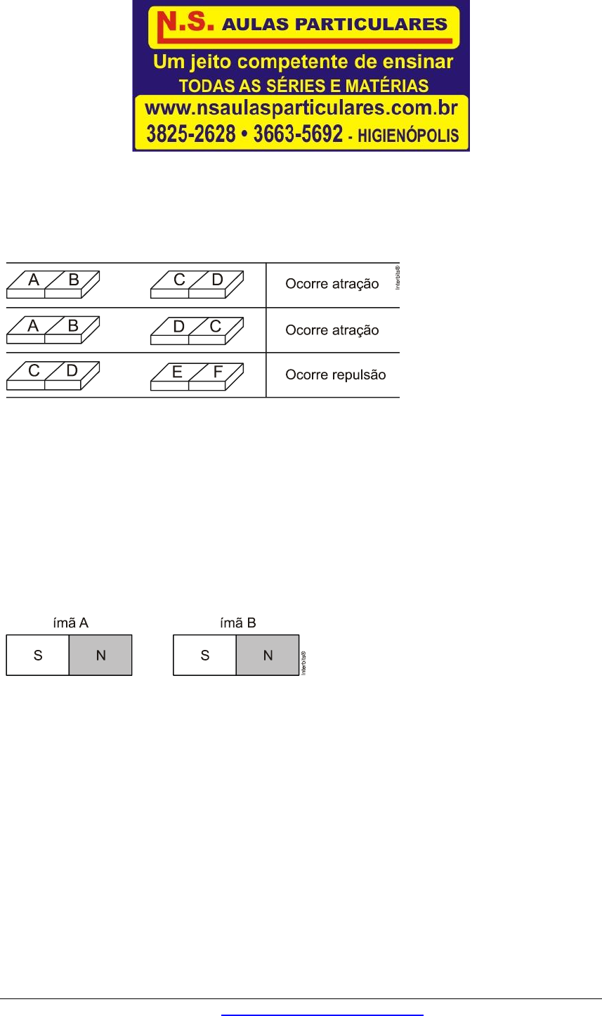 www.nsaulasparticulares.com.br Página 1 de 9 Imãs 1. (G1 - ifsp 2013) Um professor de Física mostra aos seus alunos 3 barras de metal AB, CD e EF que podem ou não estar magnetizadas. Com elas faz três experiências que consistem em aproximá-las e observar o efeito de atração e/ou repulsão, registrando-o na tabela a seguir. Após o experimento e admitindo que cada letra pode corresponder a um único polo magnético, seus alunos concluíram que a) somente a barra CD é ímã. b) somente as barras CD e EF são ímãs. c) somente as barras AB e EF são ímãs. d) somente as barras AB e CD são ímãs. e) AB, CD e EF são ímãs. 2. (G1 - ifsp 2012) Os ímãs têm larga aplicação em nosso cotidiano tanto com finalidades práticas, como em alto-falantes e microfones, ou como meramente decorativas. A figura mostra dois ímãs, A e B, em forma de barra, com seus respectivos polos magnéticos. Analise as seguintes afirmações sobre ímãs e suas propriedades magnéticas. I. Se quebrarmos os dois ímãs ao meio, obteremos quatro pedaços de material sem propriedades magnéticas, pois teremos separados os polos norte e sul um do outro. II. A e B podem tanto atrair-se como repelir-se, dependendo da posição em que os colocamos, um em relação ao outro. III. Se aproximarmos de um dos dois ímãs uma pequena esfera de ferro, ela será atraída por um dos polos desse ímã, mas será repelida pelo outro. É correto o que se afirma em a) I, apenas. b) II, apenas. c) I e II, apenas. d) I e III, apenas. e) II e III, apenas. http://www.nsaulasparticulares.com.br/ www.nsaulasparticulares.com.br Página 2 de 9 3. (G1 - cftmg 2011) Em relação às propriedades e aos comportamentos magnéticos dos ímãs, das bússolas e do nosso planeta, é correto afirmar que a) a agulha de uma bússola inverte seu sentido ao cruzar a linha do Equador. b) um pedaço de ferro é atraído pelo polo norte de um ímã e repelido pelo polo sul. c) as propriedades magnéticas de um ímã perdem-se quando ele é cortado ao meio. d) o polo norte geográfico da Terra corresponde, aproximadamente, ao seu polo sul magnético. 4. (Uem 2011) Com relação ao campo magnético terrestre e à orientação geográfica, analise as alternativas abaixo e assinale o que for correto. 01) O polo Sul magnético terrestre situa-se na região do polo Norte geográfico terrestre. 02) As linhas de campo magnético do campo magnético terrestre emergem do polo, na região do polo Sul geográfico. 04) O magma, presente na litosfera terrestre, e a revolução da Terra em torno do Sol são as fontes do campo magnético terrestre. 08) Os fenômenos atmosféricos das auroras Boreal e Austral são observados em função da existência do campo magnético terrestre. 16) Na Groenlândia, situada entre as latitudes 60º e 80º norte, o fluxo magnético associado ao campo magnético terrestre é menor do que o fluxo magnético existente no Brasil, que está situado entre as latitudes 20º e 50º sul. 5. (Fatec 2010) Uma criança brincando com um ímã, por descuido, o deixa cair, e ele se rompe em duas partes. Ao tentar consertá-lo, unindo-as no local da ruptura, ela percebe que os dois pedaços não se encaixam devido à ação magnética. Pensando nisso, se o ímã tivesse o formato e as polaridades da figura a seguir, é válido afirmar que o ímã poderia ter se rompido a) na direção do plano α . b) na direção do plano β . c) na direção do plano π . d) na direção de qualquer plano. e) apenas na direção do plano β . 6. (G1 - cftmg 2010) A bússola é um dispositivo composto por uma agulha imantada que pode girar livremente em torno de um eixo perpendicular a ela. Sobre seu funcionamento, afirma-se: I- O polo sul magnético aponta para o norte geográfico terrestre. II- O polo norte magnético aponta para o sul de um ímã colocado próximo à bússola. III- A agulha sofre uma deflexão quando está próxima e paralela a um fio que conduz corrente elétrica. IV- A agulha, na ausência de campos magnéticos externos, orienta-se na direção leste-oeste terrestre. São corretas apenas as afirmativas a) I e II. b) II e III. c) II e IV. d) III e IV. http://www.nsaulasparticulares.com.br/ www.nsaulasparticulares.com.br Página 3 de 9 7. (Uepg 2010) O eletromagnetismo estuda tanto as interações elétricas como as magnéticas. Sobre o eletromagnetismo, assinale o que for correto. 01) Se um imã for partido em duas partes, o polo sul se conserva enquanto o polo norte desaparece. 02) A Terra pode ser considerada como um grande imã, cujos polos norte e sul magnéticos se localizam aproximadamente nos polos sul e norte geográficos, respectivamente. 04) A atração que ocorre quando aproximamos certos minérios de um pedaço de ferro é uma manifestação de natureza elétrica. 08) Um fio condutor percorrido por uma corrente elétrica produz deflexões em uma agulha imantada. TEXTO PARA A PRÓXIMA QUESTÃO: O ano de 2009 foi o Ano Internacional da Astronomia. A 400 anos atrás, Galileu apontou um telescópio para o céu, e mudou a nossa maneira de ver o mundo, de ver o universo e de vermos a nós mesmos. As questões, a seguir, nos colocam diante de constatações e nos lembram que somos, apenas, uma parte de algo muito maior: o cosmo. 8. (Uemg 2010) Um astronauta, ao levar uma bússola para a Lua, verifica que a agulha magnética da bússola não se orienta numa direção preferencial, como ocorre na Terra. Considere as seguintes afirmações, a partir dessa observação: 1. A agulha magnética da bússola não cria campo magnético, quando está na Lua. 2. A Lua não apresenta um campo magnético. Sobre tais afirmações, marque a alternativa CORRETA: a) Apenas a afirmação 1 é correta. b) Apenas a afirmação 2 é correta. c) As duas afirmações são corretas. d) As duas afirmações são falsas. 9. (G1 - cftmg 2008) Uma bússola, em perfeito estado de funcionamento, encontra-se em uma determinada região e adquire a orientação mos