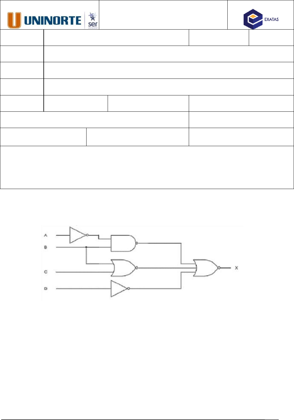 1ª AVALIAÇÃO DO SEMESTRE Curso: ENGENHARIA ELÉTRICA Data da Avaliação: 05/10/2020 Disciplina: AUTOMAÇÃO INDUSTRIAL Professor (a): ELIAS AGUIAR Aluno (a): Helter silva de jesus Matrícula: 03116934 Turma: ELM06S1 Período:6º 1ª AV.S (X ) 2ª AV.S ( ) Exame Final ( ) 2ª Chamada ( ) Semestre/Ano: 2020/2 Valor Total Prova: 6,0 Nota do Aluno: Visto Prof. (a): Instruções e Critérios: 1. Prova com consulta. 2. Questões rasuradas serão anuladas. 3. Questão discursiva será corrigida levando em conta: coerência das ideias, capacidade de argumentação, de análise e síntese. 1ª Questão: De acordo com as alternativas abaixo, que combinação das entradas faz com que a saída do circuito lógico da figura abaixo seja X = 1? (1,0 ponto) a) A = 1, B = 1, C = 1, D = 1. b) A = 1, B = 1, C = 0, D = 1. Resposta correta c) A = 0, B = 1, C = 1, D = 0. d) A = 0, B = 1, C = 1, D = 1. e) A = 1, B = 0, C = 1, D = 1. 2ª Questão: A partir dos sinais A e B aplicados às entradas da porta lógica abaixo, desenhe a forma de onda (diagrama de tempo) na saída S. (1,0 ponto) 3ª Questão: Escreva tabelas da verdade adequadas para as seguintes funções booleanas e determine a saída das expressões abaixo na tabela verdade. (1,0 ponto) a) 𝑓(𝐴, 𝐵, 𝐶, 𝐷) = 𝐴(𝐵 + 𝐶 (𝐵 + 𝐷)) A B C D 𝑪̅ 𝑩𝑪̅ 𝑨(𝑩 + 𝑪̅ ) 𝑩 𝑩 + 𝑫 S 0 0 0 0 1 1 0 1 1 0 0 0 0 1 1 1 0 1 1 0 0 0 1 0 0 0 0 1 1 0 0 0 1 1 0 0 0 1 1 0 0 1 0 0 1 1 1 0 0 0 0 1 0 1 1 1 0 0 1 0 0 1 1 0 0 1 0 0 0 0 0 1 1 1 0 1 0 0 1 0 1 0 0 0 1 1 1 1 1 1 1 0 0 1 1 1 1 1 1 1 1 0 1 0 0 0 0 1 1 0 1 0 1 1 0 0 0 1 1 0 1 1 0 0 1 1 1 0 0 0 1 1 0 1 1 1 1 0 1 1 1 1 1 0 0 1 1 0 0 0 1 1 1 1 0 1 1 0 1 1 b)𝑓(𝐴, 𝐵, 𝐶) = 𝐴𝐶 + 𝐵 . 𝐶 A B C 𝑨𝑪̅ 𝑩 𝑪̅ 𝑩 . 𝑪̅ S 0 0 0 1 1 1 1 1 0 0 1 1 1 0 0 1 0 1 0 1 0 1 0 1 0 1 1 1 0 0 0 1 1 0 0 1 1 1 1 1 1 0 1 1 1 0 0 1 1 1 0 0 0 1 0 0 1 1 1 0 0 0 0 0 4ª Questão: Existem três interruptores de parede, a, b e c. A = 1 representa a condição “interruptor a ligado” e A = 0 representa a condição “interruptor a desligado”. De modo similar, as variáveis B e C estão associadas às posições dos interruptores b e c, respectivamente. Escreva uma expressão booleana para uma função Z, de modo que a alteração do estado de apenas um interruptor, independentemente dos outros, vá provocar a mudança do valor da função. (1,0 ponto) 5ª Questão: Considerando que os arranjos das portas lógicas digitais mostradas nas figuras abaixo sejam equivalentes em suas saídas [AB + AC] ou [A (B+C)], e que as entradas digitais tenham os valores 0 ou 1, então, para a obtenção de saída igual a 1, será suficiente que a entrada A e a entrada C tenham qual valor, simultaneamente? (1,0 pontos) A B C AB AC AB+AC 0 0 1 0 0 0 0 0 0 0 0 0 0 1 1 0 0 0 0 1 0 0 0 0 1 0 1 0 0 0 1 0 0 0 1 1 1 1 1 1 0 1 1 1 0 1 1 1 A B C A B+C A(B+C) 0 0 0 0 0 0 0 0 1 0 1 0 0 1 0 0 1 0 0 1 1 0 1 0 1 0 0 1 0 0 1 0 1 1 1 1 1 1 0 1 1 1 1 1 1 1 1 1 6ª Questão: Dada a tabela verdade abaixo, determine a expressão booleana (usando soma de produtos) e em seguida desenhe o circuito de portas lógicas. (1,0 pontos) 2