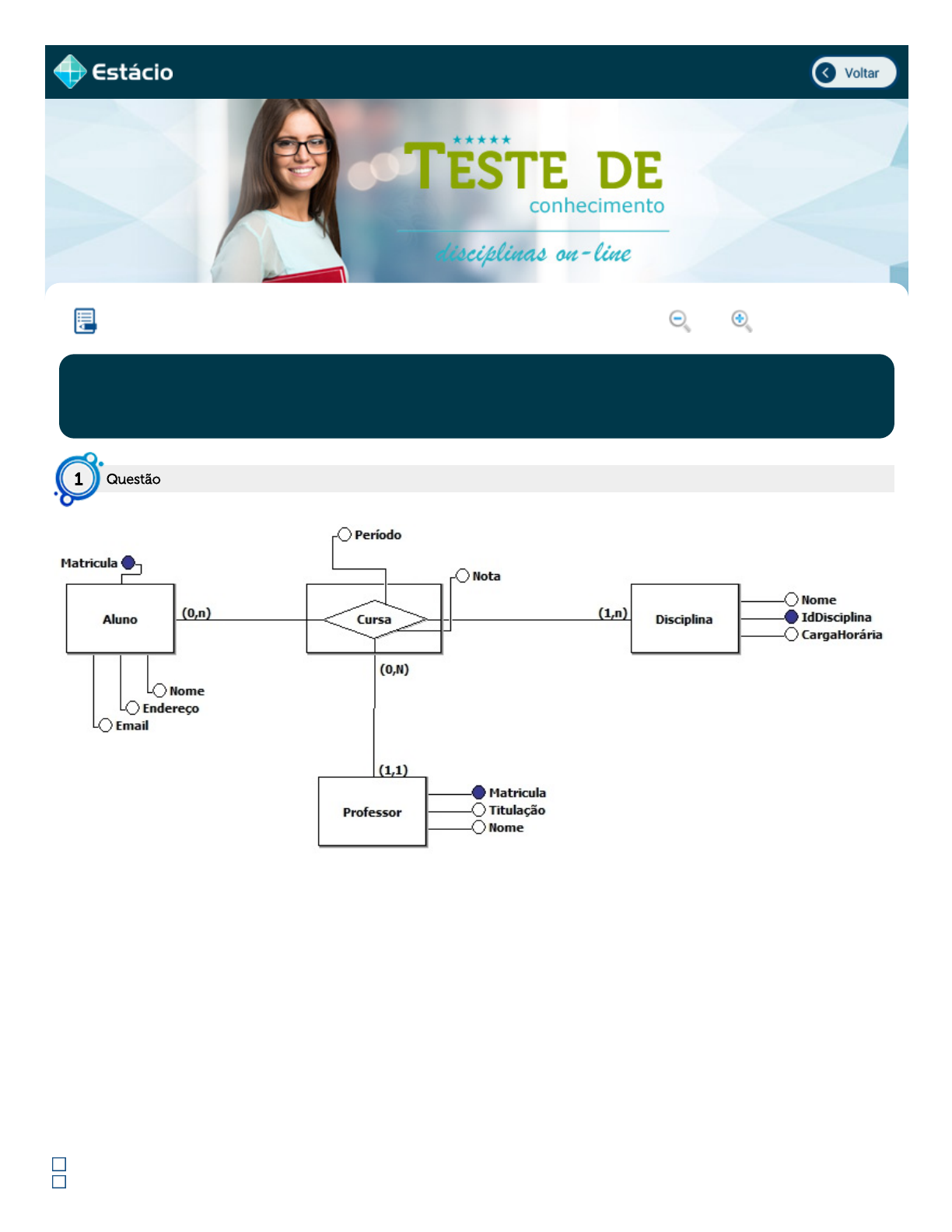 10/12/2020 EPS https://simulado.estacio.br/bdq_simulados_exercicio_preview.asp?cod_prova=4256230880&cod_hist_prova=211430015&pag_voltar=otacka 1/5 MODELAGEM DE DADOS 9a aula Lupa Exercício: CCT0755_EX_A9_201907046445_V1 27/10/2020 Aluno(a): FERNANDO TADEU LOTTERMANN JUNIOR 2020.3 EAD Disciplina: CCT0755 - MODELAGEM DE DADOS 201907046445 A partir do modelo conceitual abaixo, considere as afirmativas a seguir. I - No modelo lógico, a tabela professor receberá, como chave estrangeira, o atributo período. II - No modelo lógico, serão criadas somente as tabelas Aluno, Disciplina e Professor. III - No modelo Lógico, será criada a tabela Cursa, a qual receberá como chave estrangeira os atributos MatriculaProfessor, MatriculaAluno e IdDisciplina. IV - No modelo lógico, os atributos período e Nota ficaram na tabela Aluno. Está correta APENAS a afirmativa. I IV Questão1 https://simulado.estacio.br/alunos/inicio.asp javascript:voltar(); javascript:diminui(); javascript:aumenta(); 10/12/2020 EPS https://simulado.estacio.br/bdq_simulados_exercicio_preview.asp?cod_prova=4256230880&cod_hist_prova=211430015&pag_voltar=otacka 2/5 III e IV III II Respondido em 27/10/2020 12:56:34 Dado o relacionamento, analise as afirma�vas a seguir em relação ao modelo lógico: I - Na tabela Disciplina, além da chave primária (Id_Disc) cria-se o atributo Id_DiscPre. II - Cria-se a tabela PreRequisito e esta é composta pelos atributos: Id_Disc e Id_DiscPre. III - A tabela aluno recebe o atributo Id_Disc como chave estrangeira. Assinale a alterna�va CORRETA. Somente a I e III estão corretas. Somente a III está correta. Somente a II e III estão corretas. Somente a I está correta. Somente a II está correta. Respondido em 27/10/2020 12:57:48 Gabarito Comentado Considerando o modelo abaixo, preciso identificar quem é o titular do SEGURADO, sabendo que o dependente também é um segurado. Marque a alternativa que define uma melhor solução para modelagem desse requisito, seguindo a regra de derivação do modelo CONCEITUAL para LÓGICO. Criar uma entidade DEPENDENTE que estará ligada a SEGURADO e terá CPFDEPENDENTE como chave primária e CPFTITULAR como chave estrangeira. Na entidade SEGURADO deverá ter um atributo CPFTITULAR para representar a ligação. Não é preciso criar entidade ou atributo, pois a própria apresentação do relacionamento já define a ligação física. Questão2 Questão3 10/12/2020 EPS https://simulado.estacio.br/bdq_simulados_exercicio_preview.asp?cod_prova=4256230880&cod_hist_prova=211430015&pag_voltar=otacka 3/5 Criar uma entidade DEPENDENTE que estará ligada a SEGURADO e terá CPFDEPENDENTE e CPFTITULAR como chaves primárias. Criar uma entidade TITULAR onde deve estar CPFTITULAR como chave primária e CPFDEPENDENTE como chave estrangeira. Respondido em 27/10/2020 13:00:08 Gabarito Comentado Avalie as seguintes afirmações a respeito ao DER proposto. I - No modelo Lógico, a generalização pode ser implementada criando somente tabelas para as en�dades especializadas. O resultado final é criação das tabelas: Nadador (IdAtleta, es�lo), Ciclista (IdAtleta, bicicleta) e Boxeador (IdAtleta, categoria_peso). II - No modelo Lógico, a generalização pode ser implementada criando uma tabela para a en�dade generalizada e uma tabela para cada en�dade especializada. O resultado final é criação das Tabelas: Atleta(Id, nome, peso, altura), Nadador (IdAtleta, nome, peso, altura, es�lo), Ciclista (IdAtleta, nome, peso, altura, �po_bicicleta) e Boxeador (IdAtleta, nome, peso, altura, categoria_peso). III - No modelo Lógico, a generalização pode ser implementada criando somente a tabela para a en�dade generalizada. O resultado final é acriação da tabela Atleta(Id, nome, peso, altura). Assinale a alterna�va que indica todas as afirma�vas corretas. É correta apenas a afirmativa III. É correta apenas a afirmativa I. É correta apenas a afirmativa II. Todas as afirmativas são incorretas. Todas as afirmativas são corretas. Respondido em 27/10/2020 12:59:13 Questão4 Questão 5 10/12/2020 EPS https://simulado.estacio.br/bdq_simulados_exercicio_preview.asp?cod_prova=4256230880&cod_hist_prova=211430015&pag_voltar=otacka 4/5 Considere o modelo conceitual desta ilustração e responda a alternativa correta O relacionamento da entidade PESSOA com as entidades especializadas é do tipo COMPARTILHADA O relacionamento da entidade PESSOA com as entidades especializadas é do tipo TOTAL O relacionamento "TIME DE FUTEBOL" e "JOGA COM" caracteriza um autorelacionamento O atributo CPF está associado de forma errada a entidade PESSOA, pois se trata de atributo específico da entidade DIRIGENTE Os atributos Data_Inicio_Mandato e Data_Termino_Mandato são subatributos do atributo composto Mandato Respondido em 27/10/2020 12:59:54 Explicação: A questão explora os conceitos de Generalização e Especialização na modelagem conceitual. Considerando os conceitos de derivação de modelos, quando nos deparamos com uma representação de Generalização/Especialização, podemos afirmar que: Sempre serão criadas 3 tabelas no banco de dados. Uma com os dados comuns e as duas outras com seus atributos particulares, acrescentada da chave primária. Sempre será criada uma única tabela no banco de dados. A representação de Generalização e especialização é utilizada somente para facilitar a visualização enquanto Modelo Conceitual. A regra é sempre criar somente duas tabelas, uma para cada tipo. A representação de Generalização e especialização é para indicar que possuem atributos comuns, somente. A regra é avaliar em função da freqüência do acesso, volume de informações e quantidade de atributos diferentes e, a partir daí definir a quantidade de tabelas resultante na derivação. A regra é criar a tabela que estiver prevendo maior número de informações e uma outra representando os demais tipos. Respondido em 27/10/2020 13:04:03 Gabarito Comen