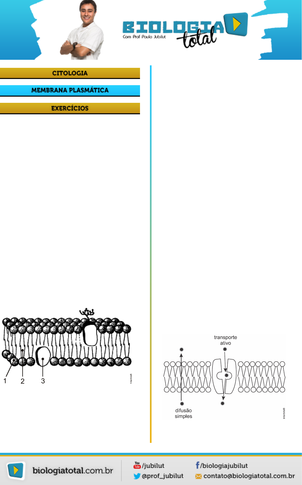 1. (UEPG) Todas as células estão envolvidas por uma membrana plasmática que controla a entrada e saída de substâncias. Nesse contexto, assinale o que for correto. 01) Nas células animais, na osmose ocorre a passagem de solvente por uma membrana semipermeável, quando há diferença de concentração entre duas soluções. O solvente passa de uma região mais concentrada para uma menos concentrada (hipotônica). 02) Mergulhadas nas camadas lipídicas das membranas estão as proteínas, as quais podem desempenhar funções extremamente importantes às células, como o transporte de substâncias e como receptores celulares. 04) O transporte de grandes moléculas para o interior da célula pode ser realizado por exocitose, por meio da expansão de regiões do citoplasma, denominadas de pseudópodes. 08) A membrana plasmática é formada por uma dupla camada de lipídeos, a qual apresenta uma região polar (com afinidade pela água), voltada para os meios extra e intracelulares, e uma região apolar (sem afinidade pela água). 16) A membrana plasmática possui a propriedade de permeabilidade seletiva. No transporte ativo, as substâncias se movem contra um gradiente de concentração, havendo gasto de energia para esse deslocamento. 2. (UFPE) A figura acima representa uma membrana celular, estrutura essencial por limitar o conteúdo da célula e regular a troca de substâncias entre os meios intra e extracelular. Nesse sentido, podemos afirmar que: ( ) a imagem representa o modelo de mosaico- fluido. ( ) o item 1, na figura, representa uma proteína globular. ( ) o item 2, na figura, representa a parte hidrofóbica dos lipídios. ( ) a membrana celular possui proteínas associadas aos lipídios, o que está representado pelo item 3 da figura. ( ) em função de sua constituição química, substâncias lipossolúveis podem atravessar a membrana por difusão simples. 3. (UNB) Produtos de limpeza, como sabão, detergente, desentupidor de pia e alvejante, geralmente utilizados em residências, apresentam, na sua composição, compostos como hidróxido de sódio (NaOH) e hipoclorito de sódio (NaC O).l A esse respeito, julgue o item a seguir. Considerando-se que, para extrair DNA de uma célula, seja necessária a destruição das membranas, é correto inferir que, para tal procedimento, as células devam ser expostas a um detergente. _____________________________________________ _____________________________________________ _____________________________________________ _____________________________________________ _____________________________________________ 4. (UFPR) Dois tipos de transporte que podem acontecer nas membranas plasmáticas são o transporte passivo e o transporte ativo. O primeiro pode acontecer por simples difusão do elemento a ser transportado através da bicamada lipídica da membrana. Já o transporte ativo sempre depende de proteínas que atravessam a membrana, às quais o elemento a ser transportado se liga, desligando-se posteriormente do outro lado da membrana. Ambos os tipos de transporte estão esquematizados na figura abaixo. Com base nessas informações e nos conhecimentos de biologia celular, assinale a alternativa que apresenta corretamente os gráficos de cada tipo de transporte. a) b) c) d) e) 5. (UEM) Sobre a membrana plasmática, assinale o que for correto. 01) A parede celular é um revestimento externo da membrana plasmática e está relacionada à sustentação das células de vegetais, de algas, de fungos e de bactérias. 02) Durante o transporte passivo, a célula transporta substâncias contra o gradiente de concentração, o que envolve gasto de energia e consumo de ATP. 04) Microvilosidades são modificações da membrana plasmática, encontradas nas células do tecido de revestimento interno do intestino, que aumentam a superfície de absorção. 08) A troca gasosa realizada nas brânquias de um peixe é um exemplo de difusão simples, processo que ocorre diretamente pela bicamada lipídica da membrana, sem gasto de energia. 16) Ciclose é o processo de entrada e de movimento de partículas sólidas no citoplasma, realizado pelas expansões citoplasmáticas. 6. (UFTM) Em um experimento, que buscava encontrar a solução ideal para atuar como soro fisiológico, hemácias humanas foram adicionadas em quatro tubos de ensaio (1, 2, 3 e 4) contendo diferentes concentrações salinas. Após determinado intervalo de tempo, as células foram analisadas e as variações do volume foram indicadas em um gráfico. a) Considerando os resultados obtidos, qual dos tubos contém a solução ideal de soro fisiológico que poderia ser injetado na circulação de um indivíduo? Explique. _____________________________________________ _____________________________________________ _____________________________________________ _____________________________________________ b) Suponha que as concentrações internas de células vegetais e de hemácias sejam iguais e que fossem utilizadas células vegetais no tubo 1, no lugar de hemácias. Explique o que ocorreria com o volume vacuolar das células vegetais e por que elas não sofreriam lise celular. _____________________________________________ _____________________________________________ _____________________________________________ _____________________________________________ _____________________________________________ 7. (UFPR) O atual modelo de estrutura da membrana plasmática celular é conhecido por modelo do mosaico fluido, proposto em 1972 pelos pesquisadores Singer e Nicholson. Como todo conhecimento em ciência, esse modelo foi proposto a partir de conhecimentos prévios. Um importante marco nessa construção foi o experimento descrito a seguir. Hemácias humanas, que só possuem membrana plasmática (não há membranas internas) foram lisadas (rompidas) em solução de detergente, e os lipídios foram cuidadosamente dispersos na superfície da água. Foi então medida a área ocupada por esses lipídio