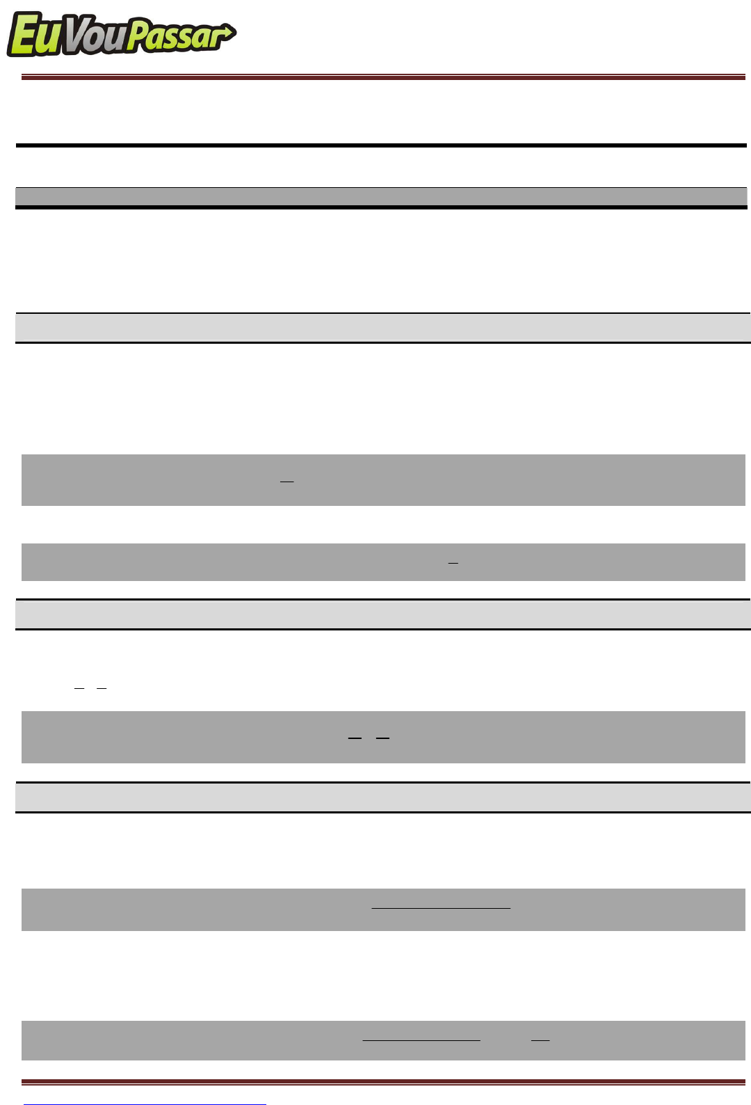 PROF.:THIAGO PACÍFICOPROF.:THIAGO PACÍFICOPROF.:THIAGO PACÍFICOPROF.:THIAGO PACÍFICO http://www.euvoupassar.com.br Eu Vou Passar – e você? Página 1 Professor Thiago Pacífico – Matemática aula 03 RAZÃO E PROPORÇÃO “Há somente dois tipos de homens: os justos, que se imaginam pecadores; e os pecadores, que se consideram justos.” PASCAL “Posso não concordar com nenhuma das palavras que você diz, mas defenderei até o fim o direito de você dizê-las.” VOLTAIRE CONCEITO DE RAZÃO A razão entre duas grandezas é o quociente estabelecido entre elas, ou melhor, é o resultado da divisão entre as grandezas. Assim, dados dois números reais a e b, com b ≠ 0, calcula-se a razão entre a e b através do quociente da divisão de a por b. Para indicarmos a razão entre a e b usamos: b a ou a : b (“a” está para “b”). Na razão de a por b, o número “a” é chamado de antecedente e o número “b” é chamado de conseqüente. Razão entre a e b = b a RAZÕES INVERSAS Duas razões são inversas quando o antecedente de uma é igual ao conseqüente da outra e vice- versa a b e b a . Note que, o produto de duas razões inversas é sempre igual a 1. 1 a b . b a = RAZÕES ESPECIAIS ���� CONCORRÊNCIA DE UM CONCURSO É a razão entre o número de candidatos inscritos no concurso e o número de vagas oferecidas por ele. Concorrência = oferecidasvagasdeºn inscritos.canddeºn ���� VELOCIDADE MÉDIA É a razão entre a distância percorrida por um móvel e o tempo gasto para percorrê-la. Velocidade média = t SV gasto tempo apercorriad distância m ∆ ∆ =∴ PROF.:THIAGO PACÍFICOPROF.:THIAGO PACÍFICOPROF.:THIAGO PACÍFICOPROF.:THIAGO PACÍFICO http://www.euvoupassar.com.br Eu Vou Passar – e você? Página 2 ���� DENSIDADE DE UM CORPO É a razão entre a massa do corpo e o volume por ele ocupado. Densidade = V md volume massa =∴ ���� DENSIDADE DEMOGRÁFICA DE UMA REGIÃO É a razão entre o número de habitantes de uma região e a área dessa região. região dessa área região uma de habitantes de ºn ademográfic Densidade = ���� ESCALA NUMÉRICA É a razão entre um comprimento no desenho e o seu correspondente comprimento no tamanho real, medidos na mesma unidade. real o compriment desenho no o comprimentEscala = D dE =∴ →→→→ Tamanhos de Escala •••• Escala Grande É aquela que possui um pequeno denominador, ou seja, é aquela destinada a pequenos comprimentos reais (áreas urbanas). É rica em detalhes. É usada em cartas ou plantas. •••• Escala Pequena É aquela que possui um grande denominador, ou seja, é aquela destinada a grandes comprimentos reais (áreas continentais). É pobre em detalhes gráficos. É usada em mapas e globos. Observação Há ainda um outro tipo de escala, chamada escala gráfica, que se apresenta sob a forma de um segmento de reta graduado. Nele, cada graduação representa 1 cm de comprimento no desenho. Exemplo: Escala = ou 1: 20.000.000. cm000.000.20 cm1 km200 cm1 = 0km 200km 400km 600km 800km PROF.:THIAGO PACÍFICOPROF.:THIAGO PACÍFICOPROF.:THIAGO PACÍFICOPROF.:THIAGO PACÍFICO http://www.euvoupassar.com.br Eu Vou Passar – e você? Página 3 EXERCÍCIOS RESOLVIDOS 01. Numa prova com 50 questões, acertei 35, deixei 5 em branco e errei as demais. Responda os itens à seguir a) Qual a razão entre o nº de questões certas e erradas? b) Qual a razão entre o nº de questões erradas sobre o total de questões da prova? c) Qual a razão entre o nº de questões em branco sobre o nº de questões certas? Solução: O importante é dividir seguindo a ordem dada, logo: a) 2 7 10 35 == ERRADAS CERTAS = 7 : 2 (proporção de 7 certas para cada 2 questões erradas) b) 5 1 50 10 == TOTAL ERRADAS = 1 : 5 (proporção de 1 errada para cada 5 questões da prova) c) 7 1 35 5 == CERTAS BRANCO = 1 : 7 (proporção de 1 em branco para cada 5 questões certas) CONCEITO DE PROPORÇÃO Proporção é uma igualdade de duas razões Dados quatro números reais a, b, c e d, todos diferentes de zero, dizemos que eles formam, nesta ordem, uma proporção, quando a razão entre o primeiro e o segundo (a:b) é igual à razão entre o terceiro e o quarto (c:d). Representamos isto por: d c b a = ou a : b = c : d E lemos: “a está para b assim como c está para d”. Na proporção d c b a = , destacamos que os termos a e d são chamados extremos e os termos b e c são chamados meios. a : b = c : d d c b a = MEIOS EXTREMOS MEIOS EXTREMOS PROF.:THIAGO PACÍFICOPROF.:THIAGO PACÍFICOPROF.:THIAGO PACÍFICOPROF.:THIAGO PACÍFICO http://www.euvoupassar.com.br Eu Vou Passar – e você? Página 4 ���� PROPRIEDADES DE UMA PROPORÇÃO →→→→ Propriedade Fundamental Em toda proporção, o produto dos meios é igual ao produto dos extremos. c.bd.a d c b a =⇔= →→→→ Soma dos Termos Em toda proporção, temos: + = + + = + ⇔= d dc b ba ou c dc a ba d c b a →→→→ Diferença dos Termos Em toda proporção, temos: − = − − = − ⇔= d dc b ba ou c dc a ba d c b a →→→→ Soma dos Antecedentes e Conseqüentes Em toda proporção, a soma dos antecedentes está para a soma dos conseqüentes, assim como qualquer antecedente está para seu conseqüente. db ca d c b a + + == ���� QUARTA PROPORCIONAL Dados três números reais, a, b e c, não-nulos, chama-se de quarta proporcional desses números dados o número x tal que: x c b a = Note que, a quarta proporcional forma uma proporção com os números a, b e c, nessa ordem. PROF.:THIAGO PACÍFICOPROF.:THIAGO PACÍFICOPROF.:THIAGO PACÍFICOPROF.:THIAGO PACÍFICO http://www.euvoupassar.com.br Eu Vou Passar – e você? Página 5 ���� TERCEIRA PROPORCIONAL Dados dois números reais a e b, não-nulos, chama-se de terceira proporcional desses números o número x tal que: x b b a = ���� SÉRIE DE RAZÕES IGUAIS Uma série de razões iguais é uma igualdade de duas ou mais razões. Também, pode se