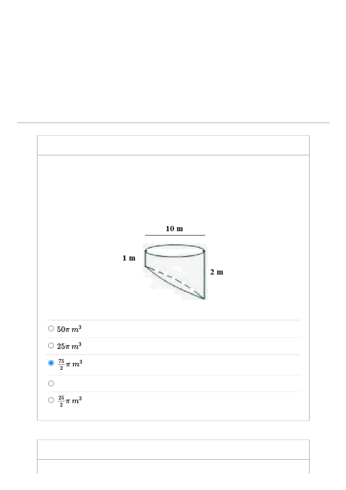 25/11/2020 Teste: Prova 02 https://pucminas.instructure.com/courses/40858/quizzes/146249/take 1/3 Prova 02 Iniciado: 25 nov em 19:03 Instruções do teste Prova 02 - Valor 30 pontos 5 questões de 6 pontos cada 25/11/2020 19:00 às 20:40 6 ptsPergunta 1 Nenhuma das outras alternativas Uma piscina circular tem diâmetro de 10 metros e o fundo é um plano inclinado. O ponto mais raso (o extremo de um diâmetro) tem profundidade de 1 metro e o ponto mais profundo (a outra extremidade do mesmo diâmetro) tem profundidade de 2 metros. Qual volume da piscina? 6 ptsPergunta 2 25/11/2020 Teste: Prova 02 https://pucminas.instructure.com/courses/40858/quizzes/146249/take 2/3 2 1 Nenhuma das outras alternativas -1 -2 Calcule a integral dupla 6 ptsPergunta 3 (0 , 8/5) Nenhuma das outras alternativas (0 , 4/5) (0 , 2/5) (0 , 16/5) Determine as coordenadas do centroide da placa em formato de parábola delimitada pela curva y = 4 - x² e pelo eixo x. 6 ptsPergunta 4 Nenhuma das outras alternativas Determine o momento de inércia, em relação ao seu eixo de simetria, do sólido interior ao cilindro x² + y² = 1 e à esfera x² + y² + z² = 2. (Considere a densidade constante ) 25/11/2020 Teste: Prova 02 https://pucminas.instructure.com/courses/40858/quizzes/146249/take 3/3 Salvo em 20:15 6 ptsPergunta 5 Considere o sólido maciço delimitado pelo cilindro parabólico z = 1 - x² e pelos planos y = 0, y = 10 e z = 0. Determine as coordenadas de seu centroide (considere a densidade constante ). Dica: o sólido tem volume , logo sua massa é Enviar teste