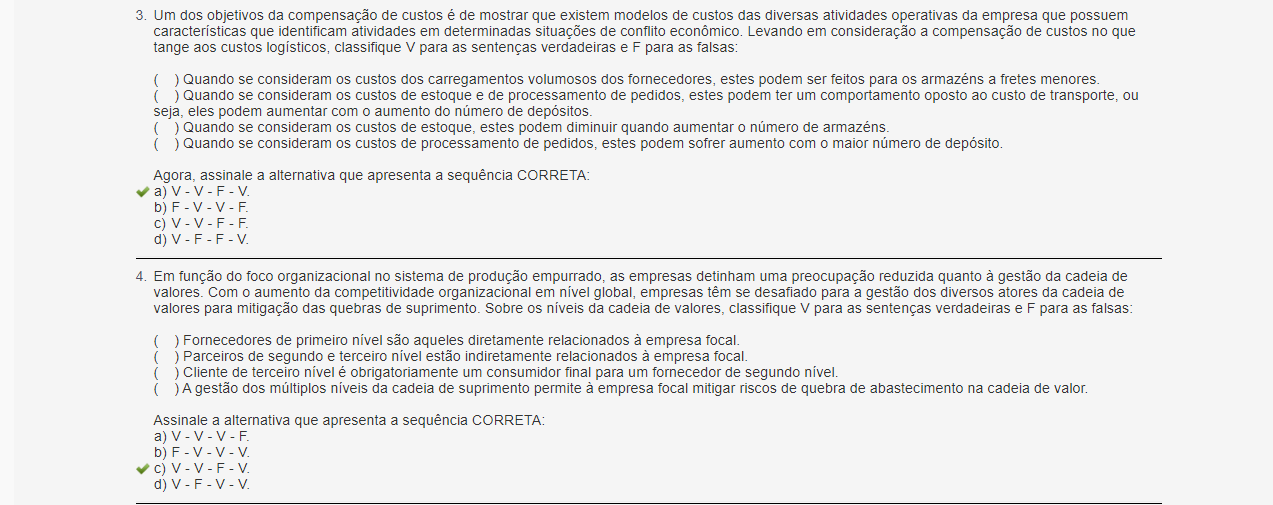 Em função do foco organizacional no sistema de produção empurrado, as empresas detinham uma preocupação reduzida quanto à gestão da cadeia de valores. Com o aumento da competitividade organizacional em nível global, empresas têm se desafiado para a gestão dos diversos atores da cadeia de valores para mitigação das quebras de suprimento. Sobre os níveis da cadeia de valores, classifique V para as sentenças verdadeiras e F para as falsas: ( ) Fornecedores de primeiro nível são aqueles diretamente relacionados à empresa focal. ( ) Parceiros de segundo e terceiro nível estão indiretamente relacionados à empresa focal. ( ) Cliente de terceiro nível é obrigatoriamente um consumidor final para um fornecedor de segundo nível. ( ) A gestão dos múltiplos níveis da cadeia de suprimento permite à empresa focal mitigar riscos de quebra de abastecimento na cadeia de valor. A) F - V - V - V. B) V - F - V - V. C) V - V - F - V. D) V - V - V - F.