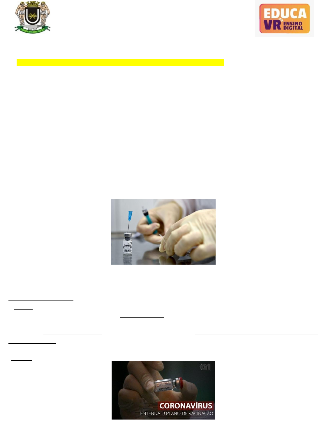 LÍNGUA PORTUGUESA – 5° ANO - SEMANA 32 Estado do Rio de Janeiro Prefeitura de Volta Redonda Secretaria Municipal de Educação Escola Municipal Jesus Menino ATIVIDADE DE LÍNGUA PORTUGUESA – SEMANA 32 - 4º ANO ▪ O tempo previsto para a realização da atividade é de 400 minutos (4 aulas). Habilidades: (EF04LP14) Identificar, em notícias, fatos, participantes, local e momento/tempo da ocorrência do fato noticiado. (EF04LP15) Distinguir fatos de opiniões/sugestões em textos (informativos, jornalísticos, publicitários etc.). (EF04LP05VR) Estudar a estruturação da palavra a partir de seus elementos formadores (morfemas), como também, os diferentes grupos (classes de palavras): • Concordância verbal 1 - Leia a notícia abaixo: Vacinação contra a Covid-19: veja o que se sabe sobre os planos de cada país Reino Unido deve começar a imunizar a população na semana que vem; Rússia já havia anunciado aplicação em massa, mas ainda não começou. No Brasil, idosos, profissionais da saúde e indígenas terão prioridade, segundo Ministério da Saúde, mas ainda não há data prevista para o início da aplicação das vacinas. Por G1 02/12/2020 09h11 Atualizado há 21 horas Enfermeira prepara dose da vacina russa contra Covid-19 Sputnik V, em Moscou, em foto de 10 de setembro — Foto: Natalia Kolesnikova/AFP O Reino Unido anunciou, nesta quarta-feira (2), que deve começar a vacinar sua população na semana que vem contra a Covid-19. Profissionais de saúde deverão estar entre os primeiros a serem vacinados. A Rússia já havia anunciado a imunização de equipes de saúde e, ao mesmo tempo, da população como um todo. Nesta quarta, o presidente russo, Vladimir Putin, pediu que a vacinação em massa comece na próxima semana. No Brasil, o Ministério da Saúde anunciou, na segunda (1°), que idosos, profissionais da saúde e indígenas terão prioridade de imunização, mas ainda não há data prevista para o início da aplicação das vacinas. Veja, abaixo, o que se sabe sobre os planos de vacinação contra a Covid-19 de cada país que já fez anúncios: BRASIL Ainda não há data prevista para o início da aplicação das vacinas no Brasil. https://g1.globo.com/tudo-sobre/gra-bretanha/ https://g1.globo.com/bemestar/vacina/noticia/2020/12/02/reino-unido-anuncia-que-iniciara-vacinacao-contra-covid-na-proxima-semana.ghtml https://g1.globo.com/bemestar/vacina/noticia/2020/12/02/reino-unido-anuncia-que-iniciara-vacinacao-contra-covid-na-proxima-semana.ghtml https://g1.globo.com/tudo-sobre/russia/ https://g1.globo.com/tudo-sobre/vladimir-putin/ https://g1.globo.com/tudo-sobre/ministerio-da-saude/ https://g1.globo.com/bemestar/vacina/noticia/2020/12/01/ministerio-da-saude-diz-que-vacinacao-contra-covid-19-deve-comecar-com-idosos-profissionais-da-saude-e-indigenas.ghtml https://g1.globo.com/bemestar/vacina/noticia/2020/12/01/ministerio-da-saude-diz-que-vacinacao-contra-covid-19-deve-comecar-com-idosos-profissionais-da-saude-e-indigenas.ghtml LÍNGUA PORTUGUESA – 5° ANO - SEMANA 32 No dia 1° de dezembro, o Ministério da Saúde divulgou os primeiros pontos da estratégia "preliminar" para a vacinação da população contra a Covid-19. De acordo com a pasta, o plano será dividido em quatro etapas de vacinação: • Primeira fase: trabalhadores da saúde, população idosa a partir dos 75 anos de idade, pessoas com 60 anos ou mais que vivem em instituições de longa permanência (como asilos e instituições psiquiátricas) e população indígena. • Segunda fase: pessoas de 60 a 74 anos. • Terceira fase: pessoas com comorbidades que apresentam maior chance para agravamento da Covid- 19 (como pacientes com doenças renais crônicas e cardiovasculares). • Quarta fase: professores, forças de segurança e salvamento, funcionários do sistema prisional e população privada de liberdade. O governo não prevê vacinar toda a população do país no ano que vem. Em nota, a pasta da Saúde informou que a expectativa é imunizar 109,5 milhões de pessoas em 2021. (TRECHO RETIRADO DA NOTÍCIA ORIGINAL) 2 – Do que trata a notícia acima? 3 – De quando é essa notícia? 4 – O Plano de vacinação engloba algumas fases. Em quantas fases o Brasil definiu a vacinação? 5 – Em qual fase você se encaixará no Plano de vacinação? 6 – Ao final da notícia aparece a expressão: TRECHO RETIRADO DA NOTICIA ORIGINAL. O que isso significa? 7 – No texto, na quarta fase serão vacinados também a população privada de liberdade. O que significa isso? 8 – A notícia é um texto jornalístico. Pensando nas características desse gênero, responda: Nele são apresentados: ( ) fatos ( ) opiniões ( ) podem conter fatos e opiniões 9 – Selecione dois fatos que estão sendo apresentados na notícia acima. Escreva-os aqui. 10 – Releia a notícia e observe se nela você encontra opinião do jornalista que a escreveu. Escreva aqui sua conclusão. VAMOS RECORDAR SOBRE CONCORDÂNCIA VERBAL... A regra básica da concordância verbal é o verbo concordar em número (singular ou plural) e pessoa (1ª, 2ª ou 3ª) com o sujeito da frase. 1. Sujeito simples – o verbo concordará com ele em número e pessoa. Ex.: O artista excursionará por várias cidades do interior. 2. Sujeito composto – em regra geral, o verbo vai para o plural. Ex.: Sua avareza e seu egoísmo fizeram com que todos o abandonassem. Se o sujeito vier depois do verbo, concorda com o núcleo mais próximo, ou vai para o plural. Ex.: “Ainda reinavam (ou reinava) a confusão e a tristeza” (Dinah S. de Queiroz). Se o sujeito vier composto por pronomes pessoais diferentes – o verbo concordará conforme a prioridade gramatical das pessoas. Ex.: Eu e você somos pessoas responsáveis. Atenção! Tu e ela estudais / estudam. A segunda forma é mais usada atualmente. 11 - Complete as frases fazendo a concordância adequada dos verbos dados: a) O diretor e o coordenador _______________ naquele dia. (comparecer)