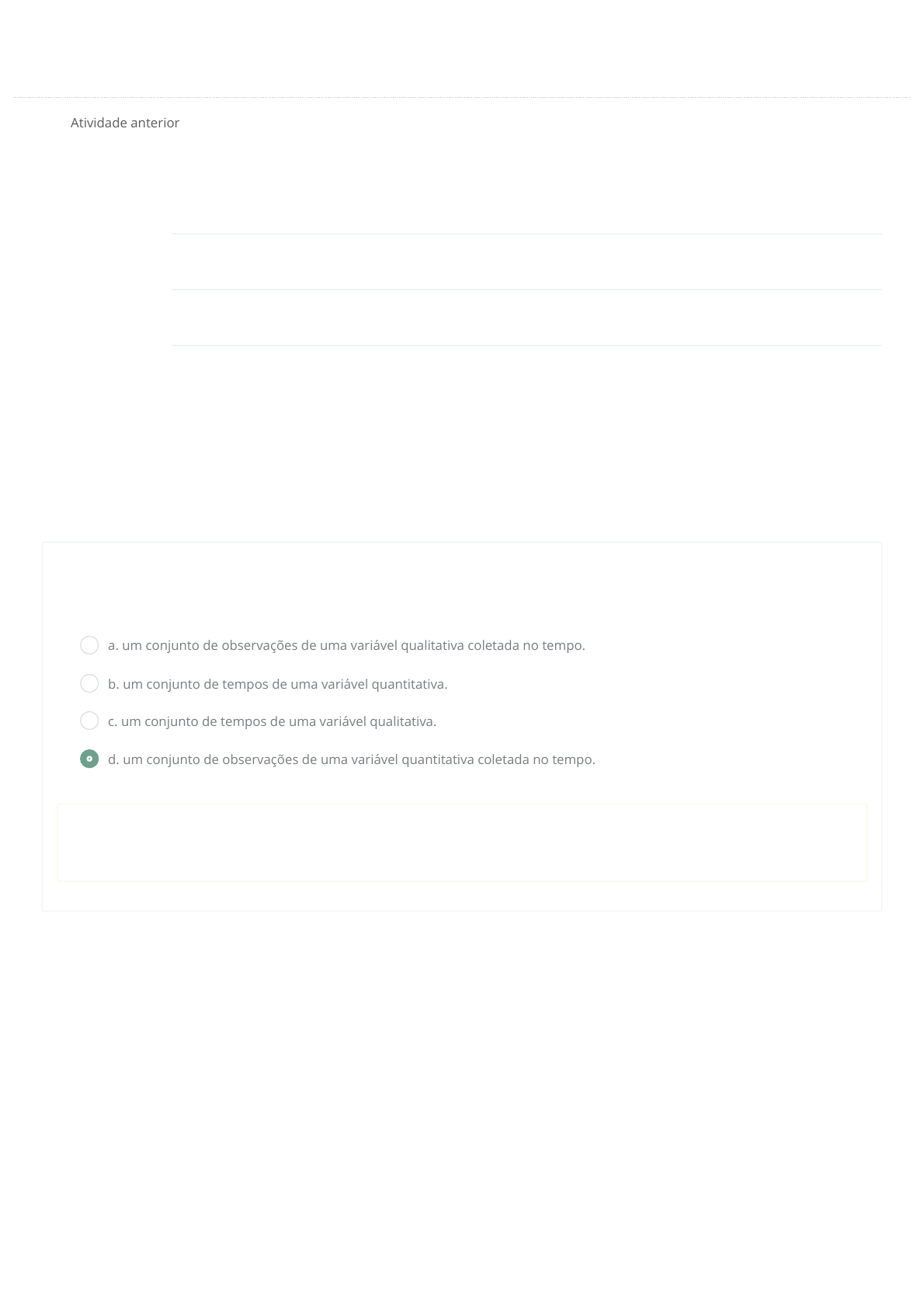 / MÉTODOS QUANTITATIVOS APLICADOS A NEGÓCIOS Atividade anterior Iniciado em segunda, 14 Dez 2020, 07:38 Estado Finalizada Concluída em segunda, 14 Dez 2020, 07:44 Avaliar 9,0 de um máximo de 10,0(90%) Questão 1 Correto Uma série temporal é Escolha uma opção: Sua resposta está correta. A resposta correta é: um conjunto de observações de uma variável quantitativa coletada no tempo.. a. um conjunto de observações de uma variável qualitativa coletada no tempo. b. um conjunto de tempos de uma variável quantitativa. c. um conjunto de tempos de uma variável qualitativa. S d. um conjunto de observações de uma variável quantitativa coletada no tempo. https://aula.fael.edu.br/mod/quiz/view.php?id=3328&forceview=1 / Questão 2 Correto Um exemplo de variável contínua é Escolha uma opção: Sua resposta está correta. A resposta correta é: o total de salários pagos aos funcionários de uma empresa num certo mês.. Questão 3 Correto Uma pesquisa de mercado realizada com pessoas acima de 20 anos de idade e que haviam viajado a lazer nos últimos três anos tinha por objetivo veri�car a proporção de interessados em conhecer e frequentar determinado complexo turístico. Os resultados indicaram uma proporção de 58,2% de entrevistados com interesse em conhecer e frequentar o complexo turístico pesquisado. Nesse estudo foram entrevistadas 2 000 pessoas, considerando um nível de con�ança de 95% e um erro de precisão de 2,4%. Baseado nessas informações, qual das a�rmativas abaixo está correta? Escolha uma opção: Sua resposta está correta. A resposta correta é: Num cenário otimista, 60,6% das pessoas da população frequentariam o complexo turístico.. S a. o total de salários pagos aos funcionários de uma empresa num certo mês. b. o número de inadimplentes de uma loja de equipamentos eletrônicos num determinado mês. c. o número de ações negociadas na bolsa de valores de uma determinada empresa num certo dia. d. o total de funcionários de uma empresa que possuem nível superior completo. a. Num cenário otimista, 95% da população frequentaria o complexo turístico. b. Num cenário otimista, 58,2% das pessoas da população frequentariam o complexo turístico. c. Num cenário otimista, mais de 70% das pessoas de toda a população frequentariam o complexo turístico. S d. Num cenário otimista, 60,6% das pessoas da população frequentariam o complexo turístico. / Questão 4 Correto Qual dos processos abaixo não serve para propósitos inferenciais, isto é, não é um processo considerado cientí�co? Escolha uma opção: Sua resposta está correta. A resposta correta é: Amostragem por cotas.. Questão 5 Incorreto A tabela abaixo apresenta os valores de um determinado produto em 10 lojas pesquisadas. Qual o preço médio encontrado para o produto na amostra pesquisada? Escolha uma opção: Sua resposta está incorreta. A resposta correta é: R$39,70.. S a. Amostragem por cotas. b. Amostragem estrati�cada proporcional. c. Amostragem aleatória simples. d. Amostragem sistemática. a. R$40,00. N b. R$37,90. c. R$39,70. d. R$43,20. / Questão 6 Correto As observações de uma série temporal são melhor representadas por Escolha uma opção: Sua resposta está correta. A resposta correta é: um grá�co de linhas.. Questão 7 Correto Que opção abaixo não corresponde a um critério de escolha da melhor ação a ser tomada em um problema de decisão? Escolha uma opção: Sua resposta está correta. A resposta correta é: Critério minimax de ganho.. a. um grá�co de setores. b. um grá�co de colunas. c. um histograma. S d. um grá�co de linhas. a. Critério minimax da perda. b. Ganho esperado sob incerteza. c. Perda esperada de oportunidade. S d. Critério minimax de ganho. / Questão 8 Correto Uma empresa de marketing vai fazer uma pesquisa com 1 200 pessoas de um município. Que tipo de trabalho realizará? Escolha uma opção: Sua resposta está correta. A resposta correta é: Uma amostragem.. Questão 9 Correto Erro estatístico é Escolha uma opção: Sua resposta está correta. A resposta correta é: a probabilidade de amostra escolhida não representar a população.. a. Um censo. b. Uma reportagem. S c. Uma amostragem. d. Uma sondagem. a. fazer uma amostragem no lugar de um censo. S b. a probabilidade de amostra escolhida não representar a população. c. a diferença entre o valor da medida na população e na amostra. d. escolher o tipo errado de amostragem. / Questão 10 Correto Um teste aplicado a um conjunto de candidatos a empregos numa indústria apresentou média de 163 pontos com desvio-padrão de 75 pontos. A empresa pretende contratar os 10% de candidatos com maiores escores. Qual a nota mínima que o candidato precisa obter para ser aprovado? Sugestão: aplicação da tabela dos valores para a normal padronizada. Escolha uma opção: Sua resposta está correta. A resposta correta é: 260.. a. 196. b. 287. c. 164. S d. 260.