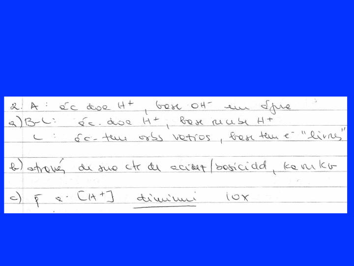 1. a) defina ácidos e bases de Arrhenius, de Brønsted-Lowry e de Lewis. b) como se tem noção da força de um ácido ou de uma base? c) o quê significa na concentração de ácido em uma solução o aumento de uma unidade no pH desta solução? PAGQuímica – Equilíbrio Ácido-Base 2. a) Na temperatura do corpo humano (37o C), o produto iônico da água é 2,5 x 10-14. A água de pH = 7 nesta temperatura será ácida, neutra ou alcalina? Justifique. b) na preparação do TNT (trinitrotolueno), a primeira etapa é a formação do íon nitrônio (NO2+), através das seguintes reações: (1) H2SO4 + HNO3 HSO4- + H2NO3+ (2) H2NO3+ H2O + NO2+ Identifique na reação (1) os pares ácido-base conjugados. Por que o HNO3 se comporta desta maneira? PAGQuímica – Equilíbrio Ácido-Base PAGQuímica – Equilíbrio Ácido-Base 3. Considere as seguintes bases, todas muito fortes: t-butóxido (t-BuO-) e ânion butila (Bu-): a) escreva as equações que descrevem o que acontece ao colocarmos t-butóxido de potássio (K+tBuO-) e butil-lítio (BuLi) em água e em metanol. (Assuma que os compostos são totalmente solúveis nos solventes dados. O hidrogênio ácido do metanol é o da função álcool) b) se as bases dadas são muito fortes, as reações anteriores são completas. Quais são então as bases mais fortes possíveis de serem encontradas em água e em solução metanólica, qualquer que seja a base adicionada? (este é o chamado efeito nivelador do solvente) PAGQuímica – Equilíbrio Ácido-Base PAGQuímica – Equilíbrio Ácido-Base 4. Peixes são organismos sensíveis a variações bruscas de temperatura e pH. a) uma variação de somente meia unidade de pH pode ser desprezada? Explique. b) mediu-se o pH da água de um aquário e verificou-se que seu valor era 7. Isto quer dizer obrigatoriamente que [H+] = [OH-]? Explique. PAGQuímica – Equilíbrio Ácido-Base 7. Explique: a) por quê soluções de ácidos fracos têm maiores valores de pH que soluções de ácidos fortes para a mesma concentração. b) como os valores de Ka podem predizer a força relativa de dois ácidos. a) af: libera menos H+ que AF pH = -log[H3O+], varia de maneira inversa b) quanto maior for Ka, mais forte é o ácido PAGQuímica – Equilíbrio Ácido-Base 12. A seguir são apresentadas algumas afirmações. Classifique-as como verdadeiras ou falsas. No caso de afirmações falsas, reescreva-as, corrigindo o que for necessário. a) ácidos de Lewis são moléculas ou íons que têm excesso de elétrons. b) para aumentar o pH de uma solução de 6 para 8 é necessário aumentar a concentração de OH- em duas vezes. PAGQuímica – Equilíbrio Ácido-Base c) sabendo que o produto iônico da água a 75o C é 1,7 x 10-13, pode-se afirmar que a água pura, nesta temperatura apresenta pH = pOH. d) ácidos de Brønsted-Lowry são moléculas ou íons que têm excesso de elétrons. e) quando se misturam volumes iguais de soluções de mesma concentração de NaOH e de um ácido monoprótico, a solução obtida é sempre neutra. f) uma solução de ácido forte de concentração 1 x 10-9 mol/L apresenta pH = 9. PAGQuímica – Equilíbrio Ácido-Base c) d) e) f) PAGQuímica – Equilíbrio Ácido-Base g) uma solução de ácido forte de concentração 1 x 10-8 mol/L apresenta pH = 8. h) quando se misturam volumes iguais de soluções de mesma concentração de NaOH e de um ácido monoprótico, a solução obtida é sempre alcalina. PAGQuímica – Equilíbrio Ácido-Base g) h) i) em uma solução aquosa de cátions cujos sulfetos sejam pouco solúveis, a adição de sulfeto fará sempre com que haja a precipitação daquele com menor valor de Kps. j) o ácido conjugado de HPO42- é PO43-. k) a teoria de Brønsted-Lowry pode ser aplicada a qualquer solvente. l) H2O é um ácido mais forte que H3BO3. m) para um solvente qualquer HE, sua reação de autoionização é 2 HE H2E+ + E-. PAGQuímica – Equilíbrio Ácido-Base i) j) k) l) m) n) uma solução de pH = 7 pode ser ácida. o) o ácido conjugado de NH3 é NH4+. p) um ácido com pKa = 12 é muito forte. q) a soma de pH com pOH é sempre 14. r) sabendo que o produto iônico da água a 75o C é 1,7 x 10-13, pode-se afirmar que a água pura, nesta temperatura apresenta pH menor do que 7. PAGQuímica – Equilíbrio Ácido-Base o) n) p) q) r) s) para aumentar o pH de uma solução de 6 para 8 é necessário aumentar a concentração de H+ em duas vezes. t) sabendo que o produto iônico da água a 75o C é 1,7 x 10-13, pode-se afirmar que a água pura, nesta temperatura apresenta pH maior do que 7. u) por ser uma base muito fraca, o KOH praticamente não altera o pH da água. PAGQuímica – Equilíbrio Ácido-Base s) t) u) r) v) bases de Lewis são moléculas ou íons que têm deficiência de elétrons. w) para aumentar o pH de uma solução de 4 para 8 é necessário aumentar a concentração de H+ em duas vezes. PAGQuímica – Equilíbrio Ácido-Base v) w) 13. Qual o pH resultante das seguintes soluções aquosas (apresente os equilíbrios envolvidos e indique os cálculos realizados): 13. Qual o pH resultante das seguintes soluções aquosas (apresente os equilíbrios envolvidos e indique os cálculos realizados): PAGQuímica – Equilíbrio Ácido-Base a) HClO4 1,005 g/L b) H3BO3 1,0 x 10-3 mol/L PAGQuímica – Equilíbrio Ácido-Base c) solução saturada de Co(OH)2 PAGQuímica – Equilíbrio Ácido-Base d) HF 0,1 mol/L + HCl 1,0 x 10-3 mol/L PAGQuímica – Equilíbrio Ácido-Base e) HIO3 0,1 mol/L + HI 1,0 10-3 mol/L PAGQuímica – Equilíbrio Ácido-Base f) HF 0,10 mol/L + HCl 0,01 mol/L PAGQuímica – Equilíbrio Ácido-Base g) HBrO 0,5 mol/L + HBr 10-4 mol/L PAGQuímica – Equilíbrio Ácido-Base h) HNO2 1,0 mol/L + HBr 0,01 mol/L PAGQuímica – Equilíbrio Ácido-Base