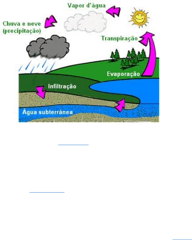 O ciclo da água é o permanente processo de transformação da água na natureza, passando de um estado para outro (líquido, sólido ou gasoso). A essa transformação e circulação da água dá-se o nome de ciclo da água ou ciclo hidrológico, que se desenvolve através dos processos de evaporação, condensação, precipitação, infiltração e transpiração. A água, indispensável para a manutenção da vida, é encontrada na natureza e está distribuída nos rios, lagos, mares, oceanos e em camadas subterrâneas do solo ou em geleiras. O ciclo da água na natureza é fundamental para a manutenção da vida no planeta Terra, visto que vai determinar a variação climática e interferir no nível dos rios, lagos, mares, oceanos. Ciclo da Água na Natureza O ciclo da água é composto de cinco etapas: Ciclo da Água 1. O calor irradiado pelo sol aquece a água dos rios, lagos, mares e oceanos ocorrendo o fenômeno da Evaporação. Nesse momento, ocorre a transformação do estado líquido da água para o seu estado gasoso, à medida que se desloca da superfície da Terra para a atmosfera. 2. O vapor da água esfria, se acumula na atmosfera e se condensa na forma de gotículas, que formarão as nuvens ou nevoeiros. Neste momento, ocorre o processo de Condensação, ou seja, a transformação do estado gasoso da água para seu estado líquido, sendo as nuvens, as gotículas de água líquida suspensas no ar. 3. Com muita água condensada na atmosfera, se inicia o processo de Precipitação, onde as gotículas suspensas no ar se tornam pesadas e caem no solo na forma de chuva. Em regiões muito frias a água condensada passa do estado gasoso para o líquido e rapidamente para o estado sólido, formando a neve ou o granizo. 4. Quando o vapor de água condensado cai sobre a superfície terrestre, ocorre a Infiltração de uma parte dessa água que vai alimentar os lençóis subterrâneos. 5. Parte da água que se infiltrou no solo pode ser absorvida pelas plantas que, depois de utilizá-la a devolvem à atmosfera por meio do processo de Transpiração. A água também pode evaporar ou escoar sobre o solo e abastecer os rios, que deságuam em mares e oceanos, reiniciando todo o processo do ciclo da água. Para saber mais: Estados Físicos da Água e A Importância da Água Etapas do ciclo da água O ciclo da água é caracterizado pelo movimento contínuo de água entre a atmosfera e a superfície terrestre. Para que o ciclo hidrológico ocorra uma série de etapas acontecem com o auxílio do calor do sol, principal fonte de energia, e da força da gravidade. Evaporação A primeira etapa do ciclo da água é a evaporação. Nela, a água muda do estado líquido para o gasoso. A água da hidrosfera, sendo os oceanos a principal fonte, passa para a atmosfera ao absorver energia térmica proveniente do sol e mudar para o estado gasoso, sendo a principal fonte de umidade na atmosfera. A evaporação da água é influenciada pela temperatura e radiação solar, que é lançada para atmosfera ao atingir energia cinética suficiente. Sublimação A água no estado sólido também pode ser transferida para atmosfera na forma de vapor, sem passar pelo estado líquido, e esse processo recebe o nome de sublimação. Vale lembrar que a sublimação ocorre de maneira muito mais lenta que a evaporação e geleiras no Polo Norte e Polo Sul são algumas das principais fontes de água em que ocorre esse fenômeno. Condensação Quando o vapor d’água chega à atmosfera ocorre a condensação, ou seja, retorno para o estado líquido. A formação das nuvens ocorre pela aproximação das gotículas de água, pois em elevadas altitudes a temperatura é menor. Além disso, as gotículas são tão pequenas que conseguem flutuar no ar e formam a neblina. As nuvens são o principal meio para a água retornar para a superfície terrestre. Quando as gotas de água se juntam, tornando-se maiores e mais pesadas, elas caem como chuva. Precipitação A precipitação e a liberação de água pela as nuvens, mais conhecida como chuva. Os vapores de água condensados na atmosfera retornam para a Terra pelas mudanças de temperatura e ação do vento. Quando a chuva cai, a água pode seguir diferentes caminhos dependendo de onde ocorreu a precipitação. Ela cai diretamente nos recursos hídricos, infiltra-se no solo e em fendas de rochas, pode ser absorvida pelas plantas, entre outros. Além da chuva, a água também pode chegar a superfície da Terra na forma de neve ou granizo. A água percorre o solo em um processo chamado de escoamento. Infiltração Quando a água que cai no solo não escoa para algum corpo d'água ela pode ser absorvida pelo solo. Os lençóis freáticos, reservatórios subterrâneos de água, são formados pela infiltração no solo acima de camadas rochosas profundas que não permitem a passagem de água. Transpiração A água absorvida pelo solo é aproveitada pelas plantas entrando pelas raízes. Assim como a evaporação, a transpiração é a transformação de água líquida em vapor d’água e também participa da umidade do ar. A água sai das plantas pelas folhas, que possuem aberturas muito pequenas e liberam a água excedente, já que é nessa parte da planta que a água é direcionada para participar da fotossíntese. A combinação das etapas de evaporação e transpiração recebe o nome de evapotranspiração e é responsável pelo movimento de água superficial para a atmosfera.